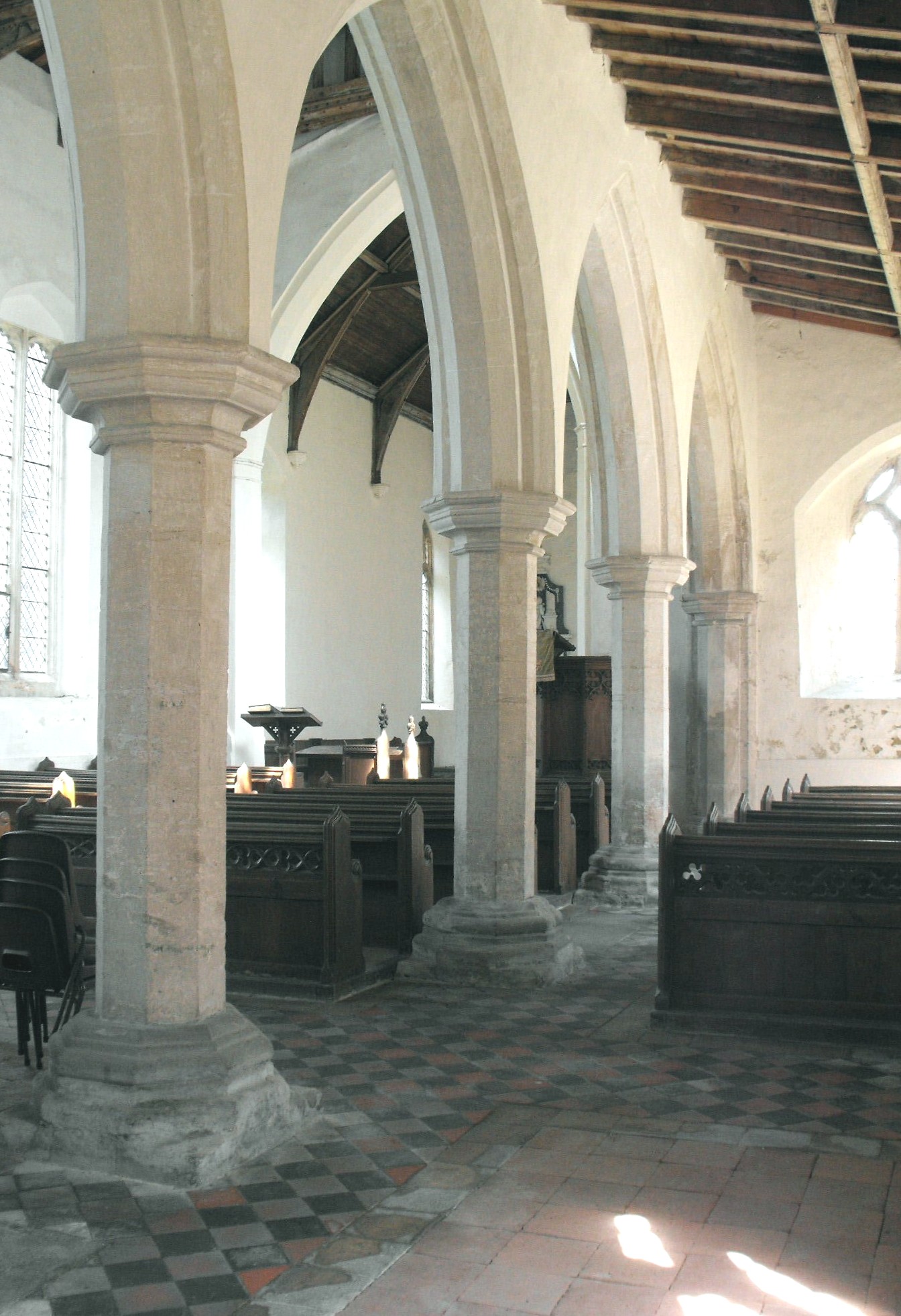 Inside the building, the four-bay S. arcade (seen below left, viewed from the southwest) returns us to the early fourteenth century: the piers and the arches are of standard design except in one particular, the latter being double-flat-chamfered, and the former, octagonal, but more than usually narrow, with capitals still more prominent than is generally the case at this period, due chiefly to the large abaci. The very different tower arch (below right) reinforces the impression that it is unlikely to be precisely contemporary: the arch carries a flat chamfer on the outer order and a sunk chamfer on the inner order, and the shafts attached to the responds are semicircular. (Pevsner described these as octagonal, a mistake that is repeated on the britishlistedbuildings web-site. They are not.) Since it is impossible from its position that it should predate the aisle, the implication must be that it postdates it. The chancel arch carries a single flat chamfer above semi-polygonal responds with the only slightest of capitals.