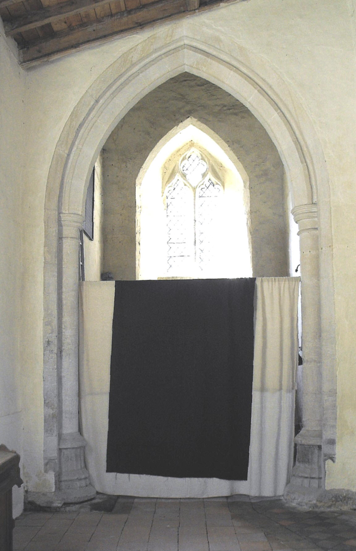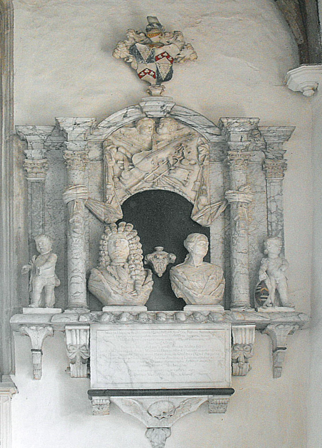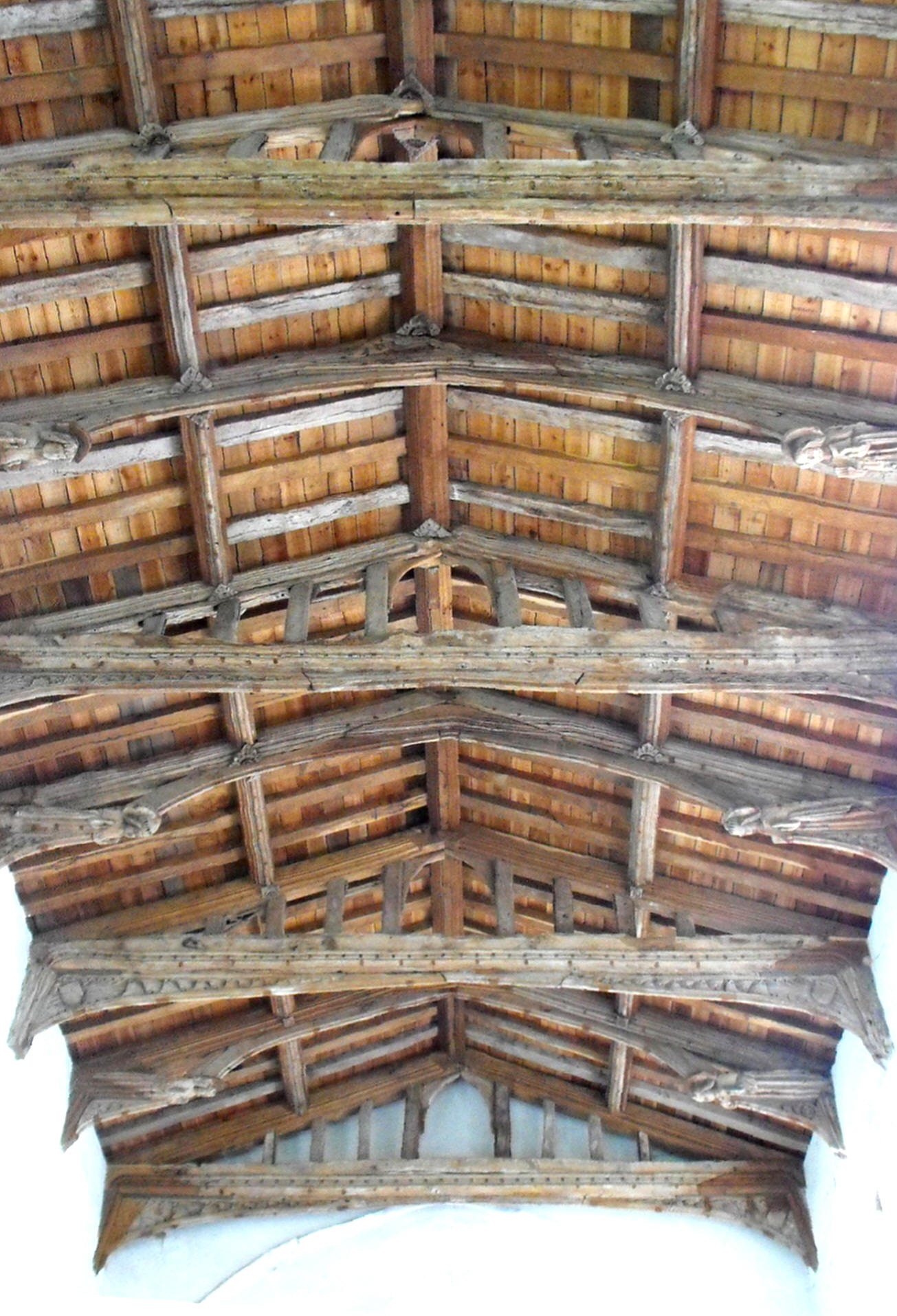 For obvious and understandable reasons, few redundant churches retain much in the way of fittings, but the shallow-pitched nave roof is a fine piece of carpentry (as seen below left), with bays divided by tie beams each supporting four pairs of queen posts, and false hammerbeam trusses at the half bays with carved figures (saints, perhaps, but pace Pevsner, probably not angels) that have survived the assaults of the iconoclasts. The only monument of significance (below right), set against the E. wall of the aisle, commemorates Jermyn Wyche and Maria Hungerford (both d. 1719) and is signed by Robert Singleton of Bury St. Edmunds (fl. 1706-40), who was described by Rupert Gunnis as taking 'high rank' as a monumental sculptor (Dictionary of British Sculptors, 1660-1851, London, The Abbey Library, 1951, p. 353). This work, however, is of such extraordinary incompetence as to suggest it may be a composite, formed of fragments originally intended for different positions and not quite in scale with one another.