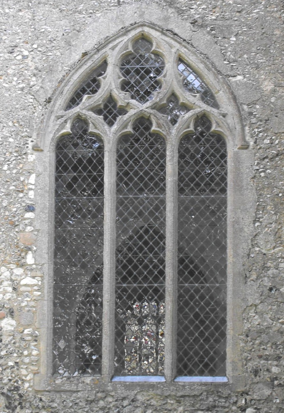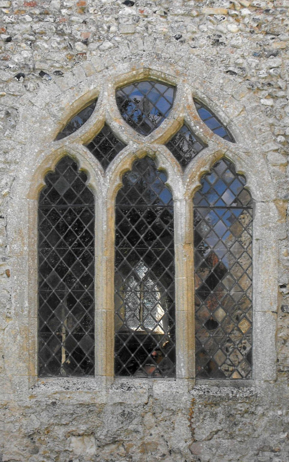 Now in the care of The Churches Conservation Trust, this is essentially an early fourteenth century building formed of a chancel, a nave with a S. aisle and porch, and a tall southwest tower that communicates with the aisle. Surviving contemporary windows include, in particular, the two similar but far from identical ones in the W. wall of the nave (illustrated below left) and the E. wall of the aisle (below right), with tracery composed of intersecting ogees akin to the standard one at St. Mary Magdalene's, Madingley (Cambridgeshire), but with trefoil-cusped lights in the former case and with no cusping at all above the lights in the latter. In both cases, the date must be c. 1340, yet presumably they represent separate phases of construction or, at the least, the work of different masons. Other windows in Decorated style comprise one with two-lights and pinched reticulated tracery in the S. wall of the aisle, another with reticulated tracery of normal dimensions in the W. wall of the tower, and the similar, two-light bell-openings, of which those on the north side are blocked. The chancel and nave windows, and the remaining S. aisle window, are restored or renewed Perpendicular work, while the clerestory (which is present on the S. side only) represents a late fifteenth or early sixteenth century heightening of the building, which saw the introduction of the splendid nave roof. The two massive brick buttresses supporting the north wall of the nave, sloping all the way from the ground to the eaves, are clumsy additions probably dating from the restoration of the building in 1857 (Nikolaus Pevsner & Bill Wilson, The Buildings of England: Northwest & South Norfolk, New Haven & London, Yale university Press, 1999, p. 410). The tower is supported by angle buttresses and rises to a plain parapet, divided in the course of its ascent, only by a string course beneath the bell-stage. The stair turret is housed in a very large projection to the northeast.