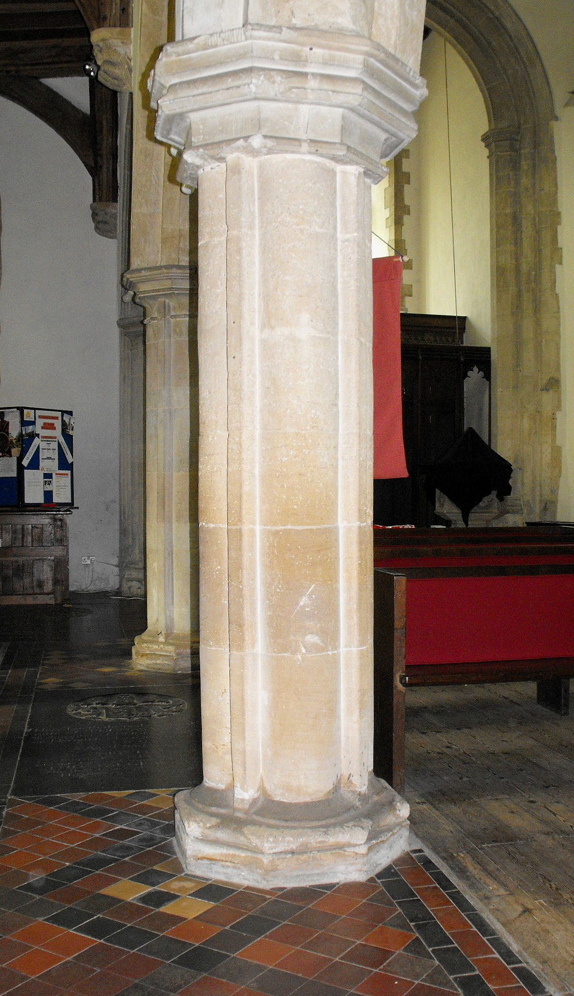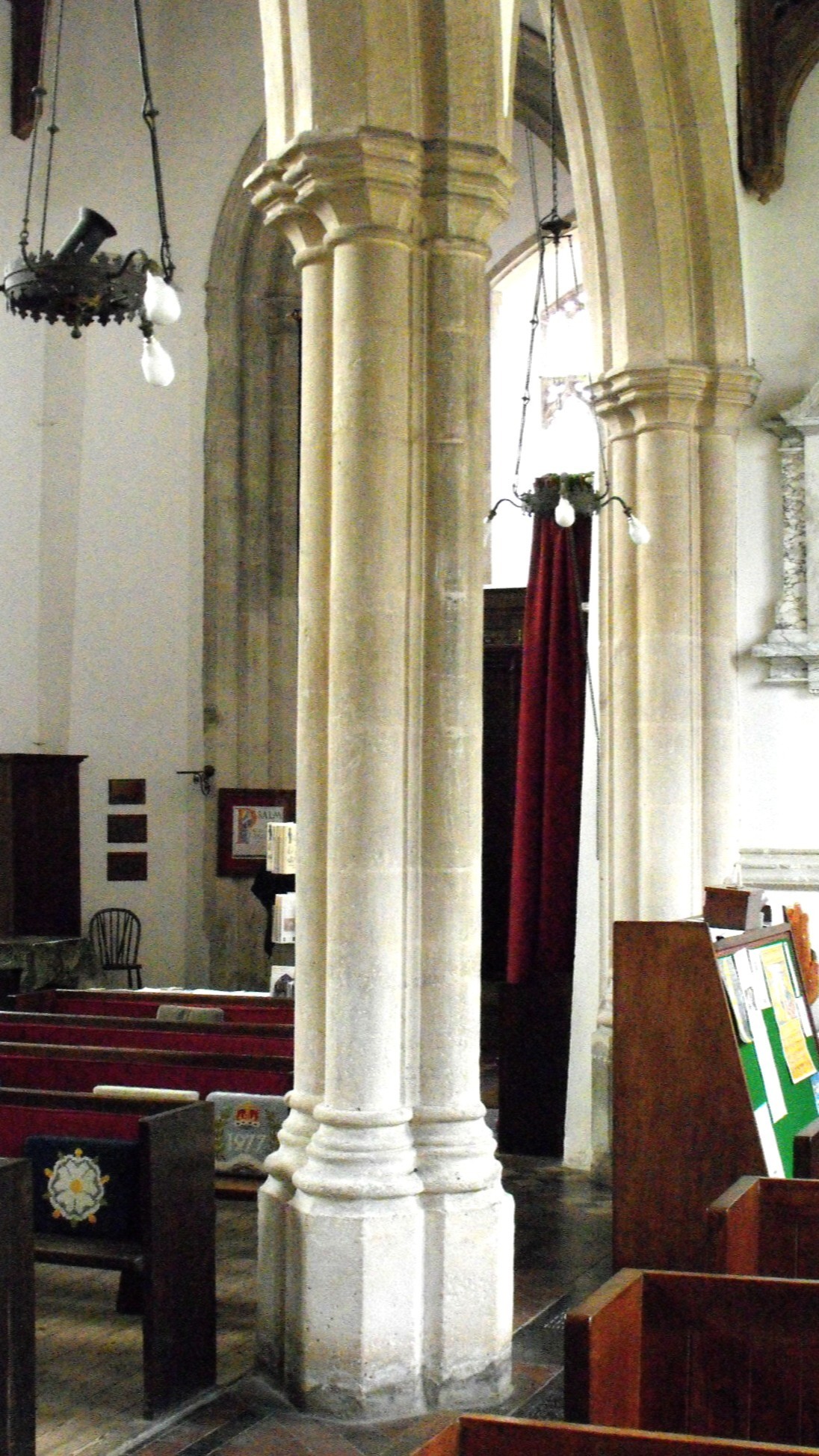 A large church with dramatically dissimilar arcades, perhaps dating from the late fourteenth and mid-fifteenth centuries.