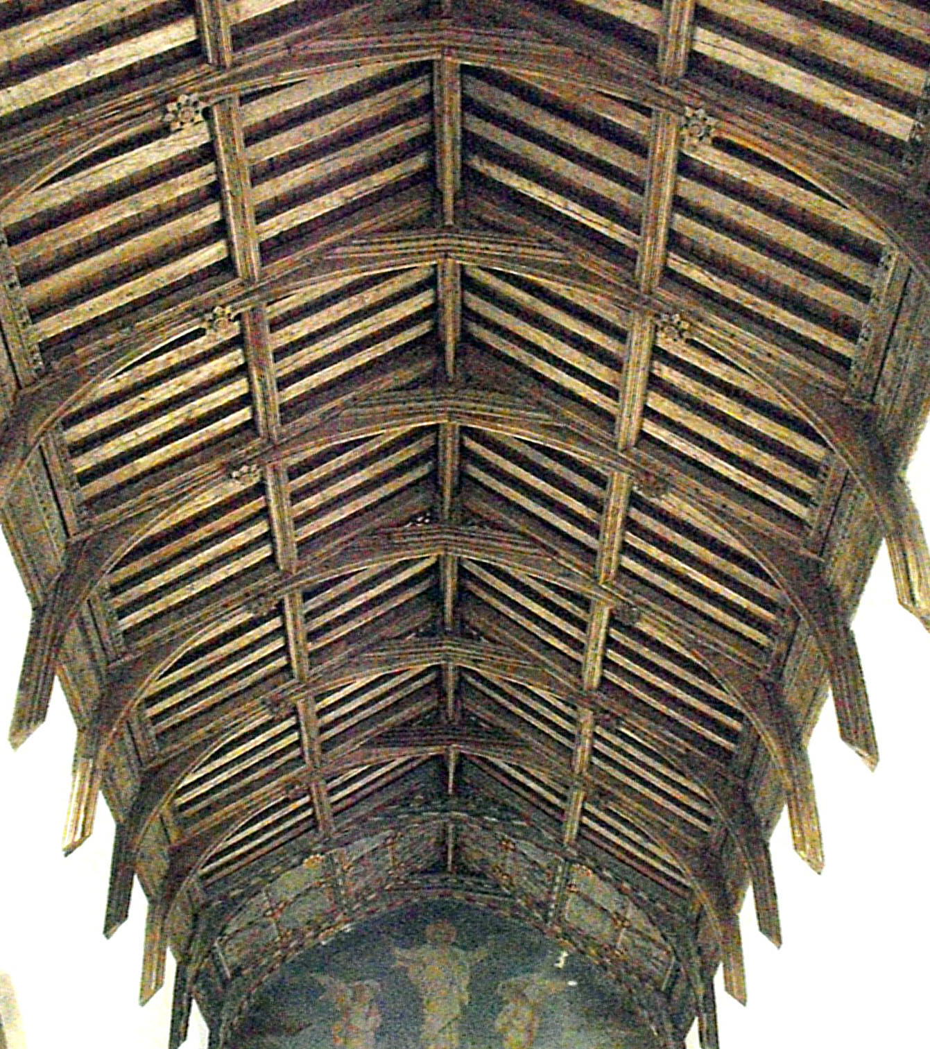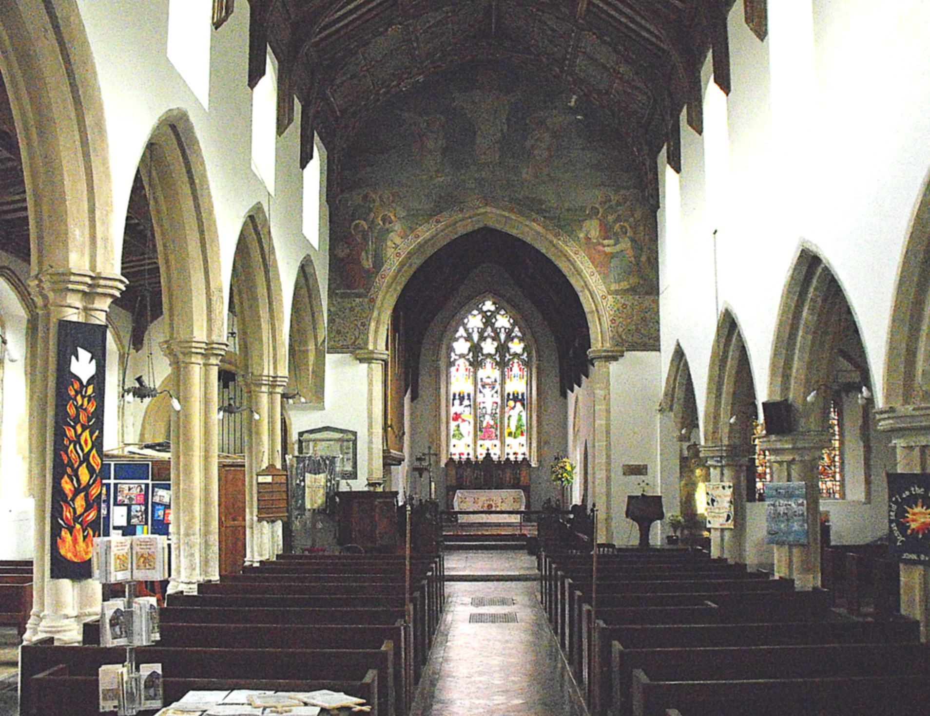 Inside the church, the difference between the arcades in height is little short of dramatic. (See the photograph above left.) The stubby S. arcade is formed of five bays, of which the first is round-arched – a curious feature with no obvious explanation, for it is certainly not Norman unless it has been both re-set and entirely remodelled since it now bears wave mouldings and springs, like the rest of the arcade, from quatrefoil piers and semi-quatrefoil responds with projecting ogee spurs between the foils and prominent octagonal capitals that go all the way round (as shown above right). The four remaining arches are double-flat-chamfered, like the N. arcade opposite, but that is where the similarity ends. The N. arcade consists of four bays in total, which reach from the porch to the chancel and are supported on slender piers, perhaps two-thirds as high again as their counterparts opposite, with whose positions they noticeably fail to correspond. These piers (illustrated below left) have tall bases and are quatrefoil in section with little hollows in between the foils and separate capitals to each. The clerestory windows are perforce of different heights from north to south, but these do correspond with each other otherwise, both in their position and style, and so are no earlier than the later of the two arcades. The chancel arch, which was heightened in 1873, is double-flat-chamfered above semi-octagonal responds with prominent capitals – a form that could date back to the early fourteenth century (Decorated period). The huge painting of Christ in Majesty above, seems entirely Victorian. The chancel has a trefoil-cusped ogee-pointed piscina recessed in the S. wall of the sanctuary, which appears to be old, and there is a blocked, former priest’s doorway in the chancel S. wall; another piscina can be seen recessed in the east end of the S. aisle S. wall. The very tall, heavy tower arch is formed of three orders, of which the inner bears a flat chamfer springing from semi-octagonal responds, and the outer two bear flat chamfers that continue uninterrupted down the jambs. Finally, the furniture is nearly all new but the nave roof (below right) is presumably contemporary with the clerestory and is arched to cambered collars, which are structurally rather weak members sometimes associated with senescent late Perpendicular work.