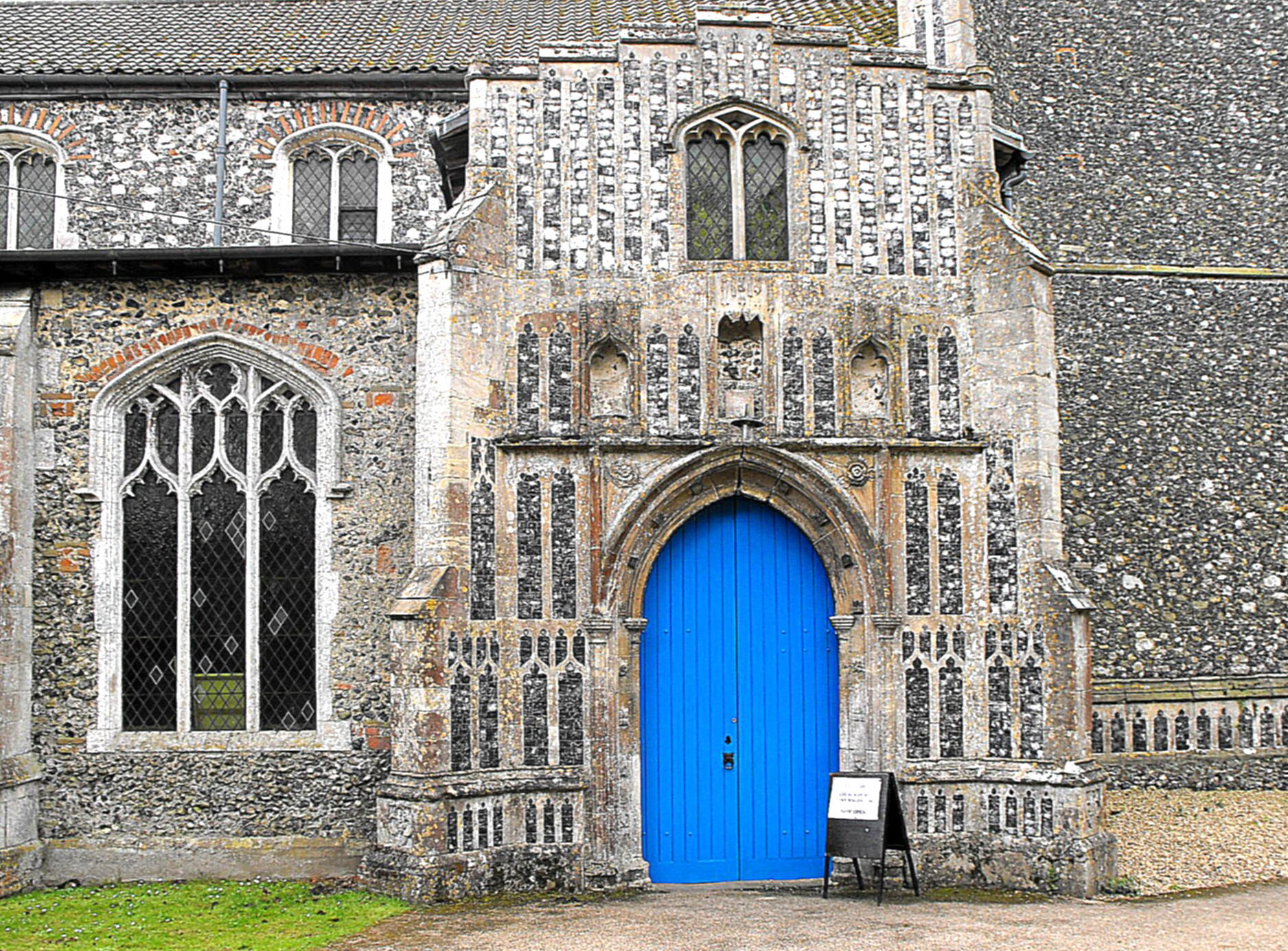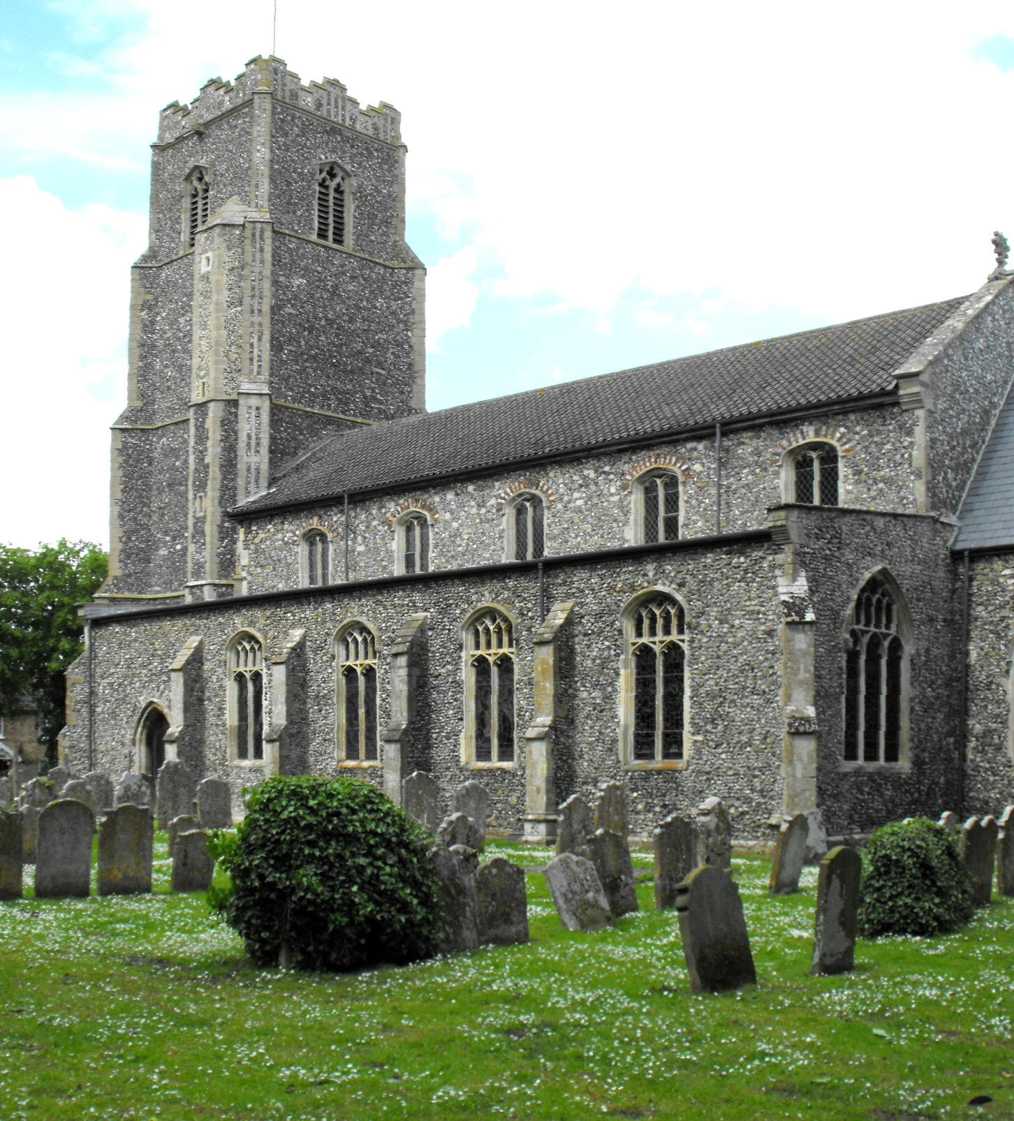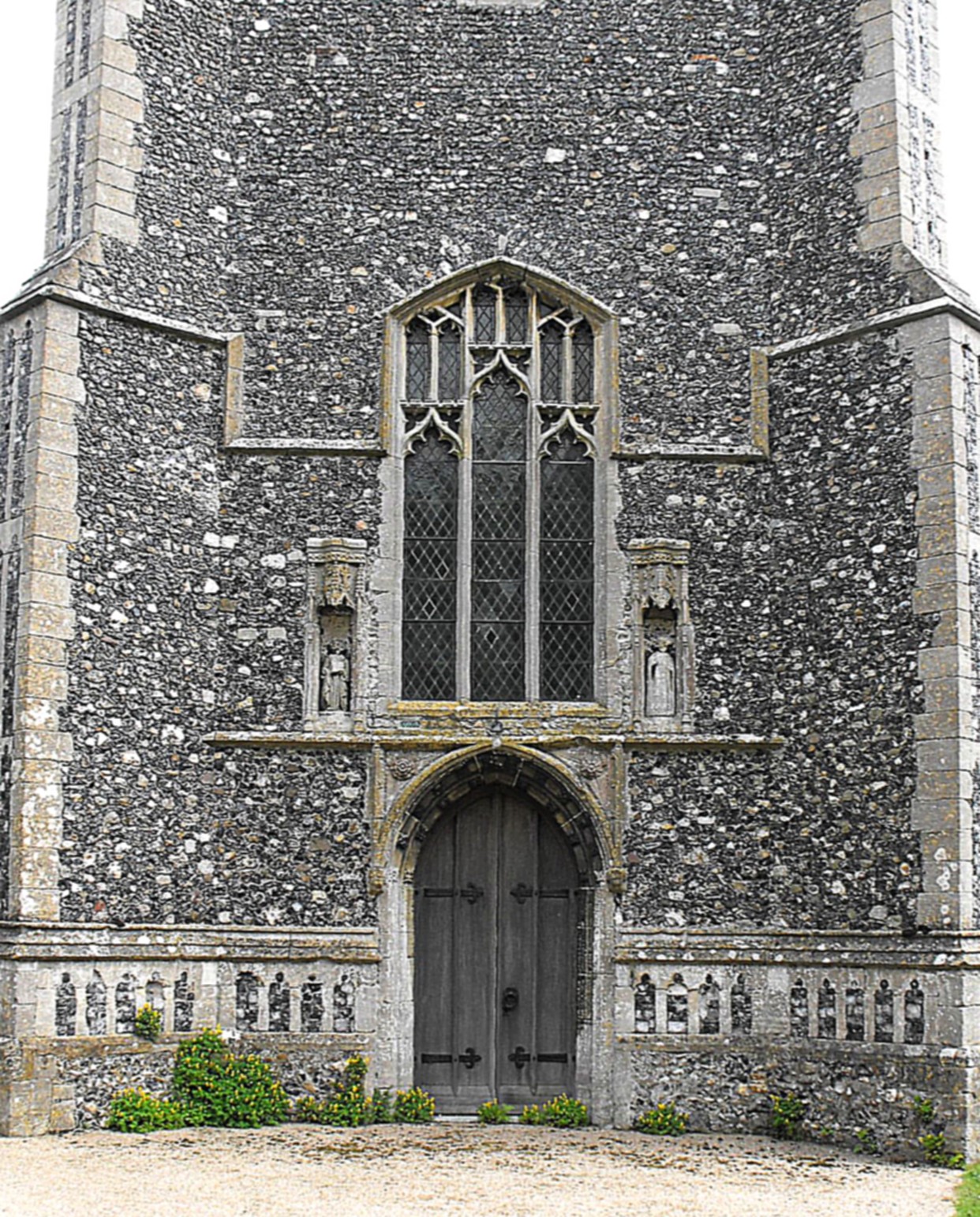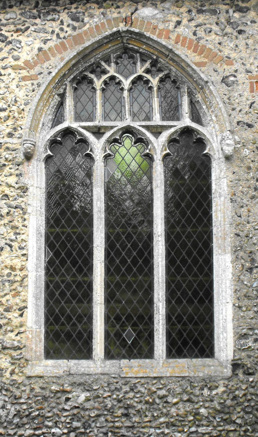 The nave clerestory consists of five pairs of trefoil-cusped Y-traceried windows beneath very depressed four-centred arches, while the two-light S. aisle S. windows are segmental-arched with supertransoms above the lights, split 'Y's in the tracery, and quatrefoils in the apices. (See the photograph of the church viewed from the southeast, at the top of the page on the left.) The S. aisle E. window and the easternmost N. window to the N. aisle (seen above right) (which was probably taken from the E. wall and re-set here when the organ chamber was built) have three lights with supertransoms above joining the apices of lights 1 and 3, and the remaining three windows in the N. aisle N. wall are three-light with strong mullions (mullions that reach all the way from the sills to the window heads with no diminution in thickness at the springing level). The two-storeyed N. porch rises higher than the aisle even though it is flush with it to the north, and is decorated with five tiers of flushwork arches (as shown), of which there is one on the basal frieze, two more beside the doorway, and a further two above. The lower of these includes three niches set within it, the outer two, ogee-pointed, and the central one, canopied, while the upper tier beneath the stepped battlements has at its centre, the two-light window to the porch upper storey.