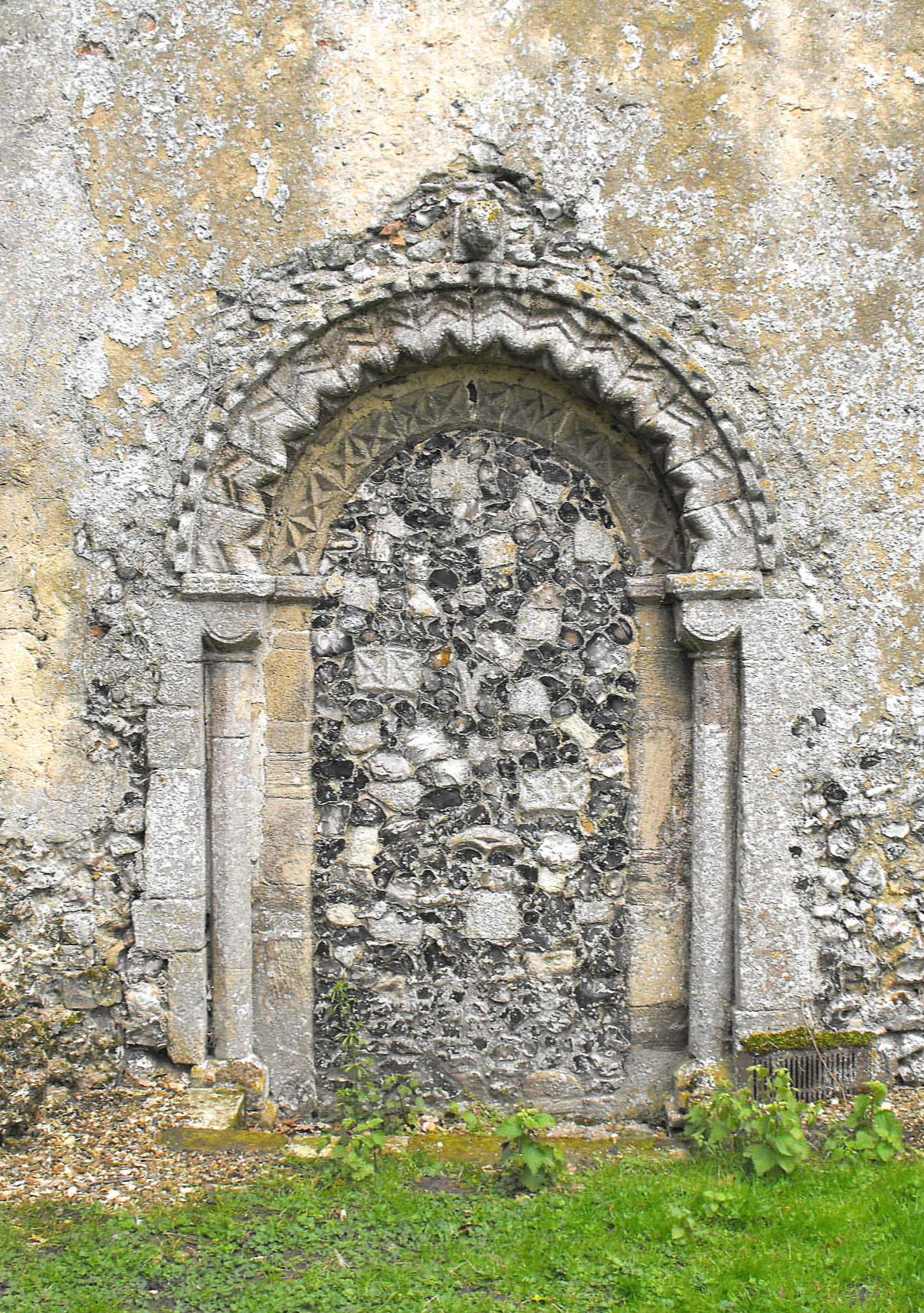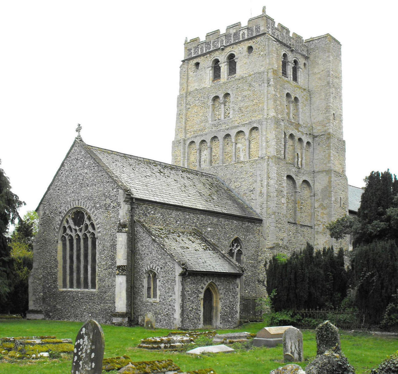 This is an axial church whose principal feature is its massive Norman tower, rising in five unequal stages, supported by diminishing clasping buttresses and decorated on stages two to four with unmoulded, round-headed blank arches, separated in some places by shafts with cushion capitals, all the details of which are suggestive of c. 1100. (See the photograph, left, taken from the northeast.) The bell-openings are similar in form, while the large rectangular projection at the northwest angle, which houses the stair turret, is undecorated and unlit, except by two small slits on the N. side. The flushwork battlements are clearly a Perpendicular addition and the flat-chamfered, round-headed doorway with a missing order of side-shafts, set off-centre in the S. wall, is probably fifty years younger than the main structure and the product of the mid to late twelfth century.