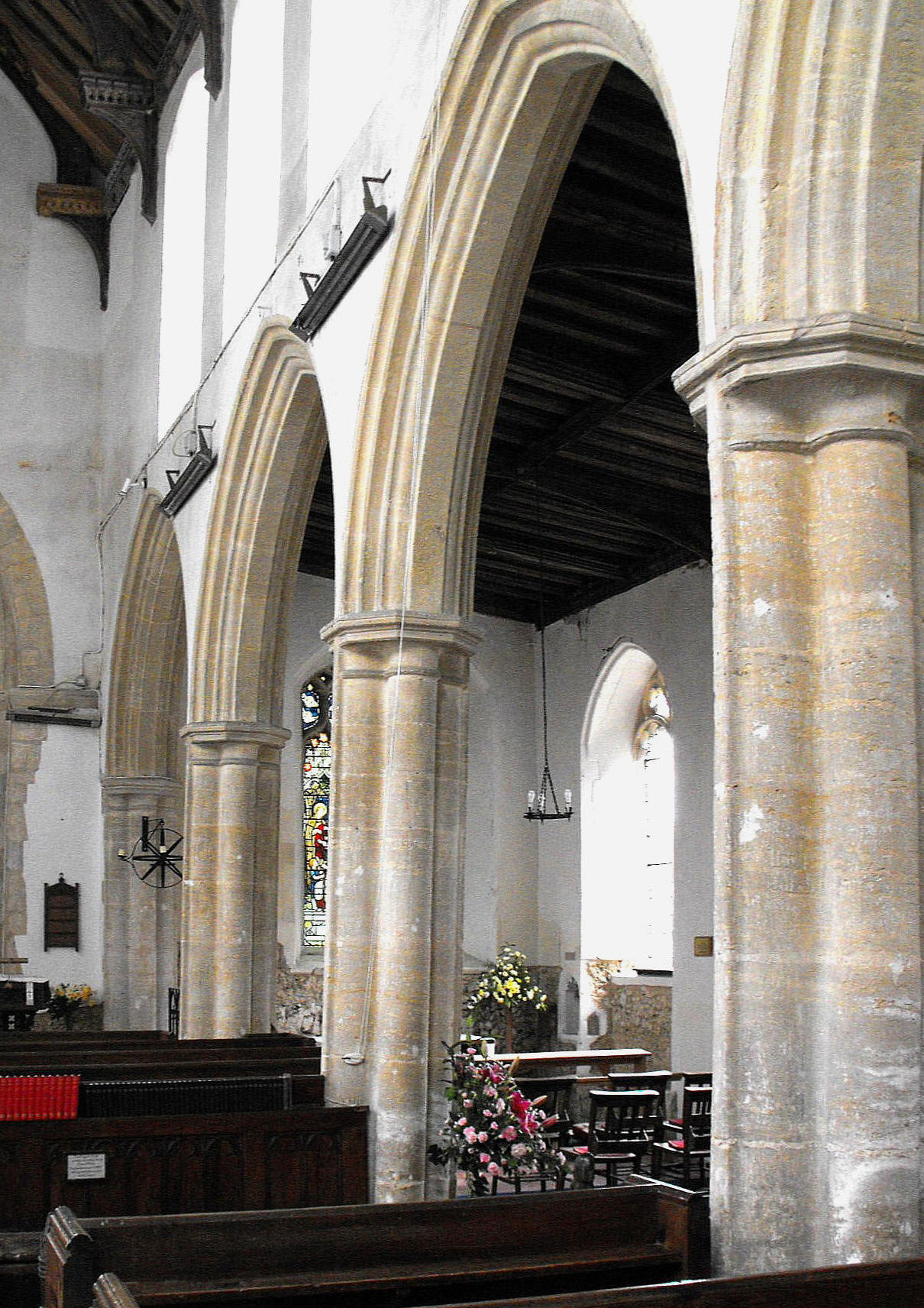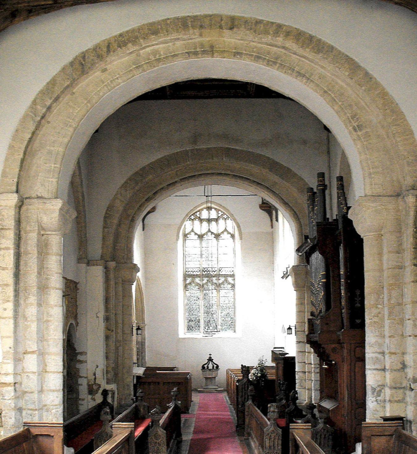 Internally the tower is supported on massive Norman arches to the east and west, each composed of two orders with an unmoulded outer order supported on plain abaci with chamfered under-edges, and an inner order bearing a roll supported on demi-shafts with broad cushion capitals. (See the photograph, right, which looks through to the nave from the chancel.) The remains of the rood stair can be seen to the southeast and there are shallow blank arches recessed in the N. and S. walls, of which the latter is now pierced by a Decorated window.