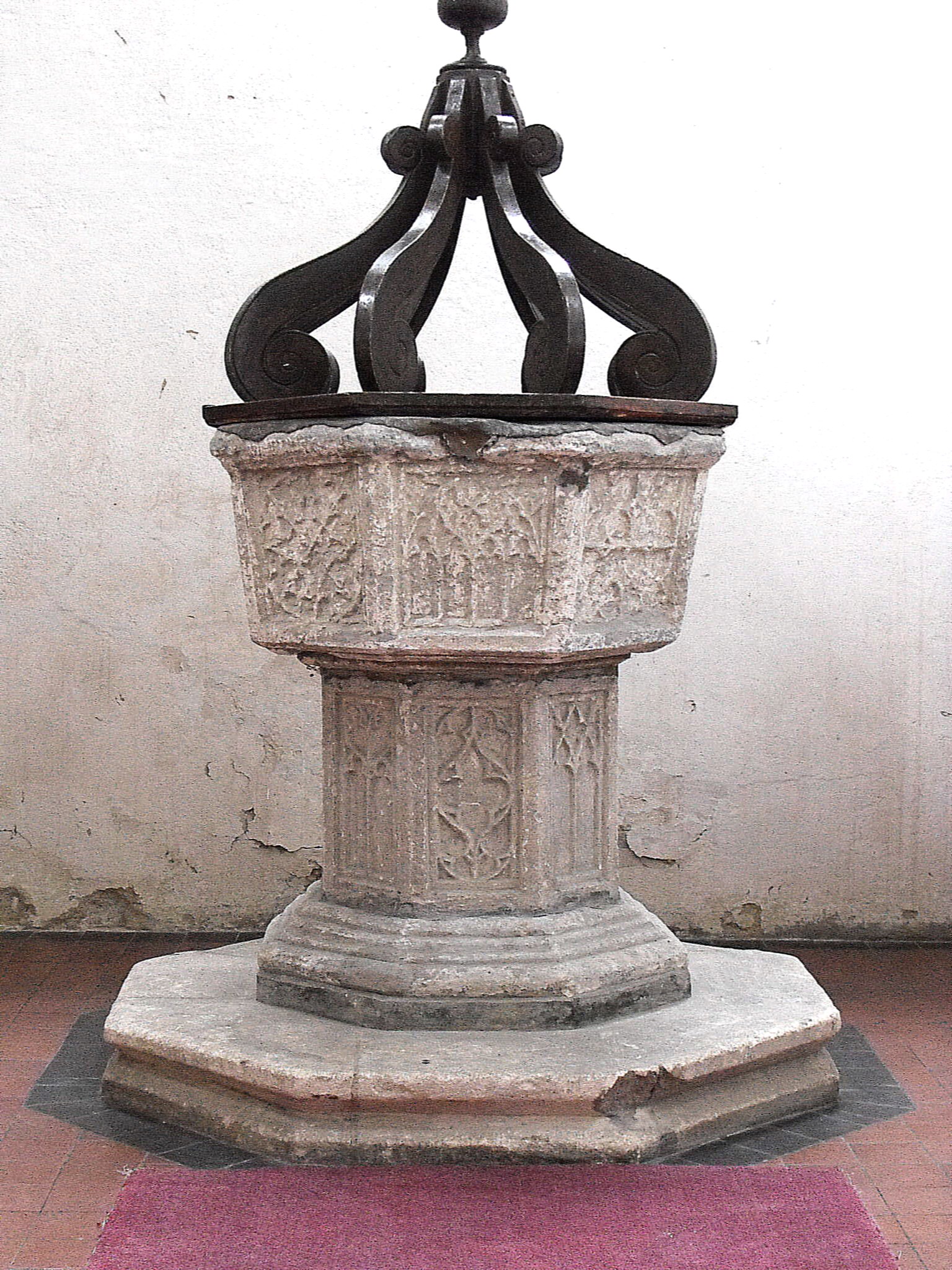 Finally, the church contains little in the way of furnishings but the font (shown right) appears to belong to around the time of the aisle arcade for it consists of a canted octagonal bowl supported on an octagonal stem, decorated alternately with circular and window tracery patterns, displaying a mixture of Decorated and Perpendicular designs. The wooden cover is probably Jacobean.