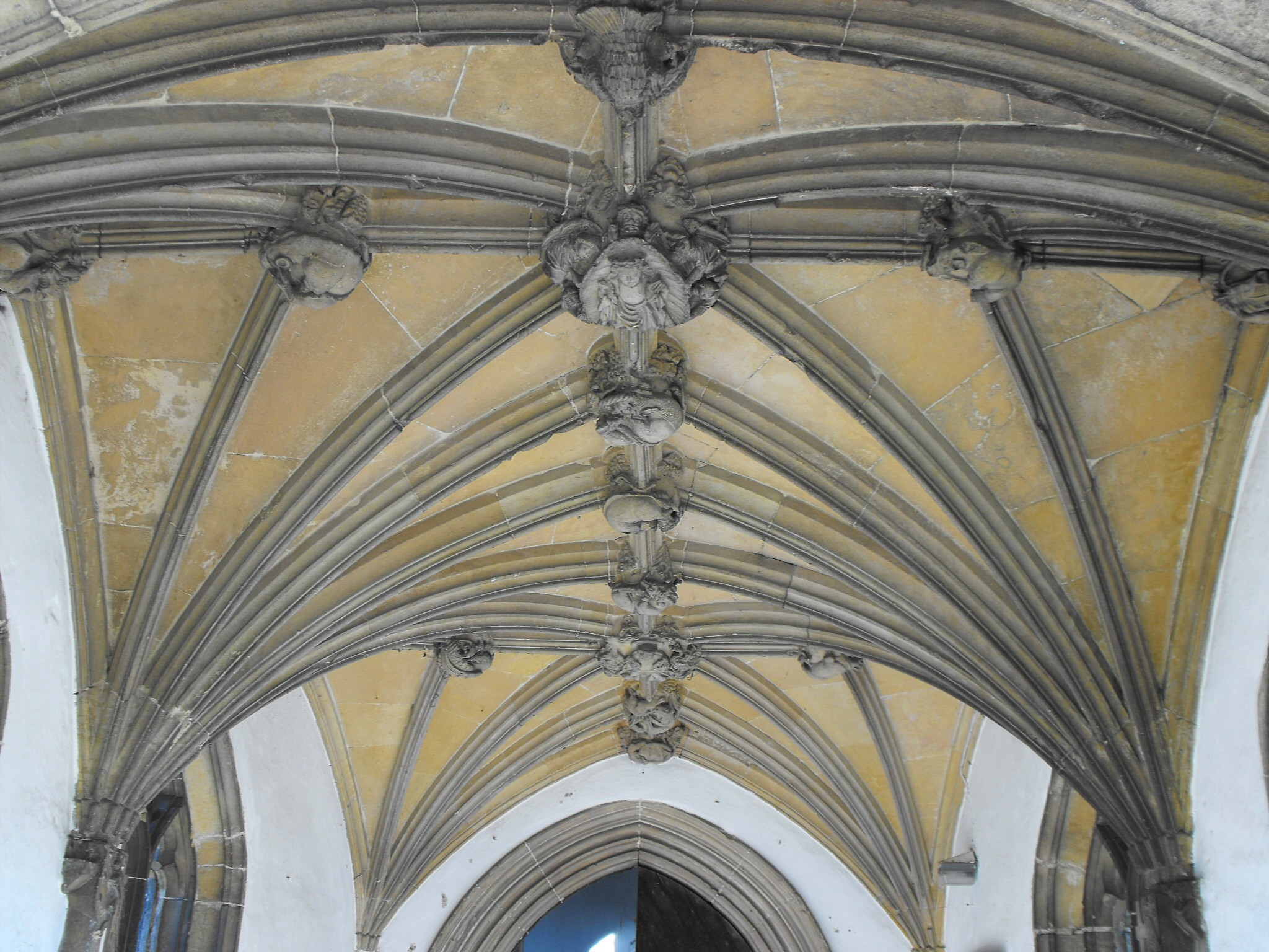The two-storeyed S. porch is another proud piece of work (as shown below left). Here too there are angle buttresses at the corners, pinnacles above, and battlements decorated with the same blank arcading, but here also there are carved niches in the forward edges of the buttresses, a row of cinquefoil-cusped blank arches above the four-centred outer doorway, and an upper-storey S. window with a castellated supertransom above the central light, set between large blank niches with crocketed pinnacles and carved animals supporting the pedestals. Nevertheless, perhaps the most striking conceit is the fact that that the upper storey as well as the lower is lit by side windows in each of its two bays. These are roofed in the lower storey by two square bays of tierceron vaulting (illustrated below right), which can generally be regarded as an earlier stage in the development of the vault, predating the lierne form. The bosses are intricately carved with scenes from the Passion, Assumption, etc. and a menagerie of semi-mythical beasts. The N. porch is a relatively simple affair, just one bay deep.