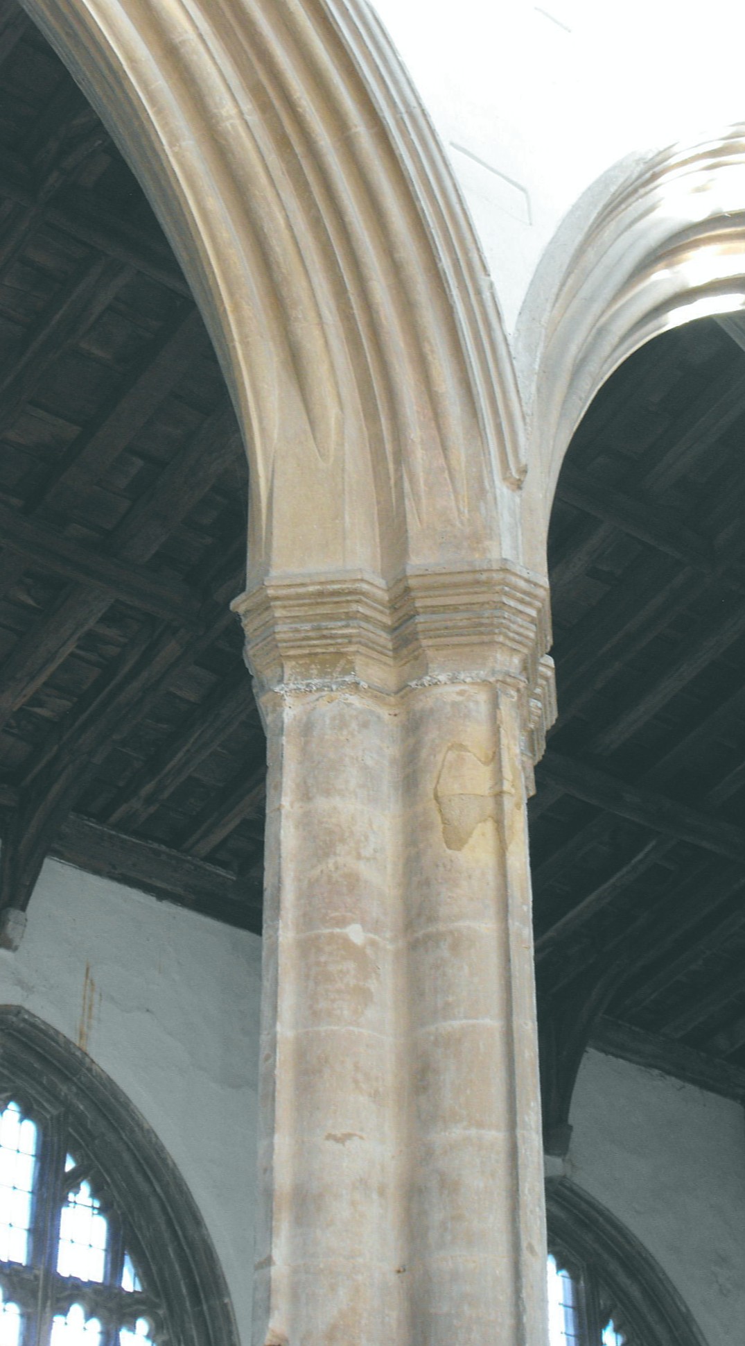 Inside the church it is, naturally, the nave arcades that are initially most striking. The piers are formed of four shafts separated by hollows, with fillets running down the foils and a semi-octagonal capitals to each foil (as seen in the photograph of one of the N. piers, below left), while the non-standard arches above carry a pair of rolls separated by a deep hollow on each of their two orders. The chancel arch is similar but here the most interesting features are the doors alongside the southern faces of the responds, with crocketed ogee hood-moulds opening into the rood turrets, that to the north opening above at the level of the former rood loft, and that to the south, opening higher up, at the springing level of the arch, suggesting there was once a loft here also.