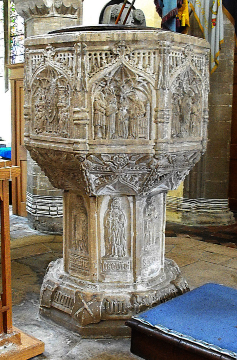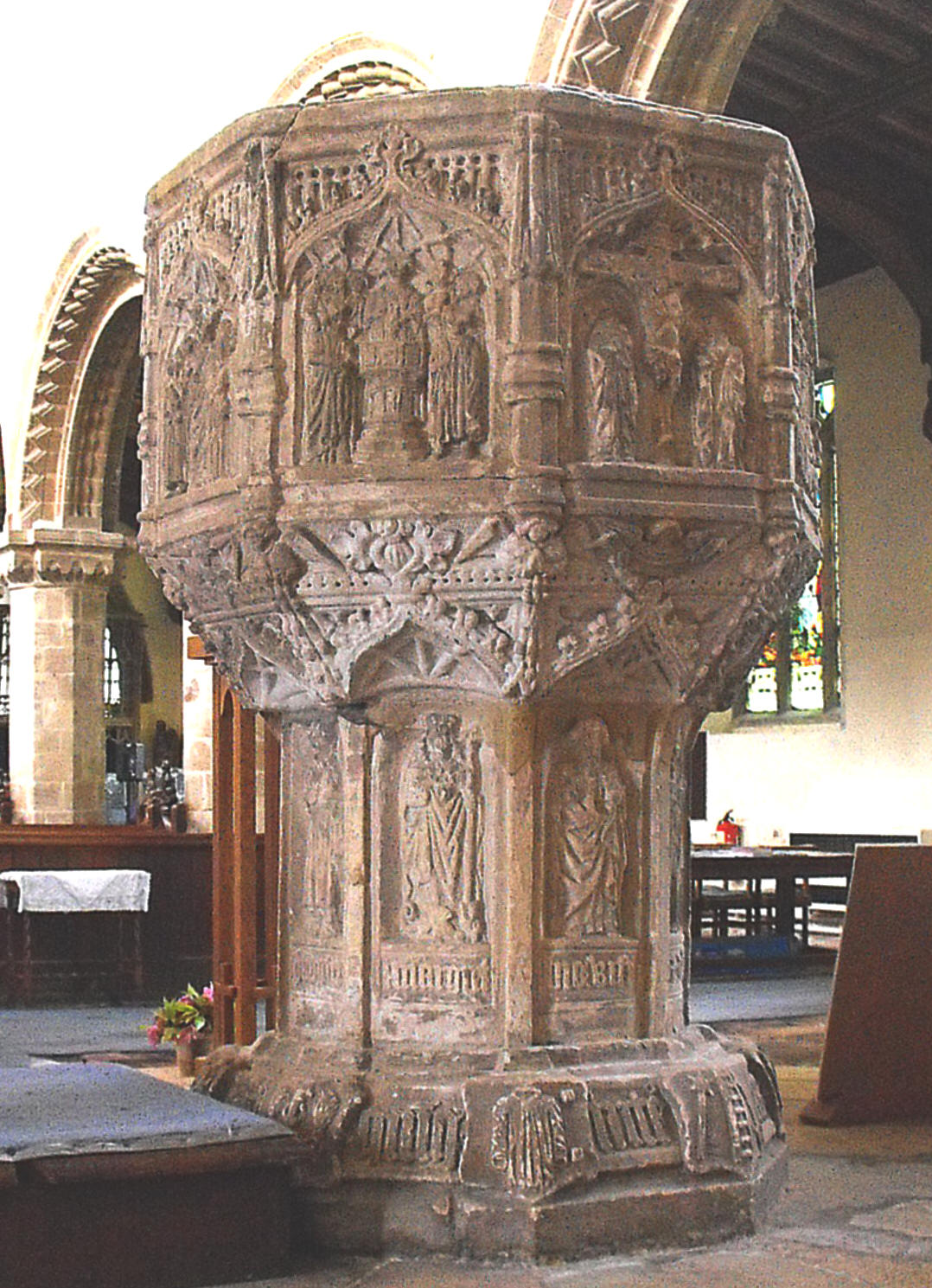 Finally, the account of the church's furnishings and carpentry can be brief but must begin with the excellent font (shown below from two directions), which is dated to 1544 and one of a number in East Anglia to depict the Seven Sacraments on the faces of the bowl, with the Crucifixion on the remaining eighth side. The woodwork does not amount to much for the nave has an uncomplicated couple roof supported by arched braces and the aisles have simple lean-to roofs although they are not identical and the N. aisle roof may be older. However there is a reasonably good parclose screen between the S. aisle and S. chapel and a rather more basic one in the corresponding position to the north, and there are also four disfigured bench ends on either side at the E. end of the nave, adjacent to the central passageway, which once displayed carved figures, since decapitated, inside recesses.