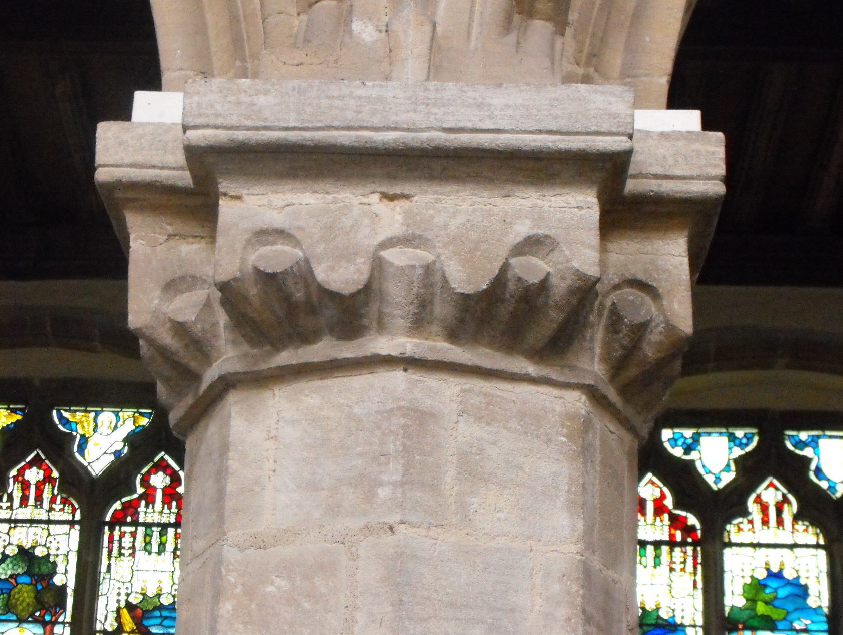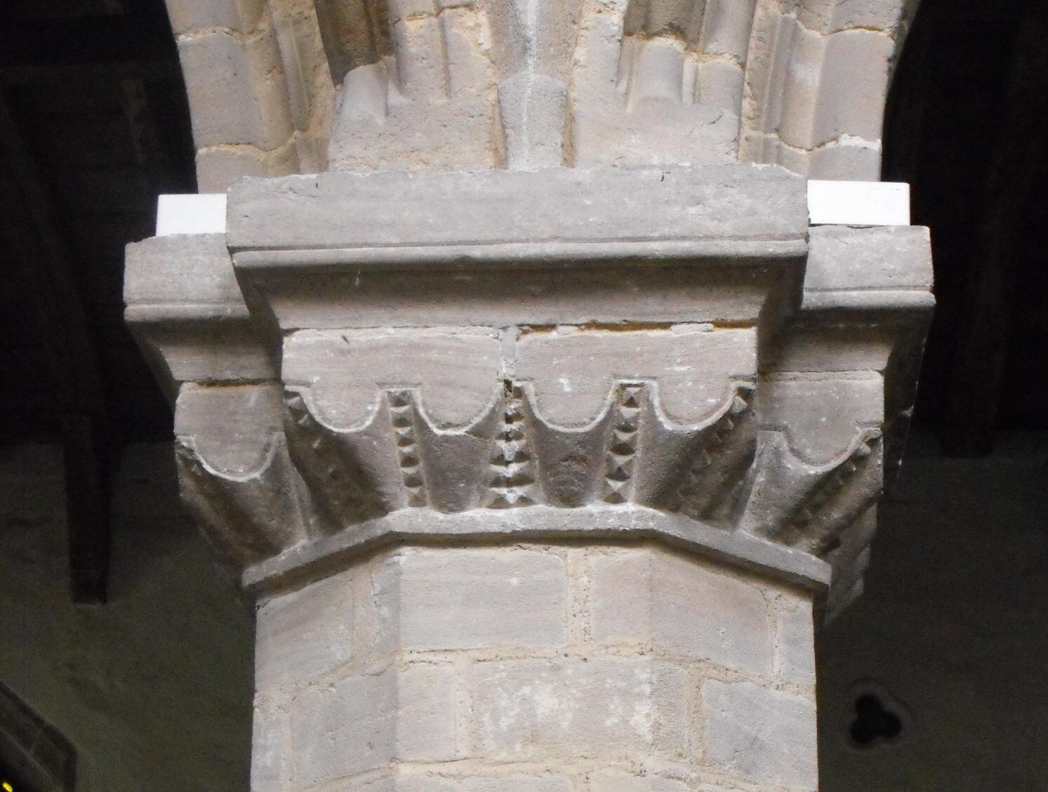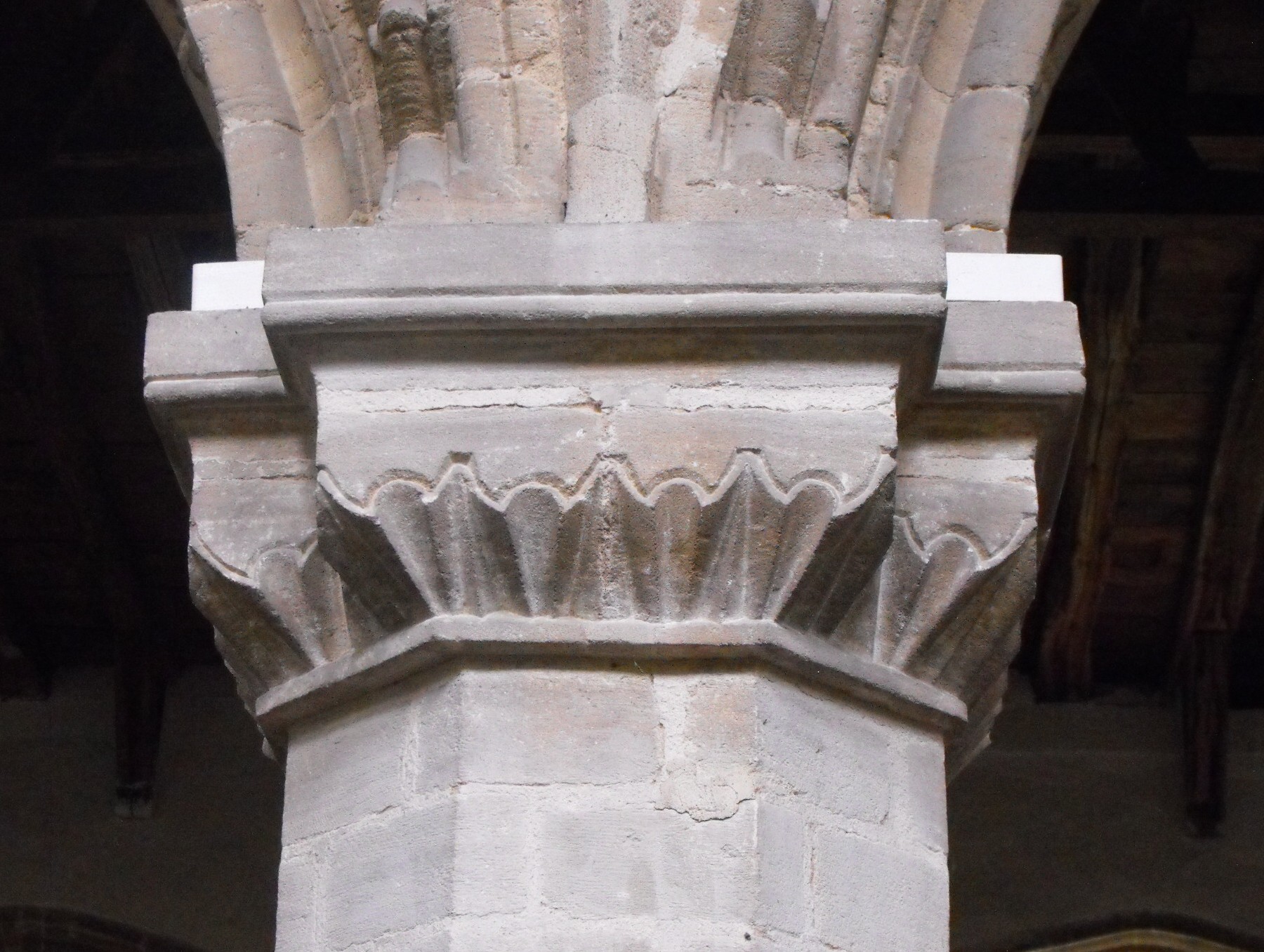 The real glory of the church, however, lies inside. The nave arcades (shown above left in the interior view taken from the west) consist of seven bays, and the chancel chapels, a further two, in uniform style composed of round arches of two orders decorated with chevron set horizontally on the outer order and vertically beneath the soffits of the inner order, springing from alternately round and octagonal piers with scalloped capitals except in the case of the E. responds, which have display waterleaf. The chancel arch clearly belongs to the same construction phase but is pointed. Could that and the waterleaf capitals suggest the nave was constructed from west to east (in the reverse of the more usual practice), to arrive at the chancel arch c. 1180 - 1200? The chancel arch exhibits chevron moulding in three dimensions and a couple of elaborate variations on the theme. (See the photograph above right.) The chancel itself may once have ended in an apse: the present square-ended sanctuary appears to be a modification for there are blocked windows above the chapel arcades, showing the chapels to have been heightened, and a single pair of taller blocked windows beyond, suggesting an apse began immediately afterwards. Returning to the chancel arch, the S. respond is decorated with three orders of side-shafts set in eight integral shaft-rings and the N. respond was presumably once similar before it was cut away to make way for a large niche. However, there is also more variety to be seen in the nave arcades, for close inspection reveals that all the scalloped capitals differ from one another and the arcades as a whole thereby serve as a wonderful illustration of what could be achieved with a simple basic design. (The photographs below illustrate some of the more significant variations.) The tower arch is lancet-pointed and carries a series of rolls above responds formed of a wide pair of keeled shafts with narrow, secondary pairs attached to the east and west, all with stiff leaf capitals.