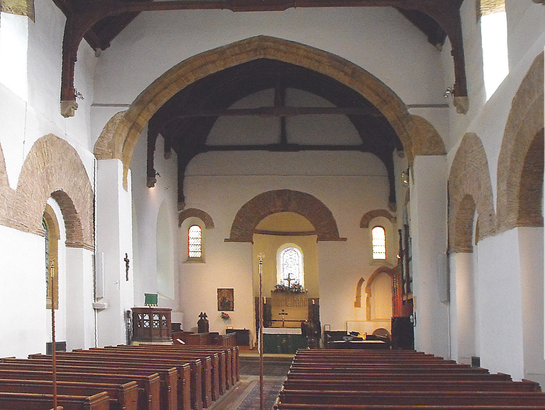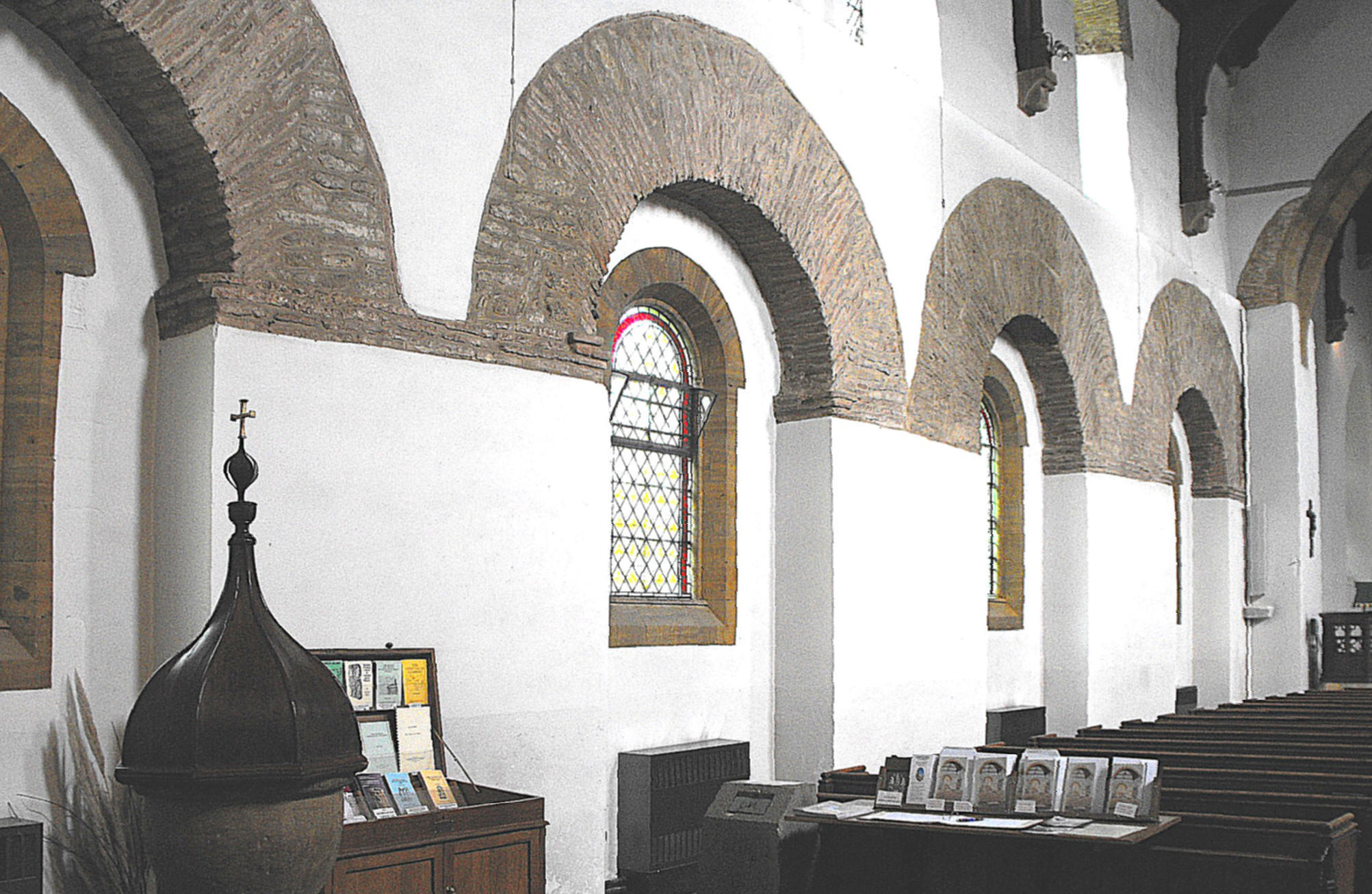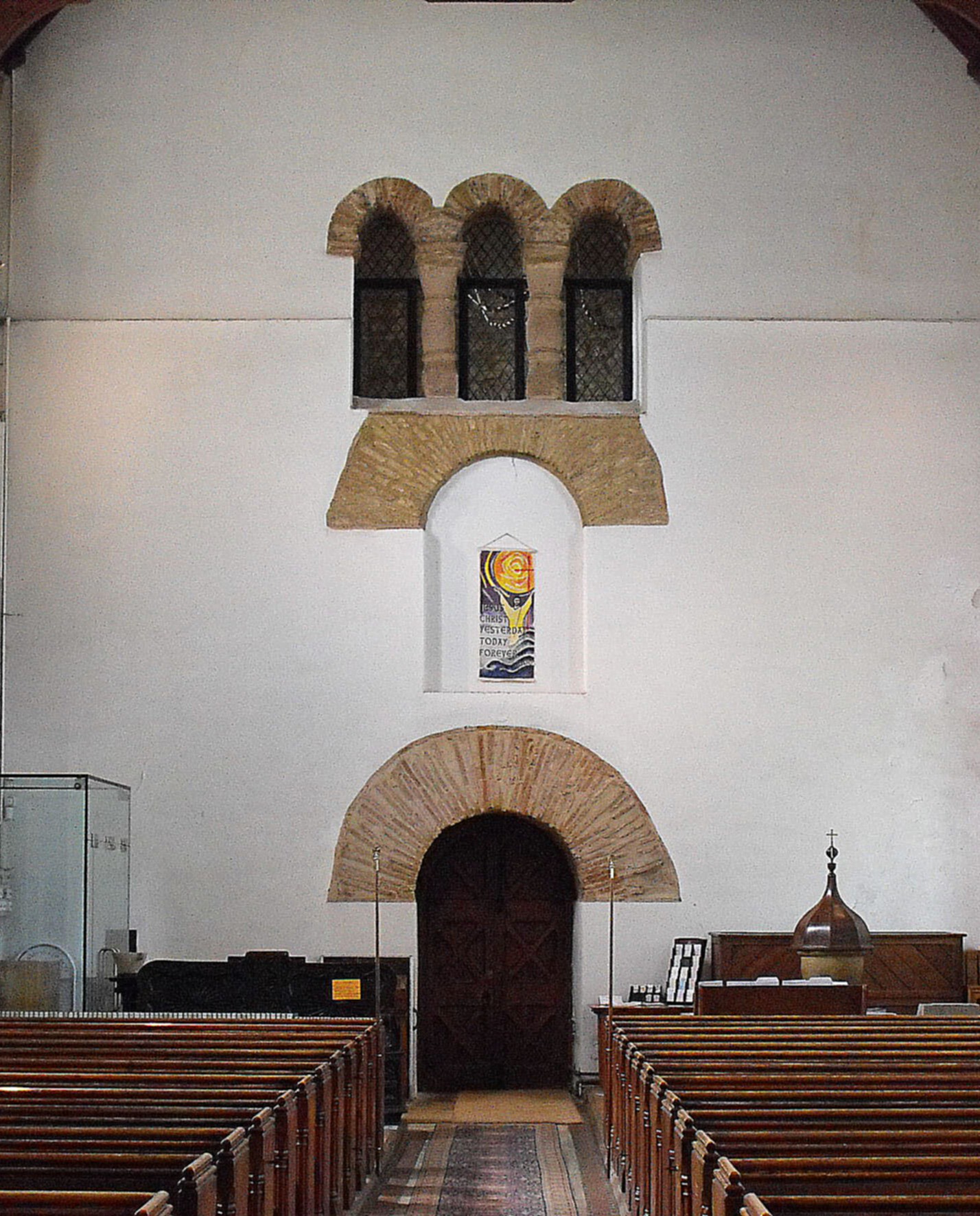 The nave is four bays long and cut though by round-headed arches (subsequently blocked) to the north and south, turned in two bands of re-used, tumbled-in Roman brick. (See the photographs of the N. wall - above, from the outside, and below, from within.) The clerestory windows, turned in a single brick band, were positioned above the spandrels of the main arches so as to look out between the aisle cross-gables. The battlements are a later mediaeval addition. The W. wall retains its original doorway to the W. porch (as seen from within), together with the remains of an arch - probably also a doorway, intended to be accessed by a ladder - to the upper storey. This was probably blocked and the top segment, cut off, when the tower was erected and the three-light opening with baluster mullions inserted between it and the nave (as illustrated further down the page on the left). Only the jambs and fragments of the springing of the outer arches of the triple arcade remain at the E. end of the nave, the rest having been removed and replaced with a single, double-flat-chamfered pointed arch, perhaps early in the fourteenth century. The only merit of the latter is to open up the view through to the Saxon arch to the apse beyond, and of the small contemporary windows, looking east on either side. (See the photograph further down the page on the right.)
