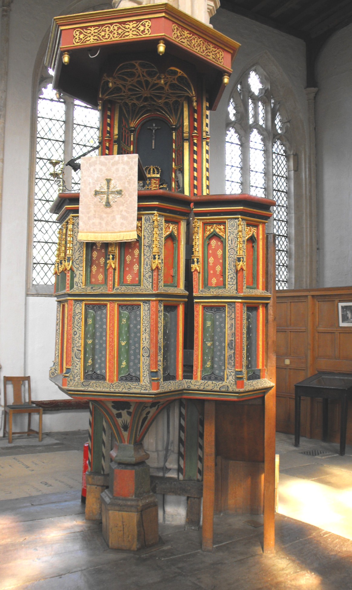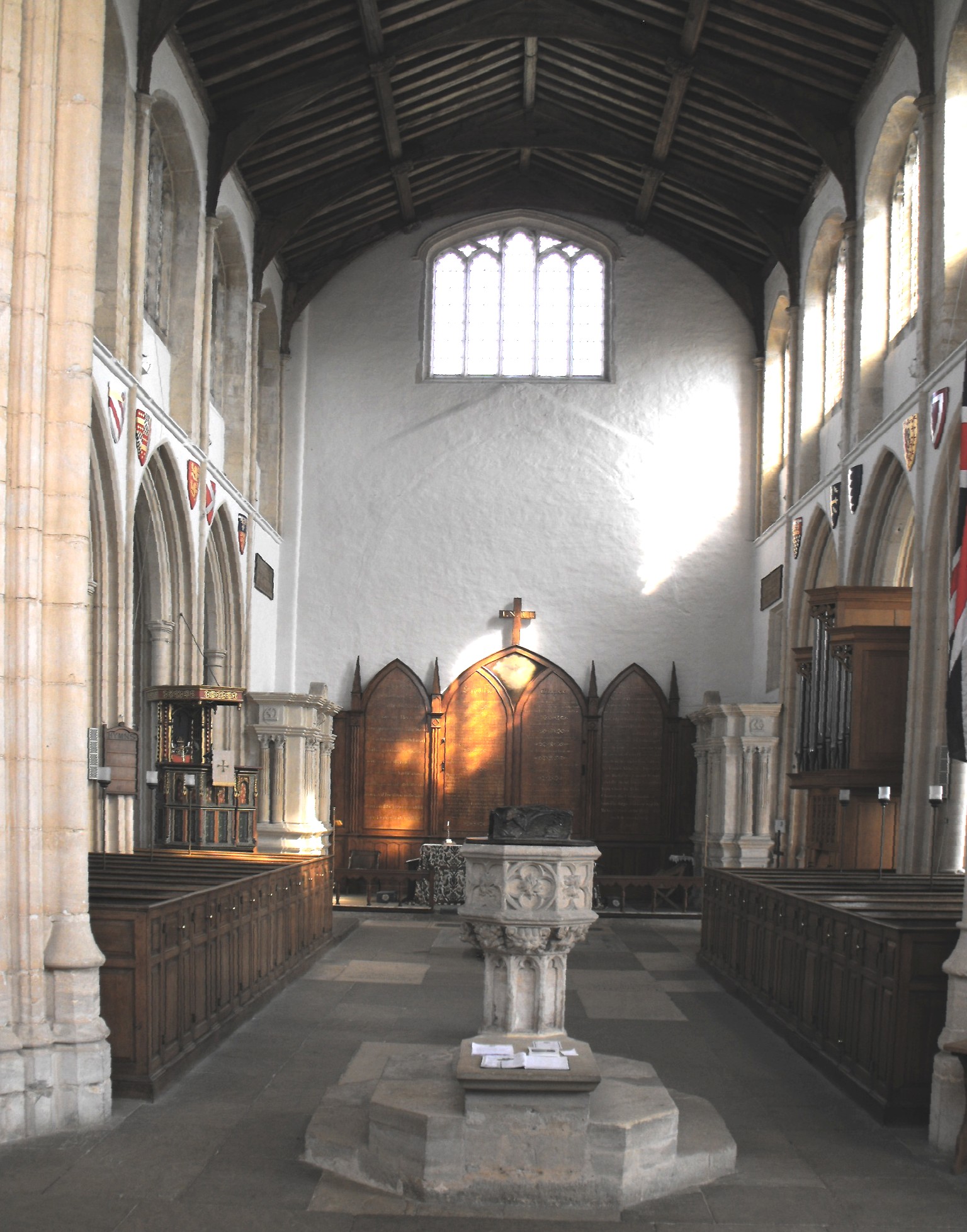 Furnishings in the church include the very elaborate pulpit and tester (above right), believed to have been given to the church by Edward IV (reigned 1461-70 & 1471-83) (church guide), although, in truth, it is probably more striking for its 1960s paintwork in greens, blues and browns than for its carpentry, fine though that is. The reredos is actually a Georgian Decalogue on which is written, as was usual, the Apostles' Creed, the Ten Commandments and the Lord's Prayer. The box pews in the nave are early nineteenth century work. The church contains no monuments of note apart from two distinctly inscrutable ones, without figures, set either side of the sanctuary, which the church guide records as having been ordered to be placed here by Queen Elizabeth I after her visit to Fotheringhay in 1566. Apparently they commemorate: (i) on the right, Edward, second Duke of York, who was responsible for founding the college of priest's four years before he was killed at Agincourt (in 1415); and (ii), on the left, Edward's nephew, Richard, the third Duke of York, and Cecily Neville, his wife (d. 1460 and 1495 respectively).