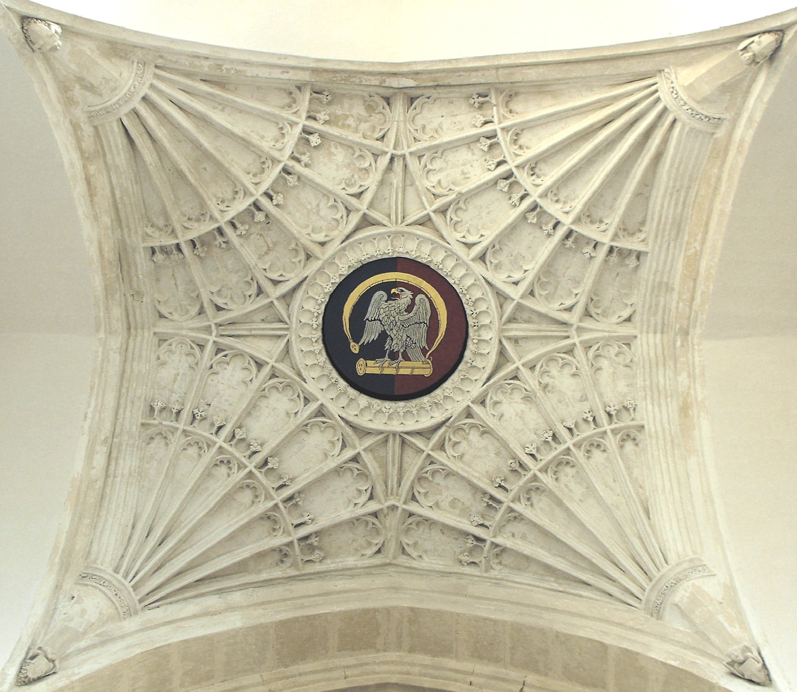 This impressive building is, notwithstanding, less than half what it was, for the aisled quire and Lady Chapel, erected after the foundation of a college of priests in 1411 and demolished in 1573, briefly extended twice as far eastward again. (Compare the photograph above with that of the model of the church c. 1500 at the foot of this page.) The church today consists of a massive W. tower with a tall surmounting octagonal lantern and an aisled nave with a very large, two-storeyed N. porch, and was begun c. 1434 - a date which explains some of the oddities at the church's E. end (see the photograph below left), since when the quire was erected a couple of decades beforehand, the five-light window high up in what has since become the nave E. wall, and the relict windows (only visible outside) now open to the sky above the aisles, looked out westwards above the earlier low, aisled Norman nave. (N.B. Pevsner, writing in the 'Northamptonshire' volume of The Buildings of England in 1973 (Harmondsworth, Penguin, p. 220), wrongly assumed the quire was formerly lower than the nave and that these windows had looked out eastward above the quire and its aisles - the reverse of the actual case.) The monastic cloister lay to the south, linked - after the rebuilding of the nave and aisles was complete - to the church by a short passage, inaccurately described on the large church plan drawn on card, inside the church, as a 'S. porch'. (See the photograph second below.) It follows that everything that survives is Perpendicular in style, and the work is particularly interesting since the master masons are known: William Horewode for the principal structure of the nave and tower, with whom a contract exists dated 24th September 1434, agreeing a price for the work of £300; and Henry Semark for the fan vault beneath the tower, dated 1529, when Semark was aged about seventy (John Harvey, English Mediaeval Architects - a Biographical Dictionary down to 1550, Gloucester, Alan Sutton, 1987, p. 394). The demolished eastern parts of the building were designed by Stephen Lote, whose influence can probably still be seen, albeit at second hand, in Horewode's aisled nave, believed to have been erected with the intention of matching it. The cursory church guide (anon. 2009) suggests that the gargoyle at the eastern end of the church to the north, is a depiction of William Horewode. If so, this would be a very unusual but not unique example of a mediaeval mason being immortalized in stone: Henry Yevele, court mason in turn to Edward III and Richard II, who is believed to have designed, among other important works, the cloister at Canterbury Cathedral, can probably be seen on a vault boss there.