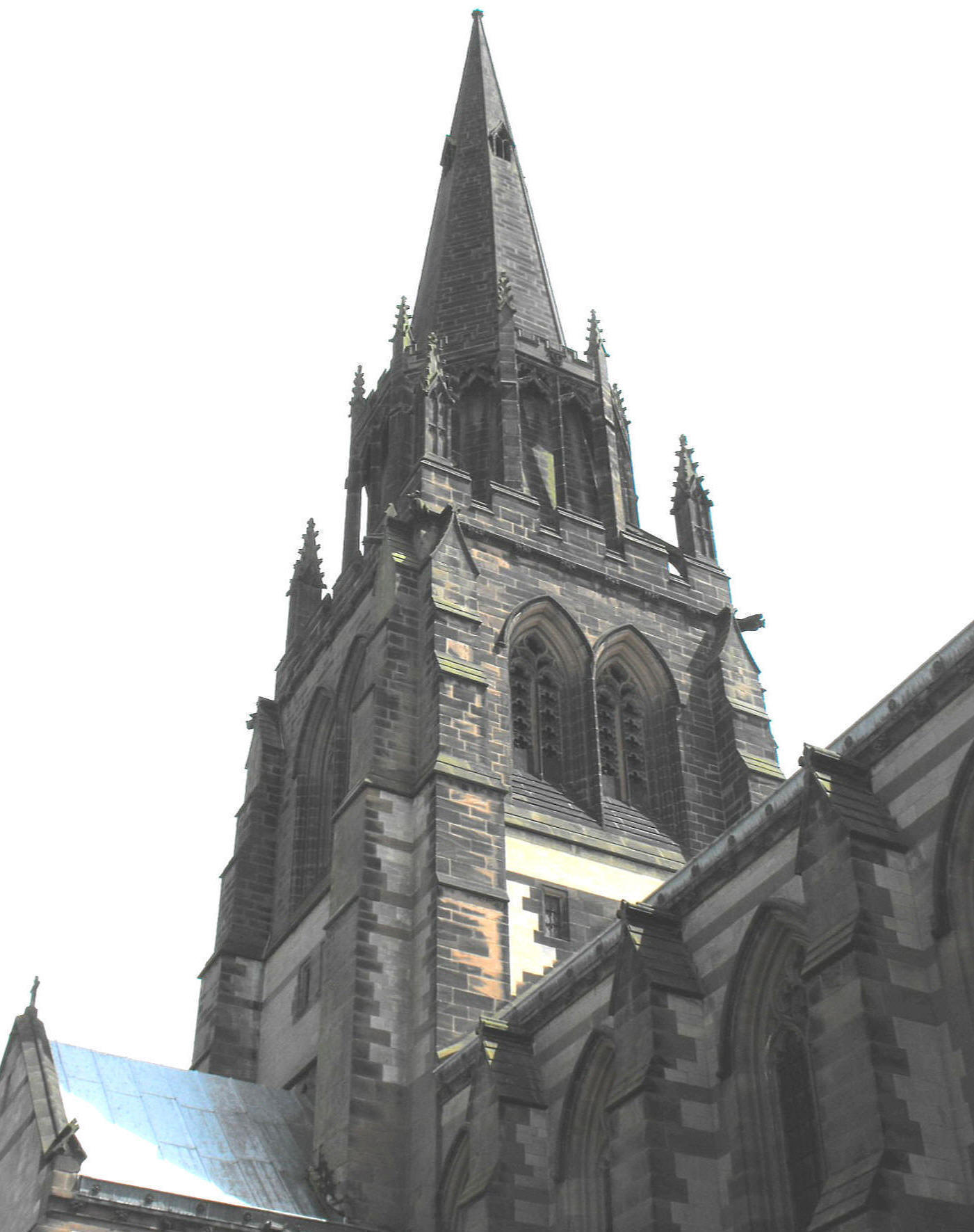 Stone below the windows but banded with red sandstone above, while the