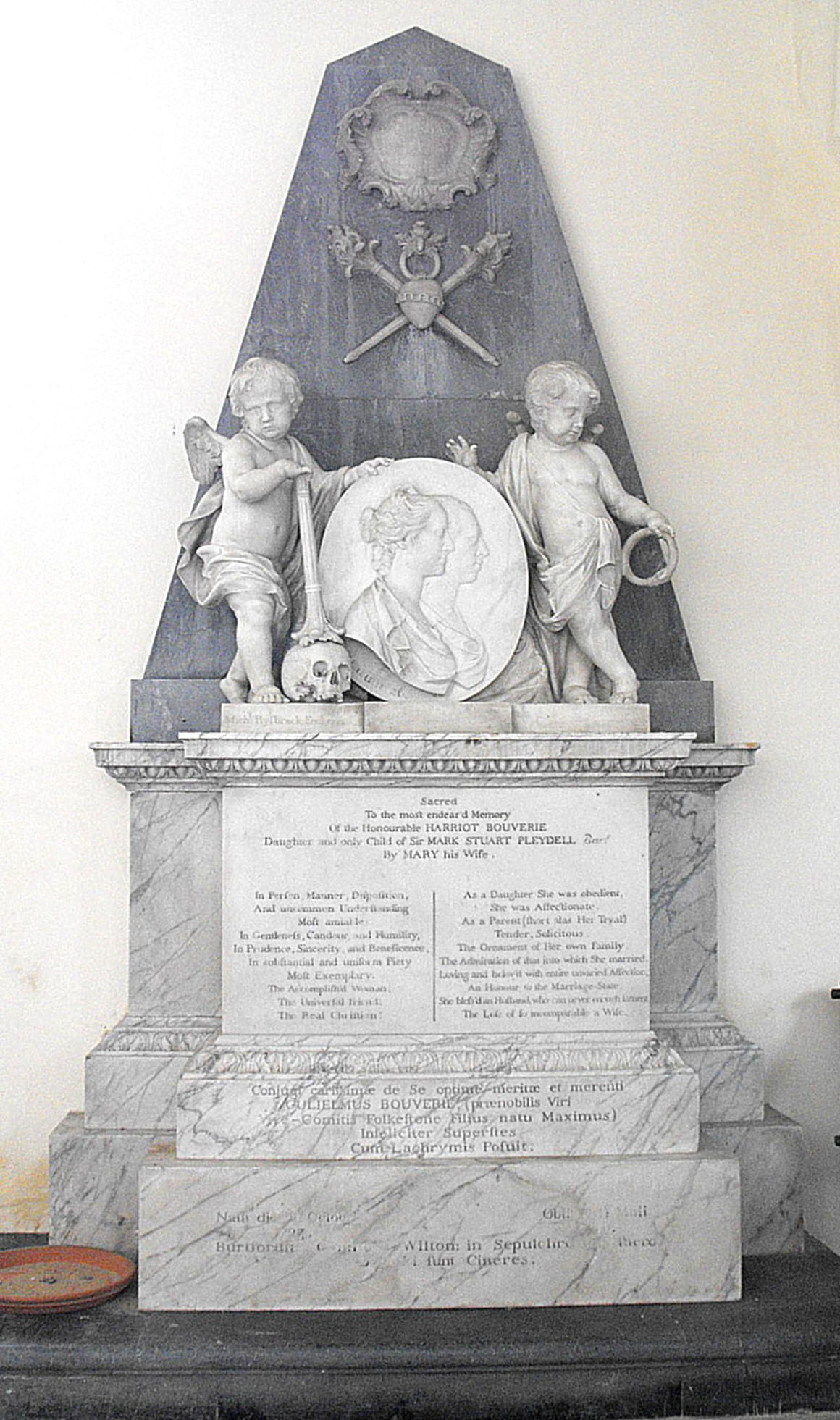 Michael Craske, writing in The Silent Rhetoric of the Body (New Haven & London, Yale University Press, 2007, pp. 326-329) considers this monument to be the only sculpture of its period in which the female portrait overlaps the male, a symbol of the Bouverie family's unusual privileging (for the time) of the wife's place in marriage. Two raised torches beneath the cartouche, united by a human heart, 'are held to symbolise mutual love. A putto to one side shows how one of these flames has been put out: he extinguishes a torch on a skull. A companion putto suggests the lovers' consolation by holding the emblem of eternity, a serpent biting its tail.'