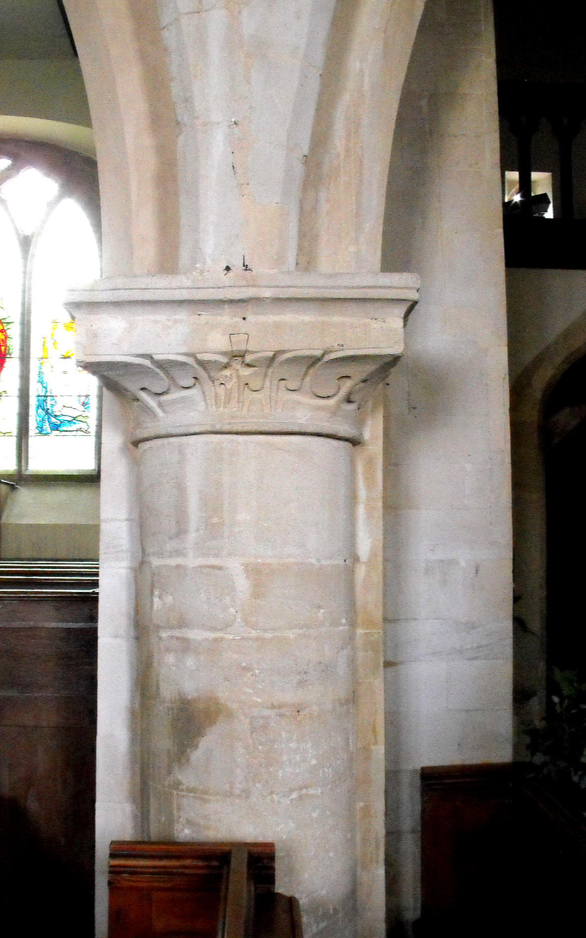 The outer arch to the porch, bearing only two flat chamfers dying into the jambs, might possibly suggest a thirteenth century date if one ignores the evidence provided by the windows. The inner doorway is trefoil-cusped. The N. arcade is Early English and formed of two and a half bays composed of double-flat-chamfered, pointed arches springing from circular piers and capitals. Presumably it originally consisted of three bays until truncated by the tower. The two discrete arches to the S. chapel are Norman-Transitional for although the arches above the springing are similar to those opposite, the responds supporting them have capitals decorated with flat leaves (a kind of half-remembered waterleaf) characteristic of c. 1200. Moreover, 'responds' (i.e. demi-piers) is indeed the correct word for them, for even the central one is only a half-pier facing north (illustrated left), attached to a wall piece to the south. (The E. respond consists of a quarter-pier and the west end of the arcade dies into a wall piece.) The chancel arch is exceptionally crude and slight, and is formed of two inner rectangular orders and an outer flat-chamfered one, rising from corbels similar in size and shape to teacups. The tall tower arch has an outer order bearing a wave and an inner order which is flat-chamfered below the springing and slightly waved above, but of much greater interest are the remnants of a former vault in the corners of the tower, supported on head corbels immediately above the arch, though whether the vault was demolished or never completed in the first place, is difficult to tell.
