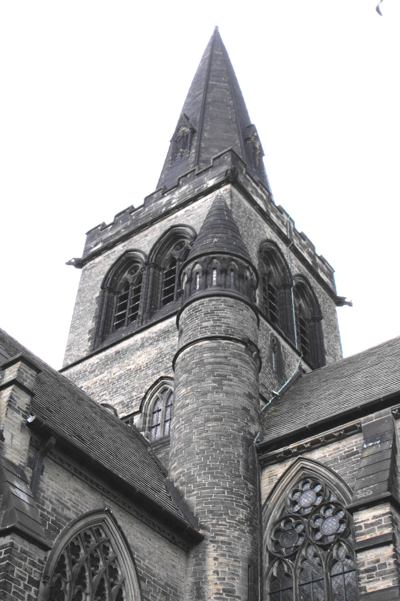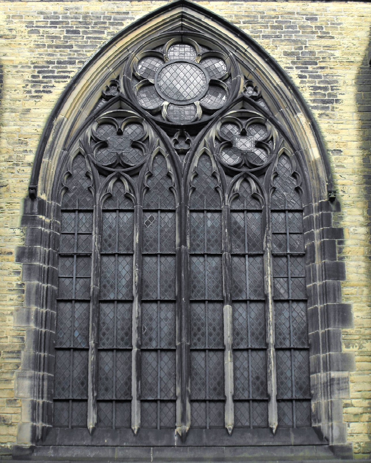 exterior is all millstone grit, unbanded and with no tumbling in of contrasting stones around the window heads, nor