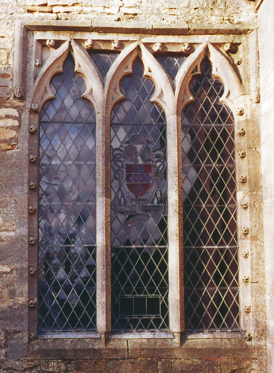 The chancel is lit from the south by three dissimilar windows (illustrated right), all with drop tracery, of which the westernmost is segmental-pointed and supermullioned, the central window is four-centred and transomed, with strong mullions, split 'Y's above the outer lights and a supertransom above the central light, and the easternmost is renewed and formed of lights separated by strong mullions, with a quatrefoil in the oculus. The transomed five-light E. window with strong mullions has been largely renewed but is notable for the head label stops to the hood-mould, which do appear to be original, and for the little carved figures at the springing level of the roll moulding that runs around the extrados. There is one window with supermullioned tracery on the north side of the chancel, to the west of the nineteenth century vestry.