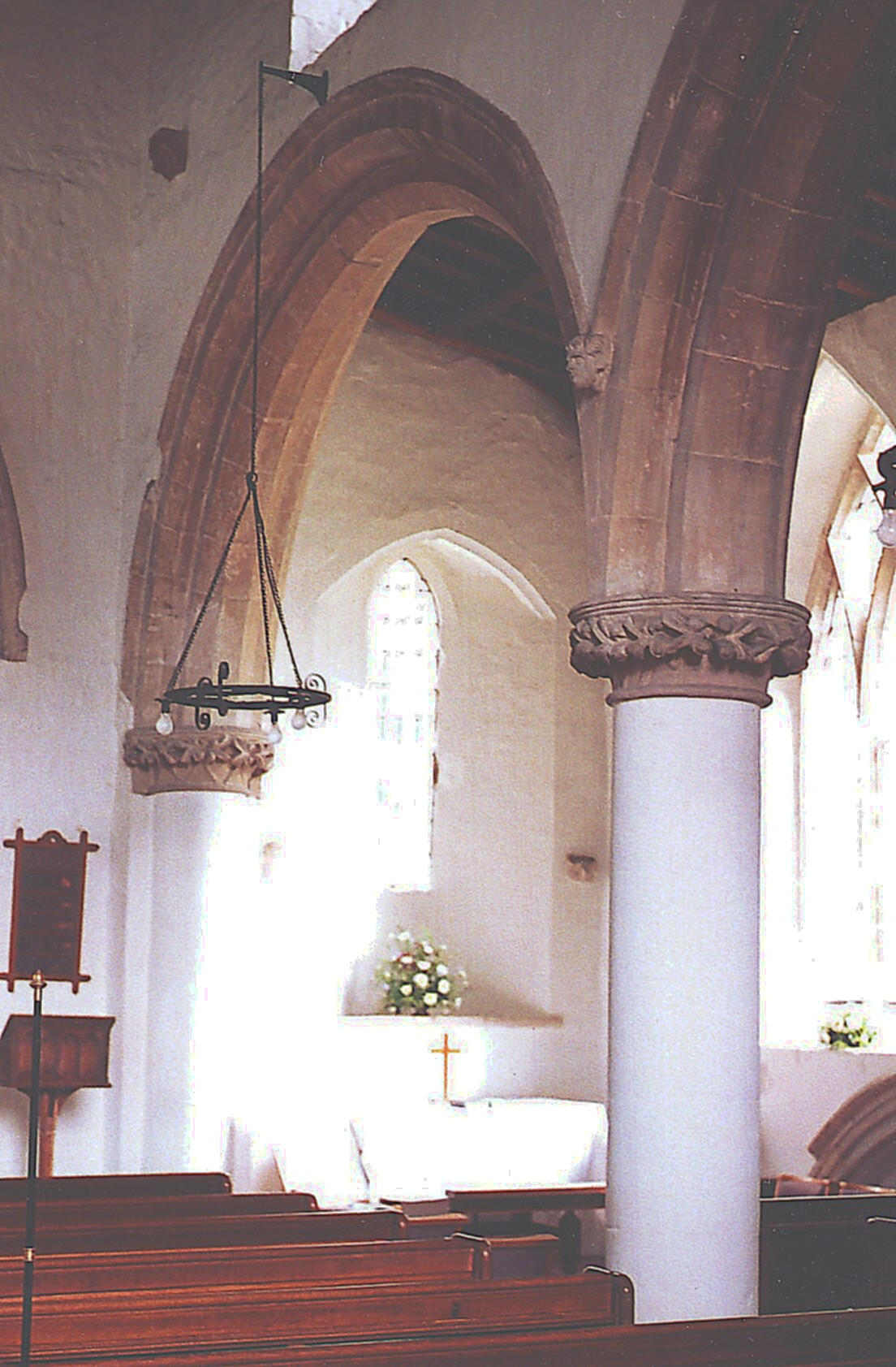 Inside the chancel, the N. and S. walls contain four square recesses that act as aumbries, two each to the north and south, the former with doors. The double-flat-chamfered chancel arch springs from semi-octagonal responds with badly mutilated capitals, perhaps as the consequence of cutting back when an erstwhile rood screen was fitted. The large but windowless S. porch is also thirteenth century work, with its double-flat-chamfered outer doorway supported on semi-circular responds with stiff leaf capitals and its single-flat-chamfered inner doorway with very worn head label stop to the right.