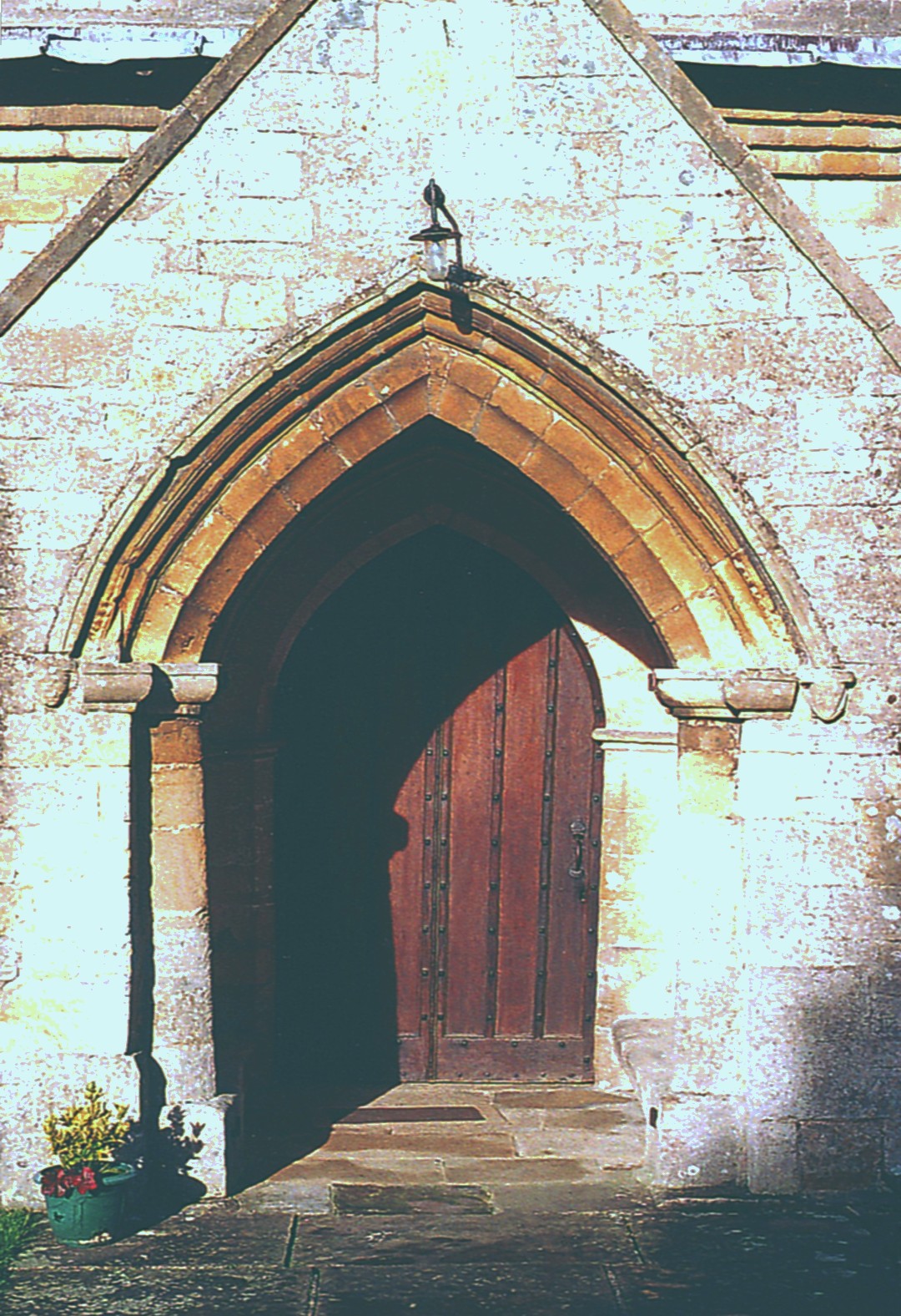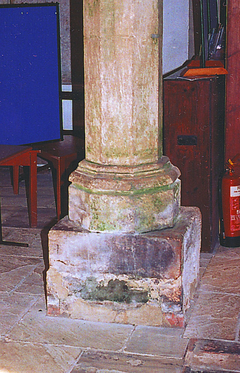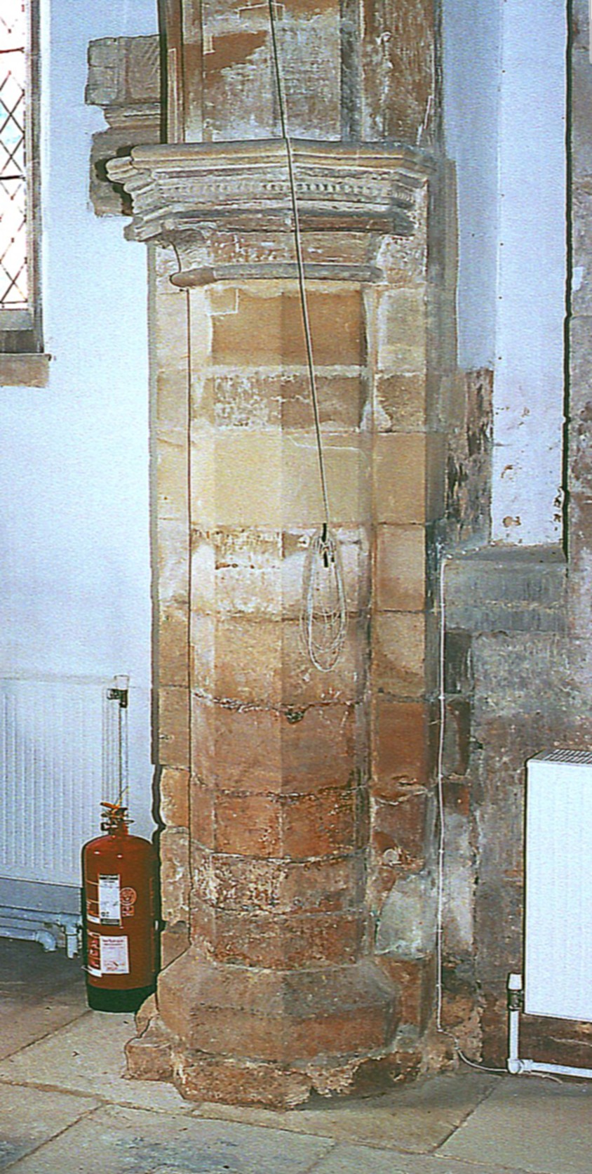 As to the S. aisle itself, this has no east window and only simple Perpendicular, three-light square-headed windows to the south. It widens out to the east of the S. porch, to give the appearance of a chapel externally, but there is no evidence of a chapel inside, instead of which this part of the aisle now serves as an organ chamber. The S. porch (below right) has an outer doorway of two orders, of which the inner bears a hollow chamfer above semicircular shafts topped by shapeless capitals. The inner doorway is formed of a single flat-chamfered order supported on simple abaci and the porch itself has a simple collar-beam roof.