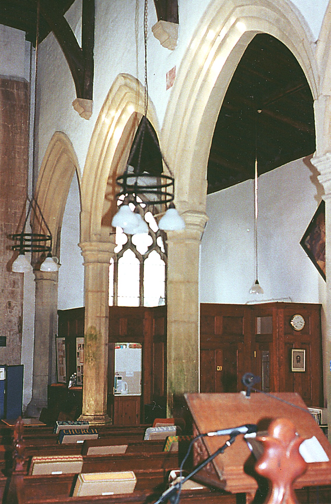 However, the earliest work unarguably incorporated in the essential structure of the building, is in the Early English style, as witnessed by three lancets with hood-moulds in the S. wall of the chancel (illustrated below right), and a restored fourth one in the S. aisle W. wall. The western end of the chancel S. wall - which encompasses one of the lancets within it - is curious, for it inclines out towards the S. aisle at an angle of approximately 20º and has what appears to be a little arch behind, as well as a small portion of roof above, tiled at a lower level than the chancel proper and not contiguous with it (just possible to discern in the photograph). The reason for this arrangement is no more obvious inside than out, so one is left to speculate about its origins and the only explanation that comes readily to mind is that it may have been in some way connected with a former rood stair turret, following the demolition of which, this lancet was reset. The S. arcade is three bays long and decorated with a little nailhead on the capitals of the east and west responds, which have slightly hollowed sides in the ordinal positions. (The W. respond is illustrated in the second photograph down on the left.) This might suggest it has a thirteenth century (Early English) derivation, but the arches above - which bear two hollow chamfers of slightly differing widths, with little broaches inclining into the outer order from the capitals - are early fourteenth century in appearance, so, perhaps, this is actually early fourteenth century (Decorated) work which reused some earlier stonework. The two central piers of the S. arcade below the capitals, appear to have been renewed or heavily scraped. The chancel arch is wider than the chancel, an improbable situation made possible here by the splaying out of the chancel S. wall already described, suggesting it was constructed in its present form around the time the S. arcade was built and that the S. aisle was not part of the original plan.