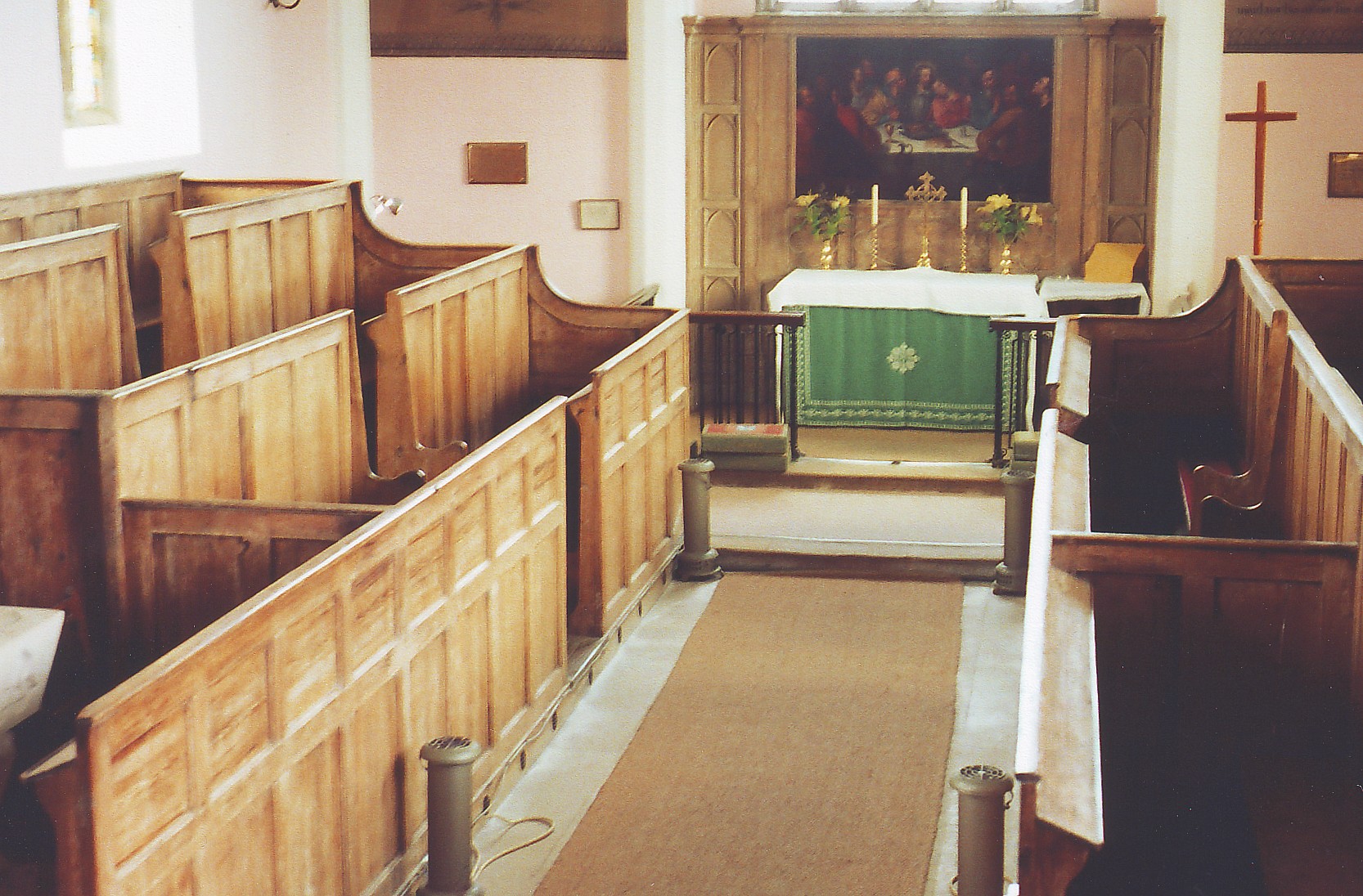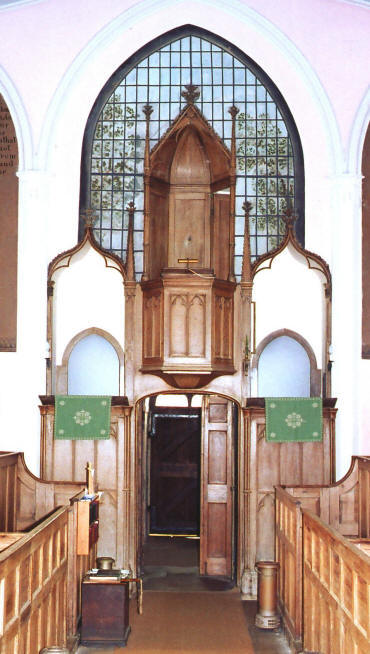 All this is of modest interest, but it is the interior of this church that ensures it is memorable, and this is indubitably a product of its time. Light and airy in the welcome absence of stained glass, it is arranged like the interior of an Oxbridge college chapel (as shown in the photograph below), with three rows of tiered seating each side, set out longitudinally so that the congregation can look with equal ease at the altar to the east or at the readers’ desks and pulpit, curiously arranged around the tower arch to the west (as illustrated right). In fact, Richardson provided two readers’ desks here, presumably for reasons of symmetry, one each side of the tower arch and both approached up a short winding staircase that leads into a little box that looks out over the nave through an ogee-pointed opening, several feet above the nave floor. However, odd though this is, the pulpit is still more remarkable for this is approached up a taller staircase that gives access to a third box above the apex of the tower arch, which is covered by a tall wooden canopy. Arranged together in this way, these 'three boxes give one an irresistible hope that at any moment preacher and readers might pop out like the little figures in a weather-house' (Nikolaus Pevsner, The Buildings of England: Leicestershire and Rutland, Harmondsworth, Penguin, 1960, p. 326) and they certainly provide a much more striking internal perspective to the west than the comparatively modest altar recessed in an alcove below the E. window, can offer towards the east.
