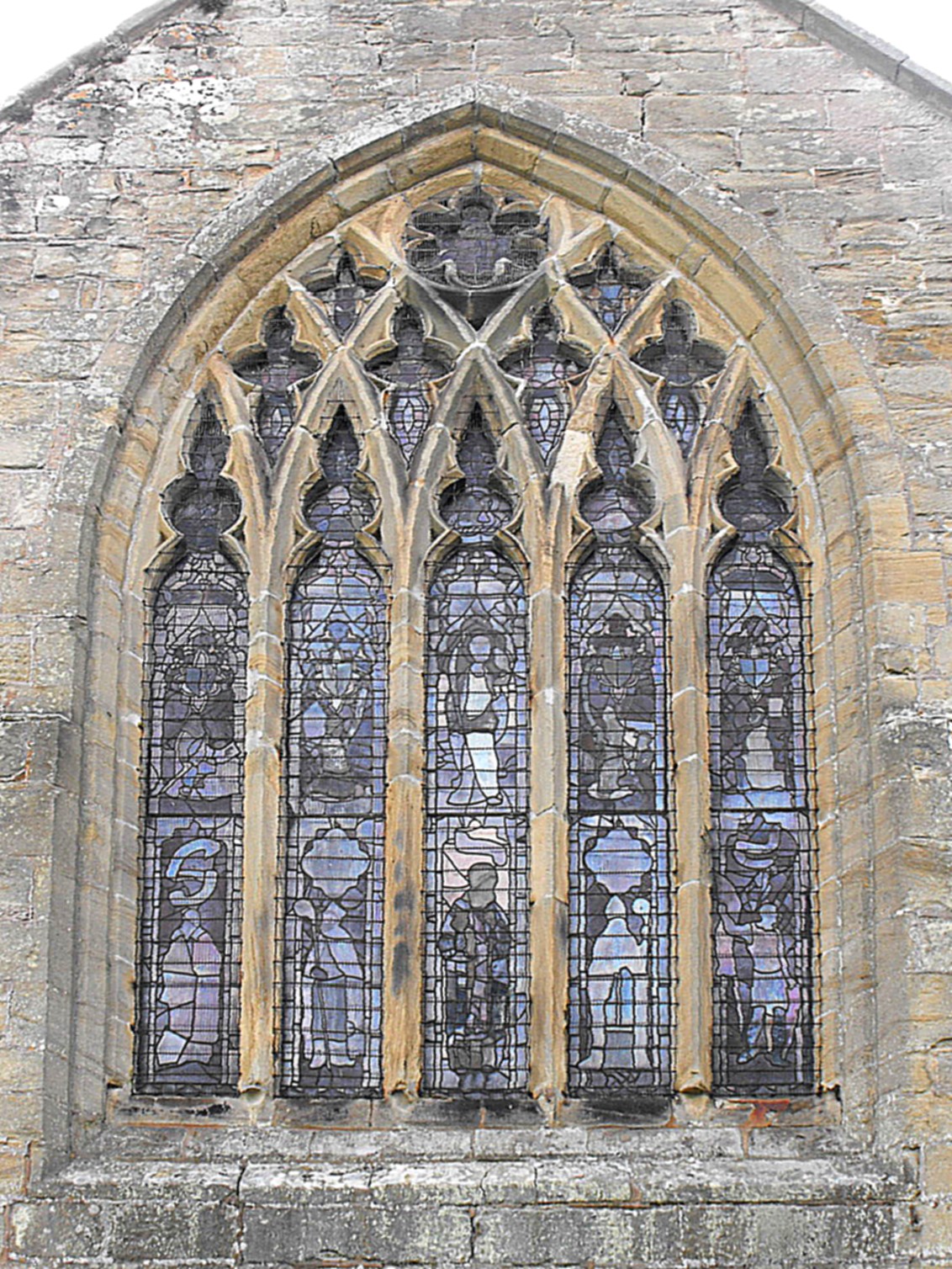 The pre-ogee Decorated years at Kinlet are represented by the chancel and transeptal chapels leading off to north and south. Since the aisles are pierced only by small rectangular slits, responsibility for lighting the church falls entirely on the clerestory and chancel and chapel windows. The N. and S. windows to the chapels are three-light with intersecting cusped tracery, pointed trefoils in the heads of the lights, and daggers in the reticulation units above. The five-light E. window to the chancel (illustrated below left) takes similar design elements further: the lights here are very sharply pointed and provided with elongated cinquefoil-cusping while the tracery intersections above, stop short of the head of the window to make room for a sexfoil in a circle. This non-standard pattern is almost an exact copy of the E. window at neighbouring Stottesdon, suggesting they are the work of the same man. Going inside the church again, the restored chancel arch is composed of three orders bearing rolls with fillets, supported on three orders of shafts with a fillet on the innermost. The arches from the aisles to the transepts look more like late fourteenth century work with their sunk quadrant and two flat chamfers, all three of which mouldings die into the jambs. The arches from the chancel to the transepts carry a complex series of mouldings above semi-quatrefoil responds.