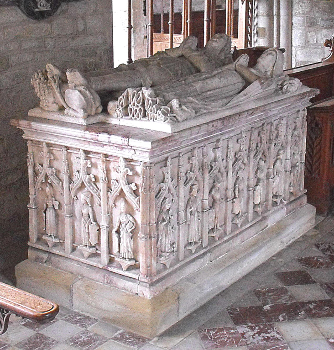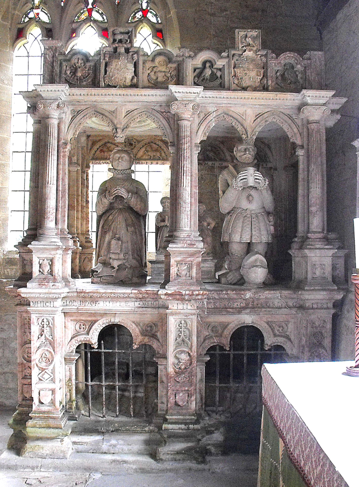 The S. chapel has a piscina to the right of the altar and a double aumbry to the left. A recumbent effigy of a woman in the southeast corner, with a child by her side, is believed to represent Isobel Cornwall, who seems to have died in childbirth in the early fifteenth century. The N. transept contains a huge standing monument (shown above right) dated 1581, backed up against the N. wall. It commemorates Sir George Blount of Kinlet, who died in that year, together with his wife Constantia, and features carved figures of the couple, standing apart, between fluted Ionic columns, supporting pairs of Gothic arches above - a curious combination. Finally, other monuments in the church include a number of significant wall monuments in the chancel, and, in particular, two elaborate tomb-chests, one each to the north and south. Upon the latter lie two straight-legged recumbent effigies, considered to represent Sir Humphrey Blount (d. 1477) and his wife Elizabeth. Cusped arches around the tomb-chest are occupied by a series of skilfully-carved figures, unfortunately now largely defaced. (See the photograph below.) The effigies lying on the tomb-chest to the north, are those Sir John Blount (d. 1531) and his wife Catherine, who is depicted wearing a wimple. The figures around the tomb-chest are believed to depict the couple’s five sons and six daughters while two pairs of dragons between them hold shields.