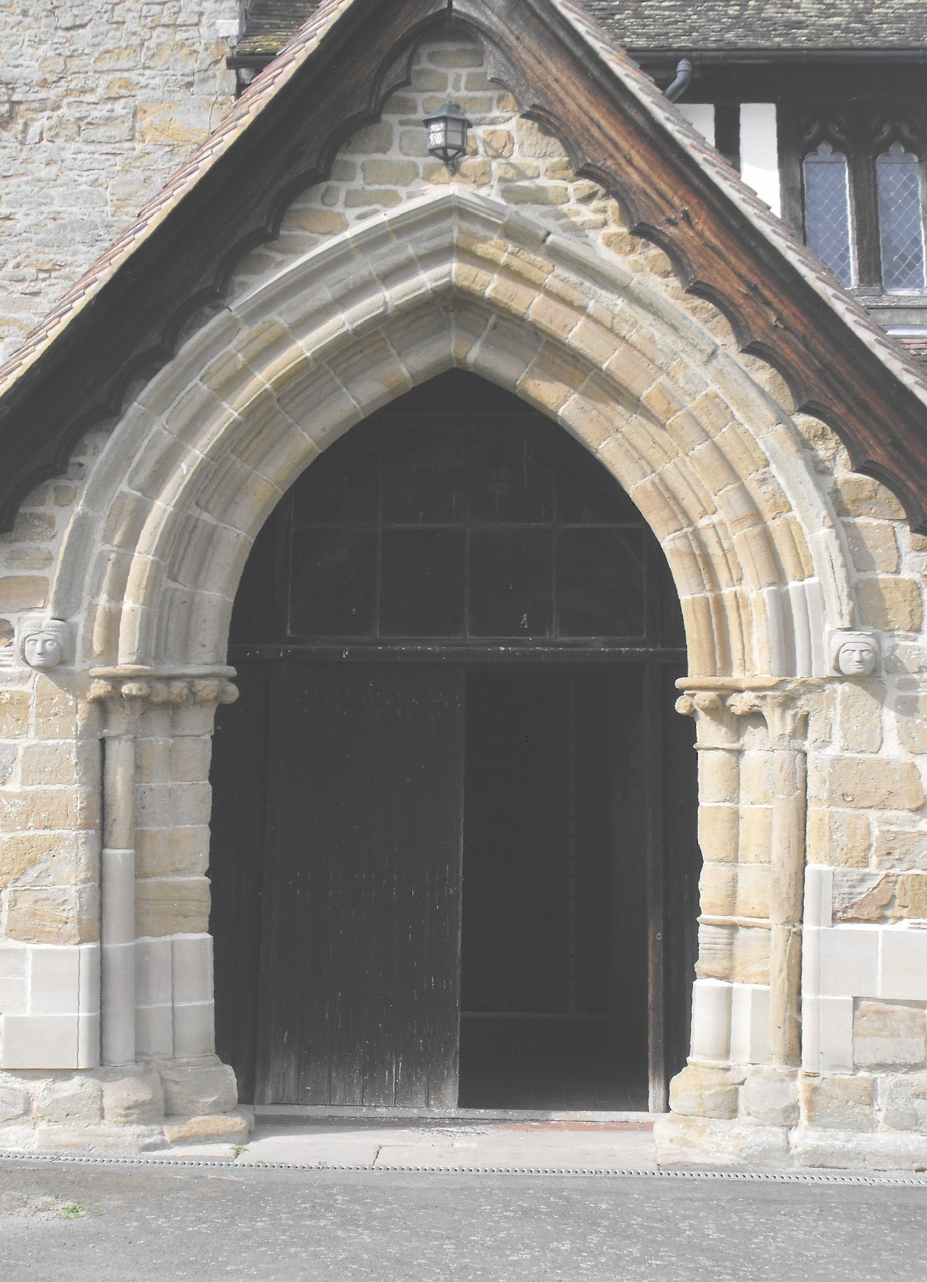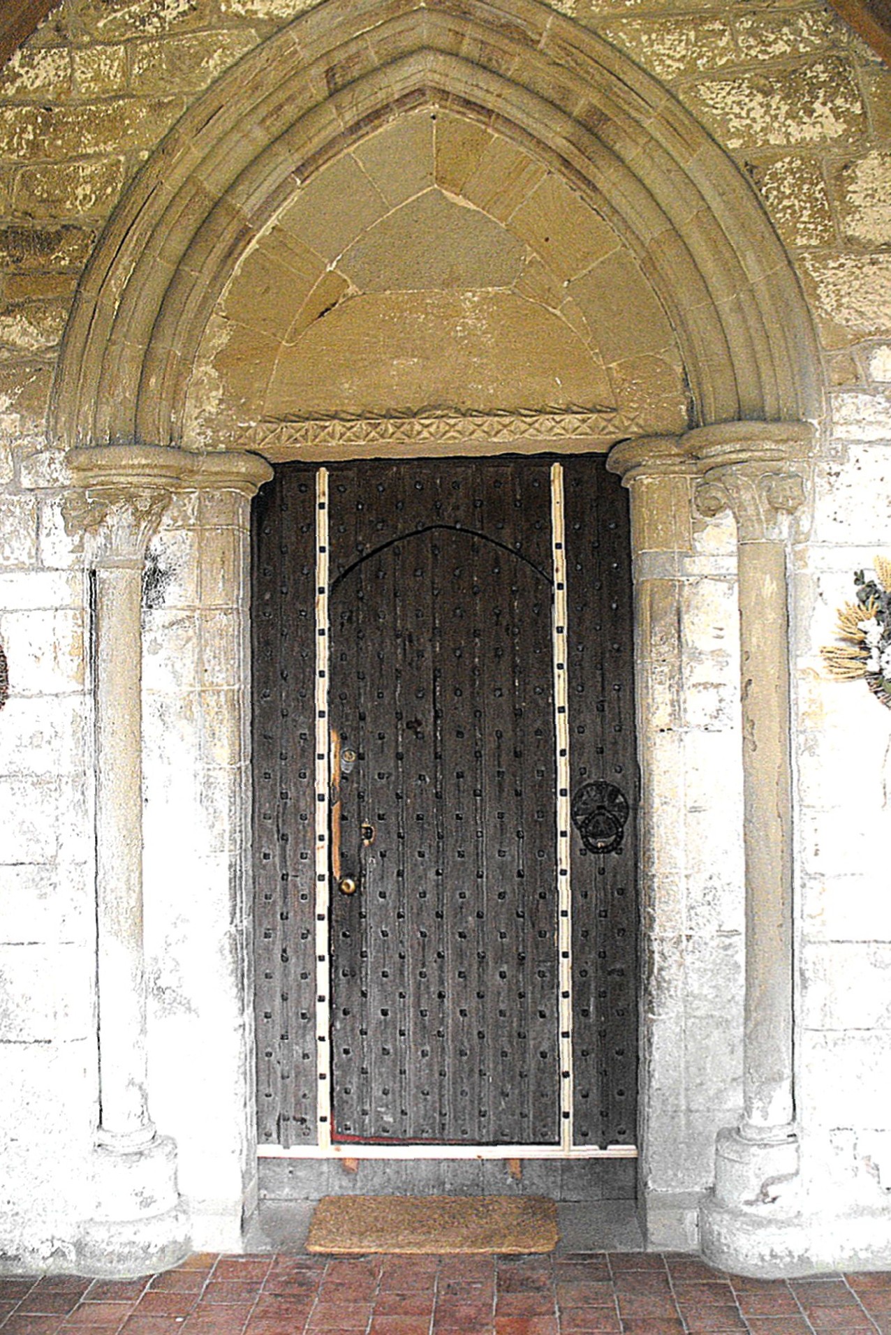 The S. porch inner doorway is pointed and thirteenth century in date, but it reuses part of an earlier tympanum and a lintel below with a line of carved saltires. (See the photograph below left.) Another Norman remnant to be seen in the building is the round head of a small window, blocked up in the chancel N. wall. Both these may predate construction of the N. arcade, while the S. arcade may be contemporary with the lower parts of the tower, lit by narrow lancets. The tower rises in three stages, which are characterized by the curiously narrow central stage pierced by two lancets to the north and west. The bell-stage is probably an early Perpendicular addition to judge by the straightened reticulation units in the heads of the two-light bell-openings. The tower is surmounted by battlements and corner pinnacles. Inside, the very wide tower arch rests on responds of three orders, the innermost of which has attached semicircular shafts with capitals decorated with stiff leaf and faces. The relatively long S. porch looks renewed from the sides but the outer doorway is mediaeval (see the photograph below right): the arch carries two rolls with fillets above three orders of worn shafts, each topped by a pair of stiff-leaf capitals. The hood-mould and label stops are modern additions.