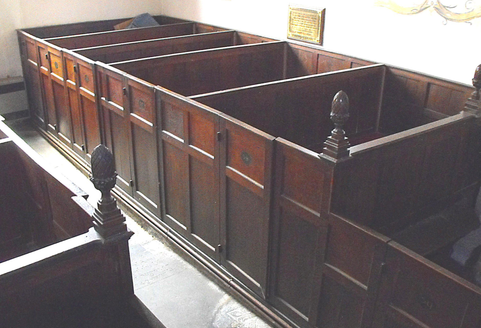 Other features to notice inside the church all relate to the woodwork. Both transepts are entirely filled with attractive Georgian box pews but with sides so high (in excess of 4') that it is difficult to imagine the occupants could have felt much engagement in the services. (The pews in the N. transept are illustrated below.) The nave, chancel and transept roofs all differ from one another though both the nave and S. transept roofs are of queen post construction and the former is similar to the nave roof at Hopesay, four miles southwest, which is likewise divided into squares by the intersection of the purlins and the rafters, which are then filled with shaped pieces of wood forming quatrefoils. Pevsner claimed the Wistanstow roof is dated (somewhere) to the year 1640 but his description of the quatrefoil infills as 'windbraces' surely stretches the term too far, for the little individual pieces of timber that comprise this decoration, some of which are noticeably unattached to their neighbours, would hardly strengthen anything and surely only maintain their place by virtue of being fixed to the woodwork above. The N. transept roof is mediaeval and of collar-beam construction. The chancel roof is probably Victorian and memorable chiefly for the little dormer window under a gablet on either side towards the west. They have a rustic 'arts and crafts' appearance about them, reminiscent, for example, of Eden Nesfield (1835 - 1888), but no firm evidence of the date of this roof appears to be available.