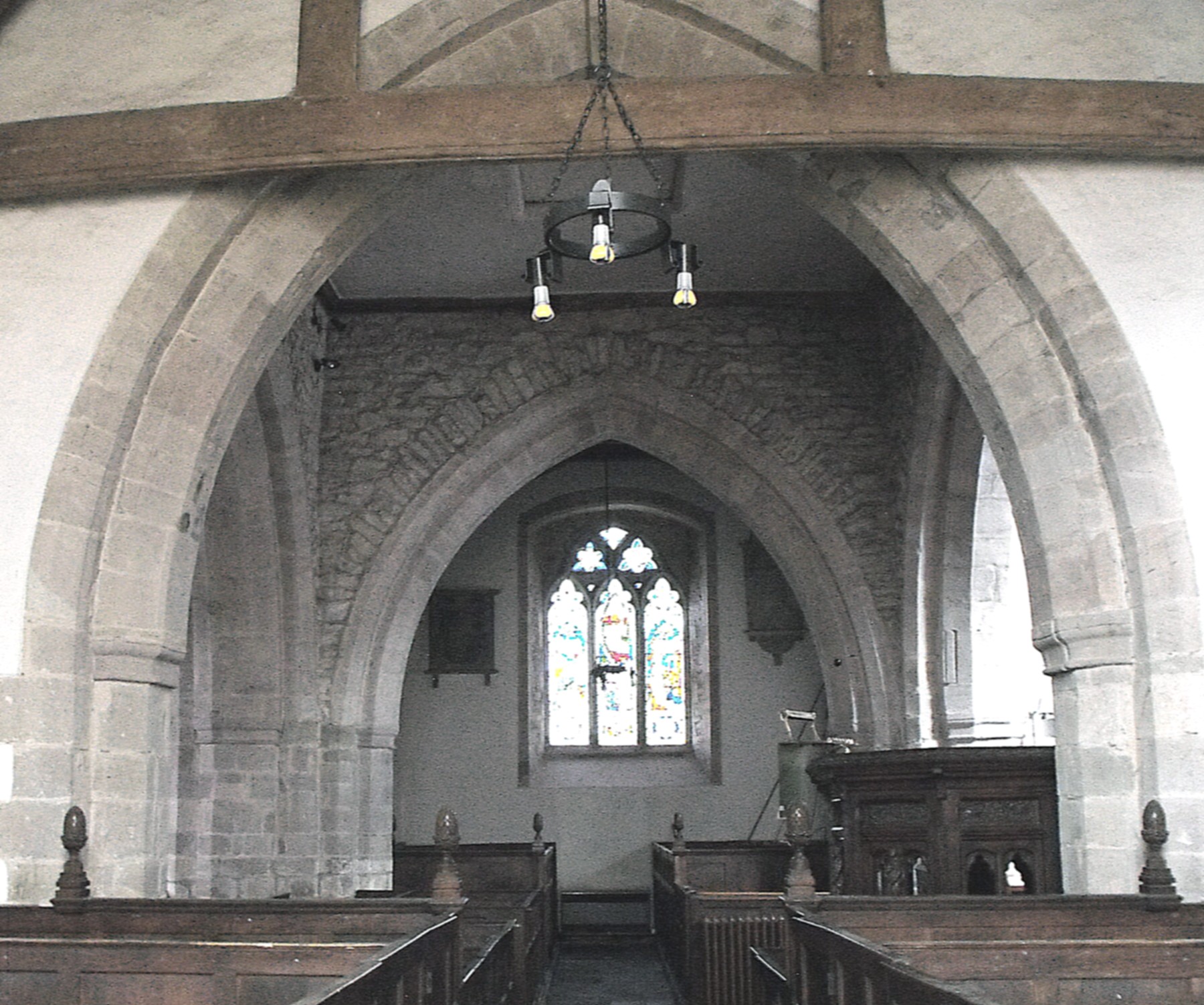 This is a church of cruciform plan (as seen above from the northeast) where the majority of the mediaeval work can be ascribed to the thirteenth century. Most of the windows date from this period as do the four identical arches of the crossing (illustrated below left, viewed from the west), composed of double-flat-chamfered arches supported on semi-octagonal responds with shallow projecting capitals. The contemporary windows are generally simple lancets, best seen inside the building where their splays have survived unrendered: this applies to the group of three stepped lancets in the chancel E. wall, where the central lancet is wider and taller than the outer two, to the lancet in the nave W. wall, notwithstanding its greater than average width and partially renewed head, and to the two lancets in the nave S. wall, west of the porch, where the fact that the arches are cusped may represent subsequent remodelling. Different in form but similar in age must also be the three-light windows in the chancel S. wall - the narrow western one with intersecting tracery and the eastern one formed of three separate lights set inside the same rere-arch - and the Y-traceried window in the chancel N. wall, now only seen inside the building where it looks through into the vestry. The S. transept S. window (shown below right) is an early fourteenth century (Decorated) insertion with attractive reticulated tracery. That does not present any particular difficulties of interpretation, of course, but the same cannot be said of the N. transept's E. and W. windows, which appear externally as simple rectangles, probably following nineteenth century restoration, but whose round-headed rere-arches look genuinely Norman. The visitor will already have noticed before entering the church, the round-headed doorway in the chancel S. wall, with a renewed head formed of two unmoulded orders above what nevertheless appear to be twelfth century jambs with an order of side-shafts, the right hand one with a leaf volute capital and the left hand one with a capital formed of a carved head. This doorway seems unlikely to be in situ, but where has it come from? However, how the apparently earliest windows in the church have ended up in the N. transept, is an altogether greater puzzle. Pevsner's theory (The Buildings of England: Shropshire, Harmondsworth, Penguin, 1958, p. 320), that the N. transept was the first part of the church to be erected, on the cusp of the change from Romanesque style to Gothic, does not seems very convincing, but neither do these windows appear to be re-set. A further matter requiring explanation is why the N. and S. doorways to the nave (the former, now blocked, and the latter, enclosed by the porch) cut into lancet windows above, whose surviving rere-arches show them to be original. Pevsner assumed this implied that the original doorway to the church (and presumably it would have been the one now re-set in the chancel S. wall) was in the nave W. wall, but since the lancet in that wall appears contemporary with the others, that does not assist the interpretation of the building either.