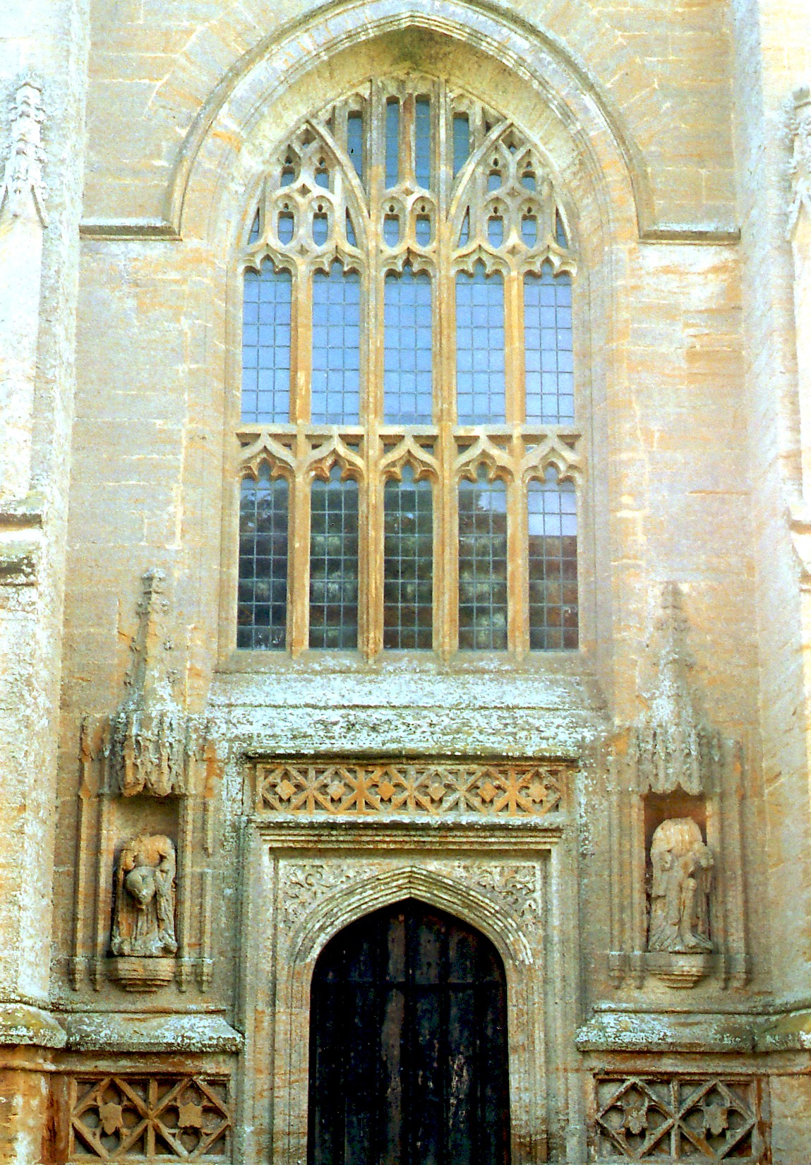 The tower rises in four tall stages divided by bands of blank quatrefoils, including one around the base, to a final band of quatrefoils at the top, followed by surmounting openwork battlements formed of quatrefoils in lozenges below the embrasures and pairs of little trefoil-cusped arches in the merlons. There are pinnacles rising from the mid-points of the walls and groups of pinnacles at the corners, each formed of a large pinnacle in the centre and three small ones set at 120° around it, and the projection of the battlements over the bell-stage is such that the pinnacles at the wall mid-points and the outer pinnacles of the groups of three, appear as if corbelled out beyond the parapet and tied in by braces. (See the photograph, below left, taken from the south.) The set-back buttresses have tall crocketed shafts set diagonally on the three tiers of off-sets and the pair of two-light, transomed bell-openings in each elevation of the bell-stage, have reticulated and Somerset tracery and more shafts between and to either side. The third stage (below the clock) has a four-light transomed opening in each wall, again with Somerset tracery, but here with tracery in the window head featuring subarcuation of the lights in pairs, bisected by through-reticulation, and on either side of these openings, there are canopied niches supported on tall shafts, which retain their original carved figures. The two lower stages of the tower have no windows to the north or south but instead, on the S. side, there is a large canopied niche in the lower stage and two slightly narrower ones on short shafts in the stage above. The W. doorway has continuous mouldings around it and spandrels filled with leaf carving, and the five-light transomed window above has outer lights subarcuated in pairs, a central light separated by strong mullions (mullions that rise all the way from the base to the top of the window arch with no diminution in thickness), and latticed supertransoms above the central light and across the reticulation units beneath the subarcuations above lights 1b-2a and 4b-5a (as seen in the photograph below right, where the lights are numbered from left to right). There are also large niches with crocketed canopies either side of the W. door, containing statues which are now headless, and a frieze of quatrefoils in lozenges, containing Tudor roses above. The date of the tower is probably c. 1500. The stair turret at the northeast angle rises only to the same height as the tower itself.