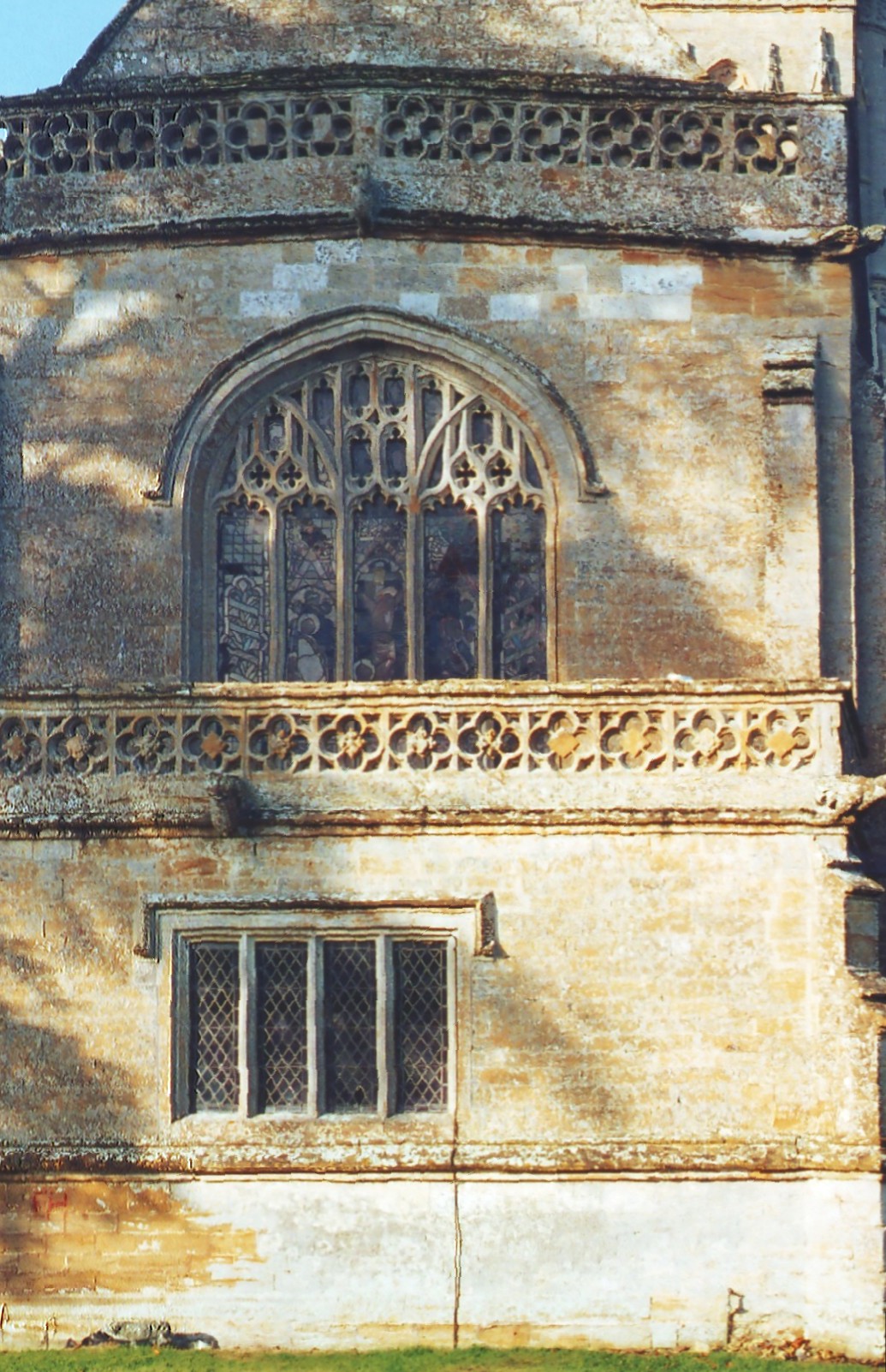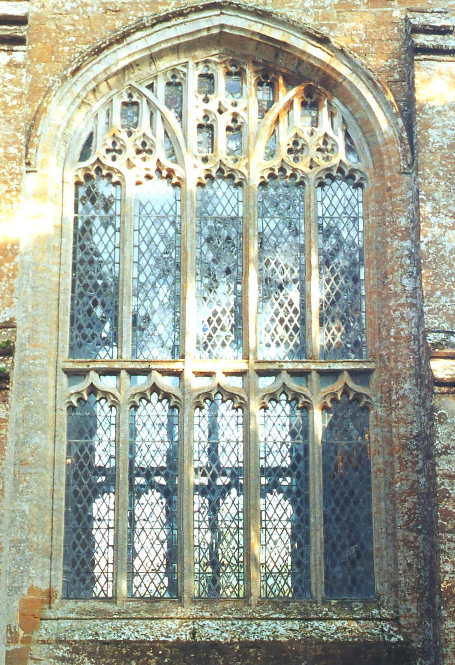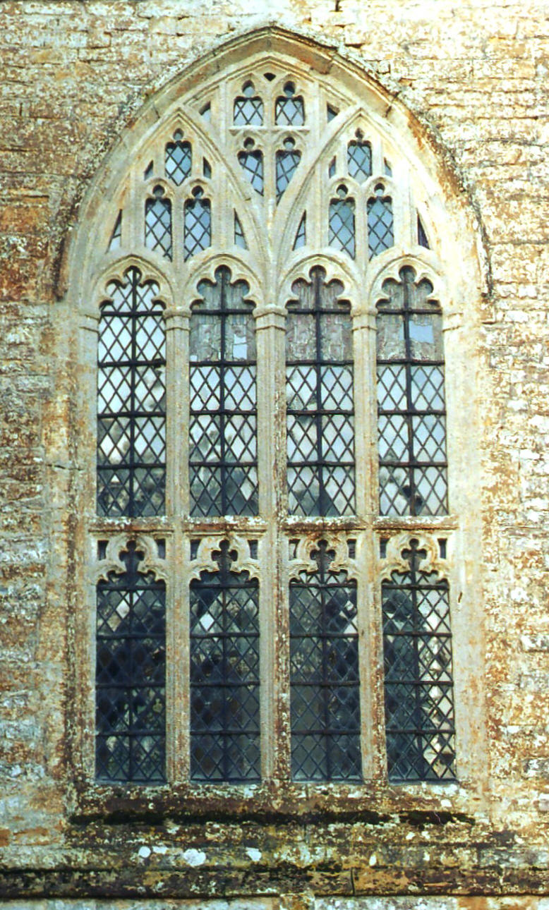 The rest of the building consists of a four-bay aisled nave and a chancel with dissimilar chapels, although the two-bay chapel arcades are identical within. The S. chapel - now the organ chamber - continues the line of the nave S. aisle eastwards, but the N. chapel is cross-gabled and it is this and the chancel that are architecturally most important. Walking clockwise around the church, the N. chapel is a splendid piece of work, distinguished by the wide, embattled rood stair turret to the north, which projects above the adjoining roofs, and by a handsome five-light transomed N. window and a similar four-light E. window (shown below left), each with double-trefoil-cusping of the lights below the transom, subarcuation of the lights in pairs, and through reticulation. (See the entry for Dartington for an explanation of some of these terms.) The transomed five-light N. window to the chancel sanctuary beyond, like the S. window opposite (illustrated below centre), presents another grand design, composed this time of ogee lights below and above the transom, subarcuation of the outer lights in pairs, and original and elaborate subreticulation forming pairs of little quatrefoils above lights 1b & 2a and 4b & 5a, and a latticed supertransom above the central light. The sanctuary E. window (shown below right) is similar but its effect is diminished by the mediaeval vestry in front, notwithstanding that like the chancel above and behind, it has an excellent openwork parapet. The aisle windows are three-light with alternate tracery and two tiers of subreticulation. The embattled S. porch, which was formerly two-storeyed, has a two-light window above an outer doorway with two continuous flat-chamfered mouldings.