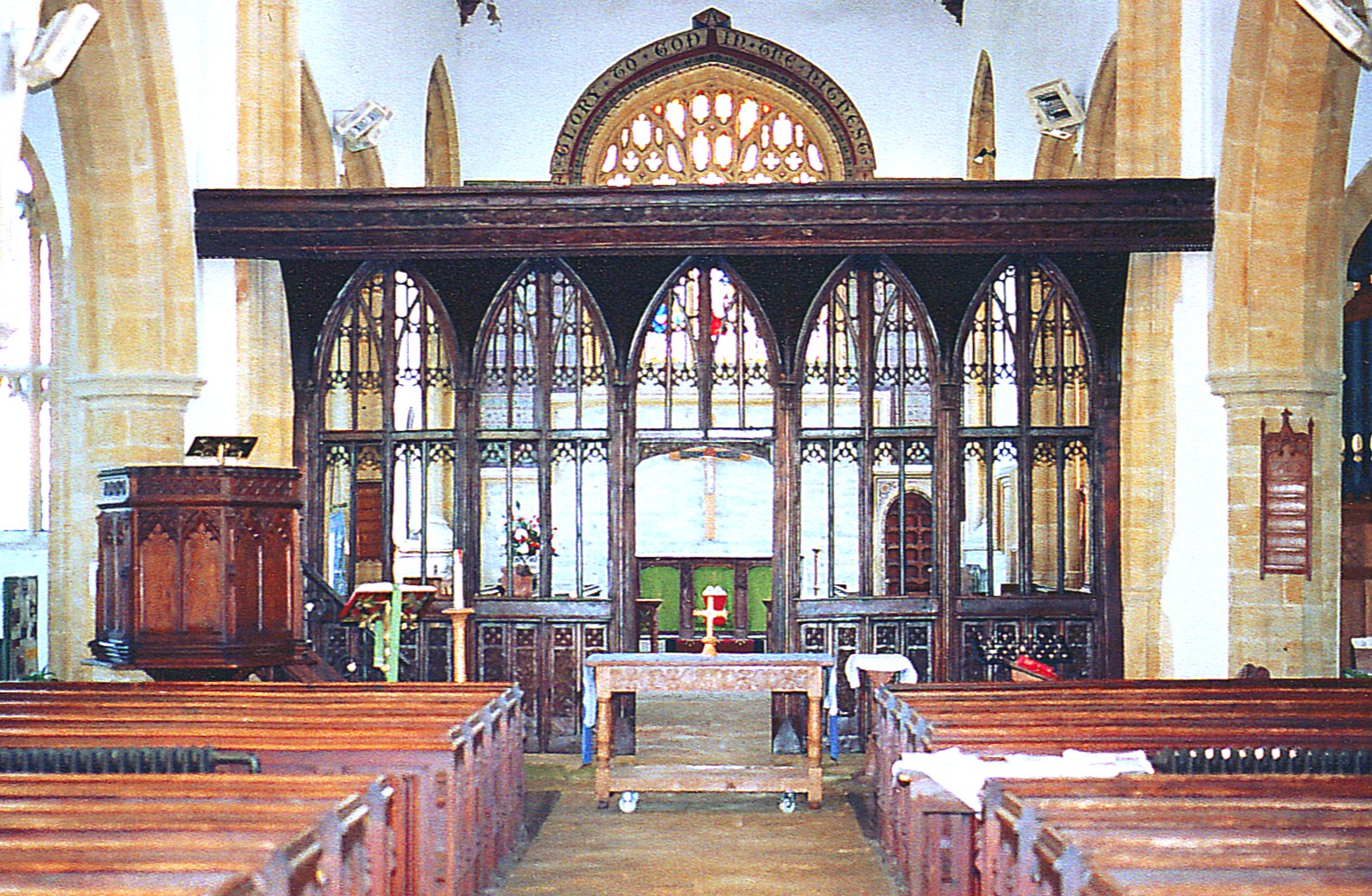 Finally, as in many Somerset churches, the furnishings fail to live up to the splendour of the architecture, but the rood screen is a fine piece of carpentry, formed of five, four-light sections, each with lights subarcuated in pairs and a central mullion reaching up to the apex in between. A transom runs across the whole screen, just below the level of the springing, the dado has tracery that includes quatrefoils set diagonally at the top, and there is a double frieze of leaf carving on the cornice. (See the photograph below.) Almost all the other woodwork in the church appears to date from the restoration of 1840.