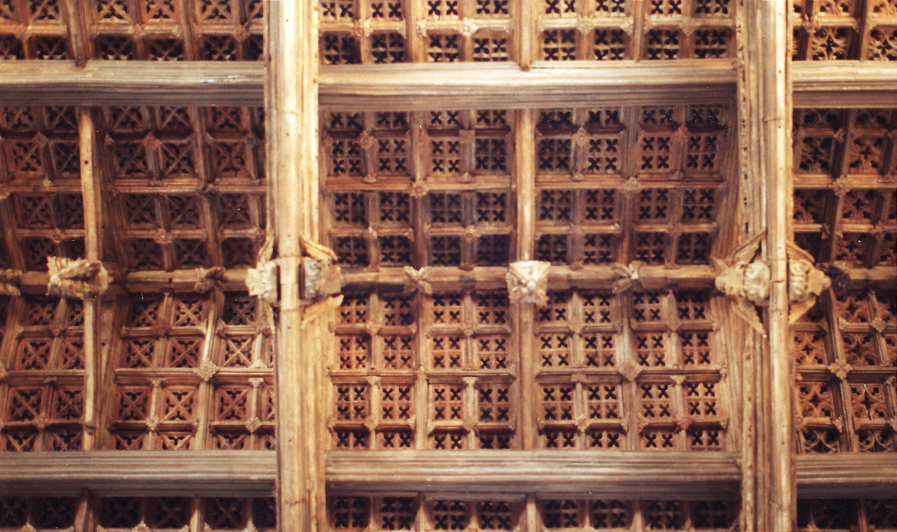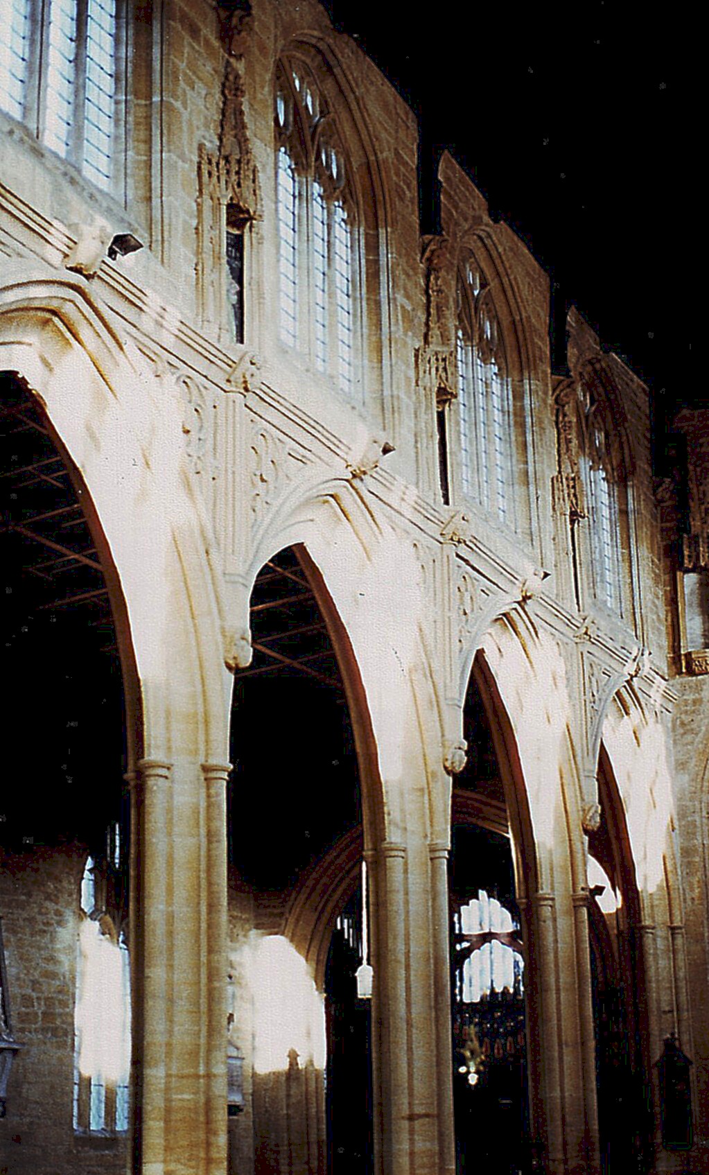 The magnificent tie beam nave roof (a detail of which is shown below) is dated by a shield taken from it and now hung in the N. chapel, which, unusually, records the exact year it was constructed, which was 1513. (Presumably this is also the approximate date of the clerestory.) Carved tie beams support angels each side and there are open quatrefoils in the spandrels between these beams and the principal rafters. The squares formed between the purlins and rafters create forty sections which are subdivided into sixteen smaller squares, and four more which are subdivided into twenty, making seven hundred and twenty in all. These squares feature six varieties of openwork crosses. The effect of the roof and arcades together, therefore, is rich and sumptuous, and the building as a whole, while showing some features that are certainly derivative, has undoubtedly been designed with great skill and confidence.