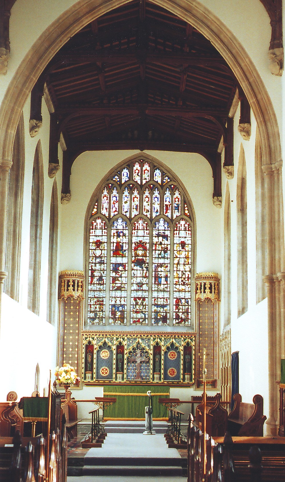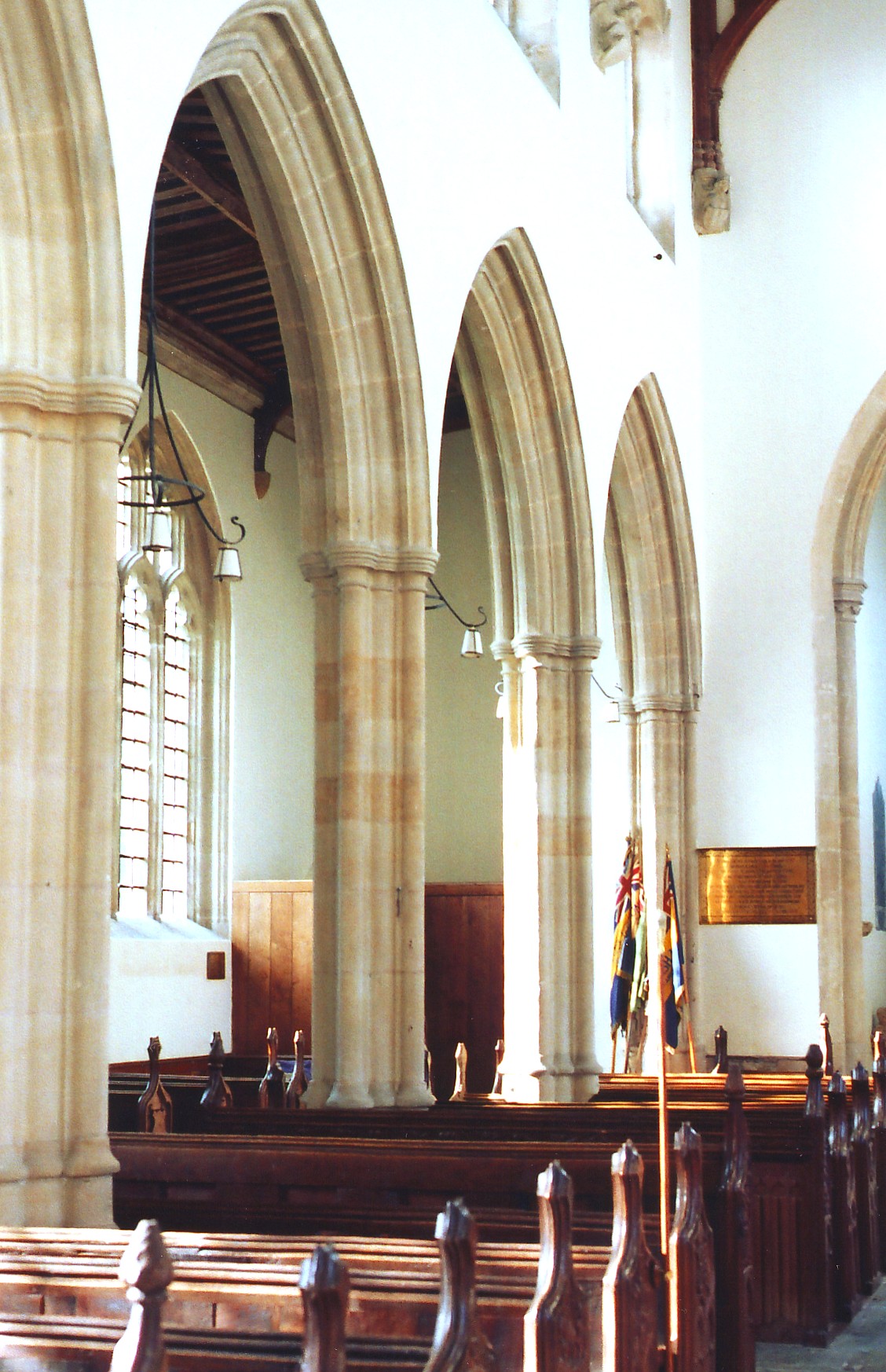 The nave benefits greatly from being glazed with clear glass. The aisle arcades are tall and formed of arches bearing three sunk quadrant mouldings, springing from piers composed of four major and four minor shafts with capitals going all the way round. (See the S. arcade, above right, viewed from the east.) The chancel arch is similar, but so high that it receives two sets of capitals, one at the same height as the capitals of the nave arcades and another further up. The triple sedilia recessed in the chancel S. wall has been renewed but is attractive nonetheless. The font is simple and octagonal, with quatrefoils on the faces of the bowl. There is no rood screen.