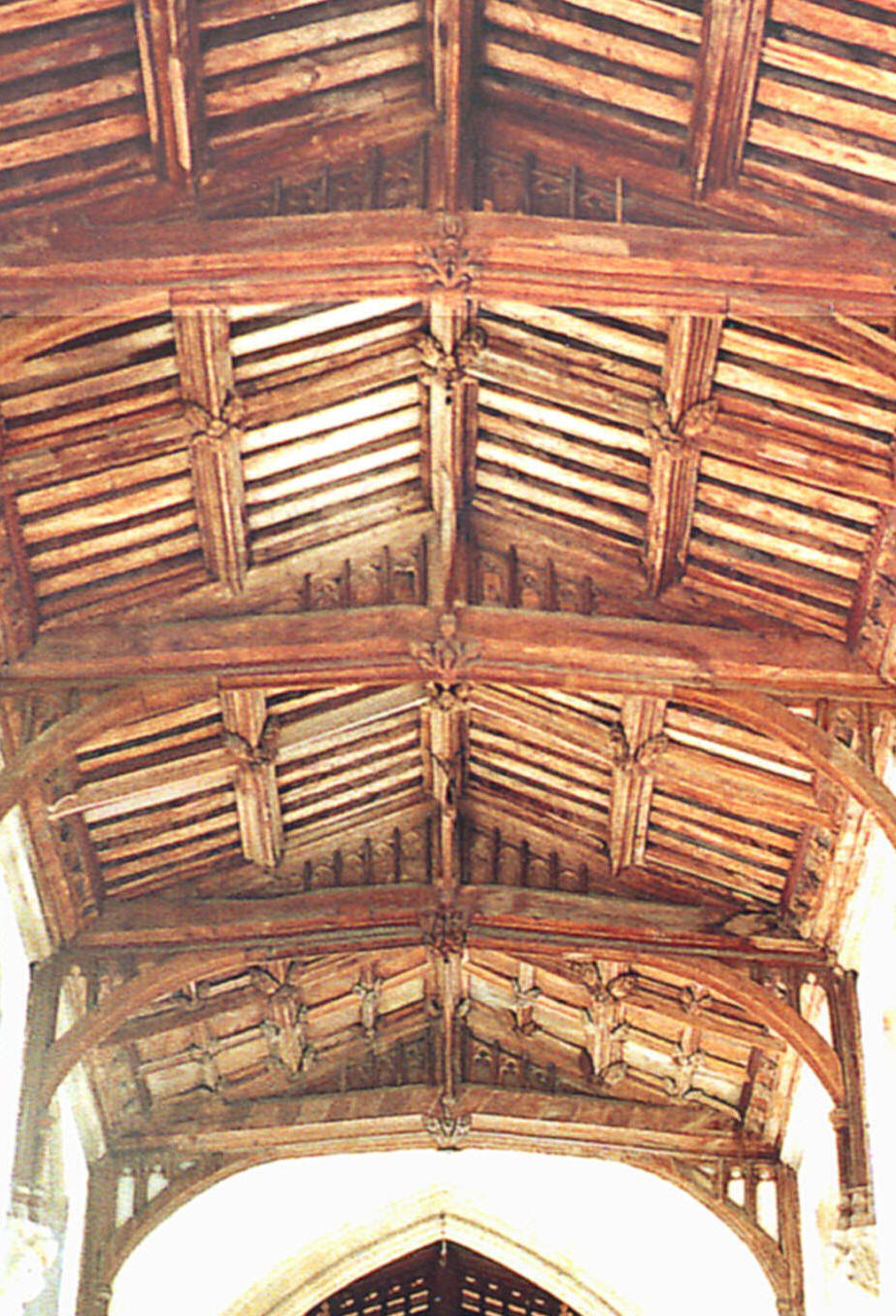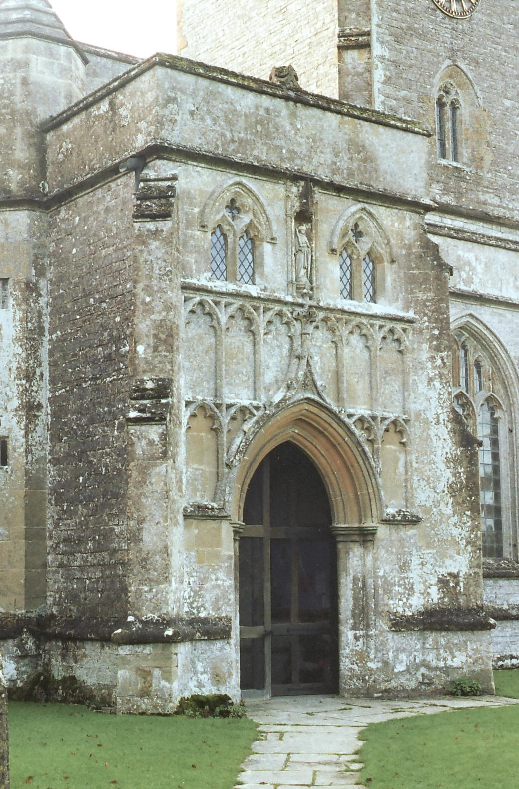 Except in the porches, the chancel E. wall and clerestory, all windows to the early fifteenth century parts of the building are three-light and supermullioned (although the chancel windows are larger), and both the lights and the sublights are everywhere cinquefoil-cusped. The cinquefoil-cusping of sublights (as opposed to trefoil-cusping) is almost always a sign of prestigious work before c. 1460 and can be seen also, for example, at St. John's, Yeovil, in this county (built c. 1380 under the direction of the great William Wynford, master mason of Winchester Cathedral when the nave there was designed and built). As for the use of supermullioned tracery here, that was unusual across much of southwest England from the onset of Perpendicular times, with alternate tracery being preferred instead (see the glossary for an explanation of these terms), and since Kenneth Wickham's attempt to explain the use of supermullioned tracery (The Churches of Somerset, p. 37) as precursory to the later development of the more typical Somerset style, does not really fit the facts of the case, it seems equally or more likely the master mason was not a local man. The five-light E. window to the chancel (shown in the internal photograph, above left), however, is almost an amalgam of the two styles, for while the mullions between the main lights here do continue to the window head (save for a split 'Y's at the top of the lower tier of sublights), they are nevertheless reduced in section, leaving the thicker supermullions rising from the apices of the lights below, to provide the main vertical emphasis. The clerestory windows are four-centred and untraceried, as necessitated by the shorter vertical space available for them, and the two, two-light windows in the upper storey of the diagonally-buttressed porches (as seen in the photograph of the S. porch in the second photograph above left, and of the N. porch in the second photograph above right) have simple reticulated tracery, leaving the crocketed ogee-arched outer doorways, the blank arcading above and to either side, and the niches for statues between the windows, to create the distinctly grand impression that these porches present. They, like the nave and chancel, are also tall and topped with a plain parapet, and inside they are provided with dissimilar lierne vaults.