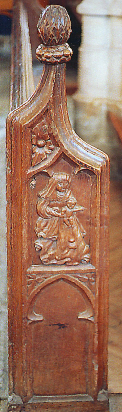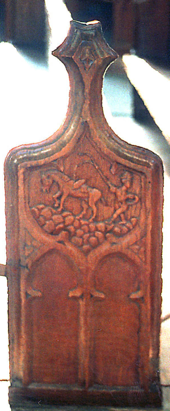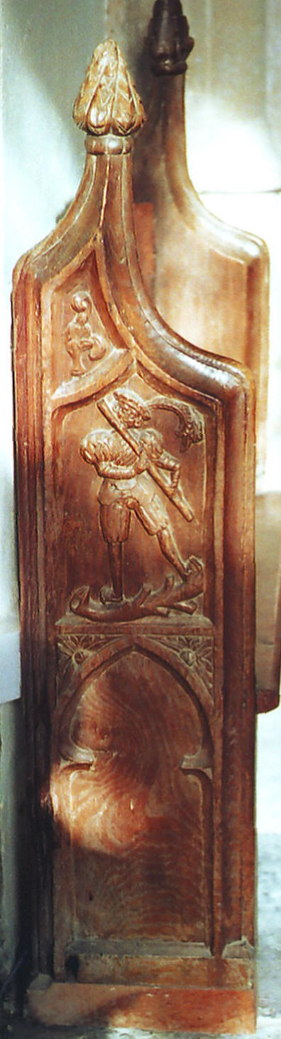 The attractive nave roof (shown above, viewed from the west), which is presumably contemporary with the clerestory, is of a type rather better seen at nearby Queen Camel, though the work there is probably seventy or eighty years later. Here it is low-pitched with king posts rising from cambered tie beams, spandrels above filled with eight openwork trefoil-cusped arches, and carved floral bosses decorating the intersections of the intermediate principal rafters with the halfway purlin and the ridge beam. The bench ends appear to postdate the roof by over a century, to judge from one, dated '1538': They feature a number of rustic scenes, including a flautist, a man following a horse, and a cross-looking woman carrying a child (illustrated below, from left to right).