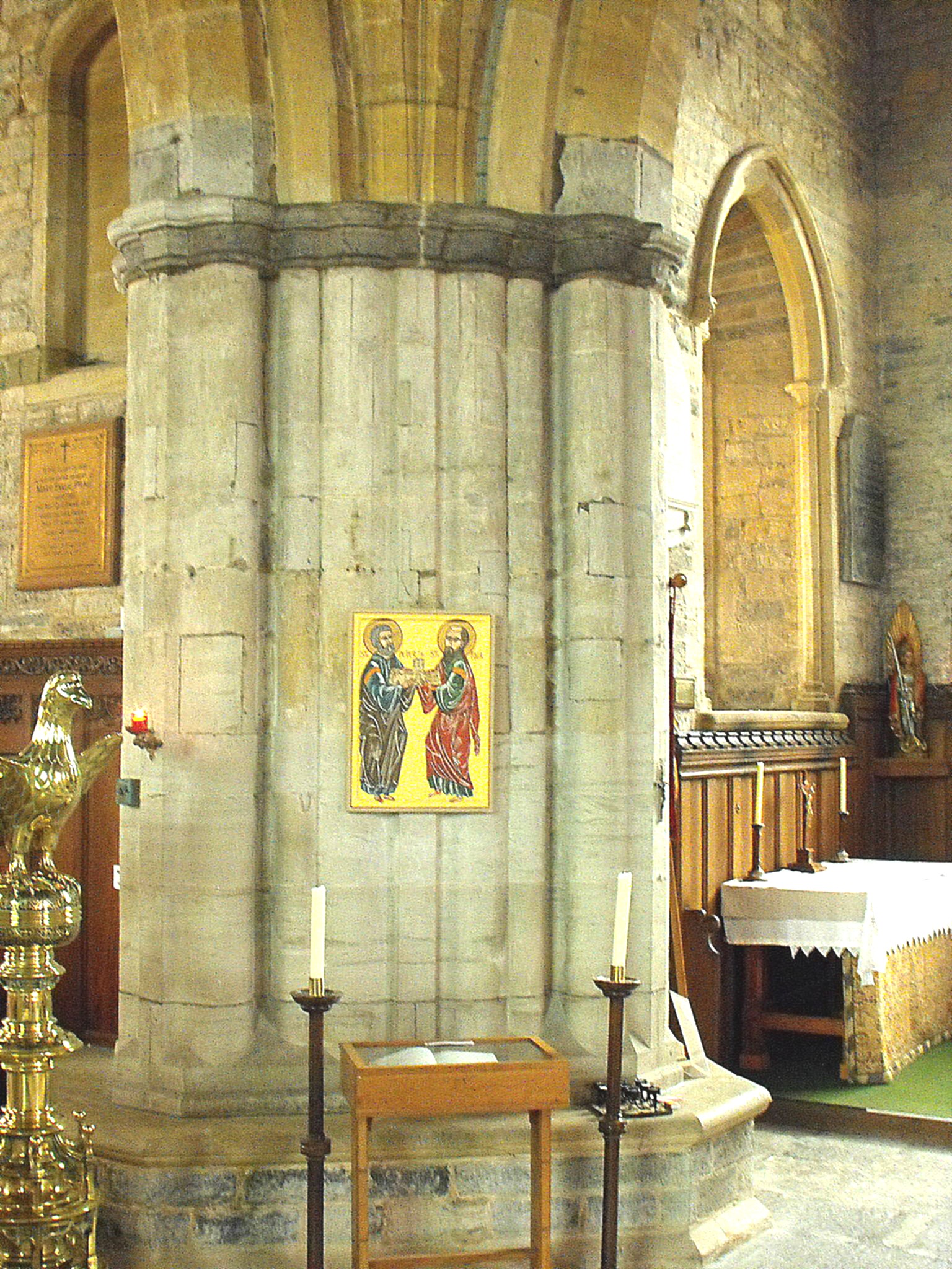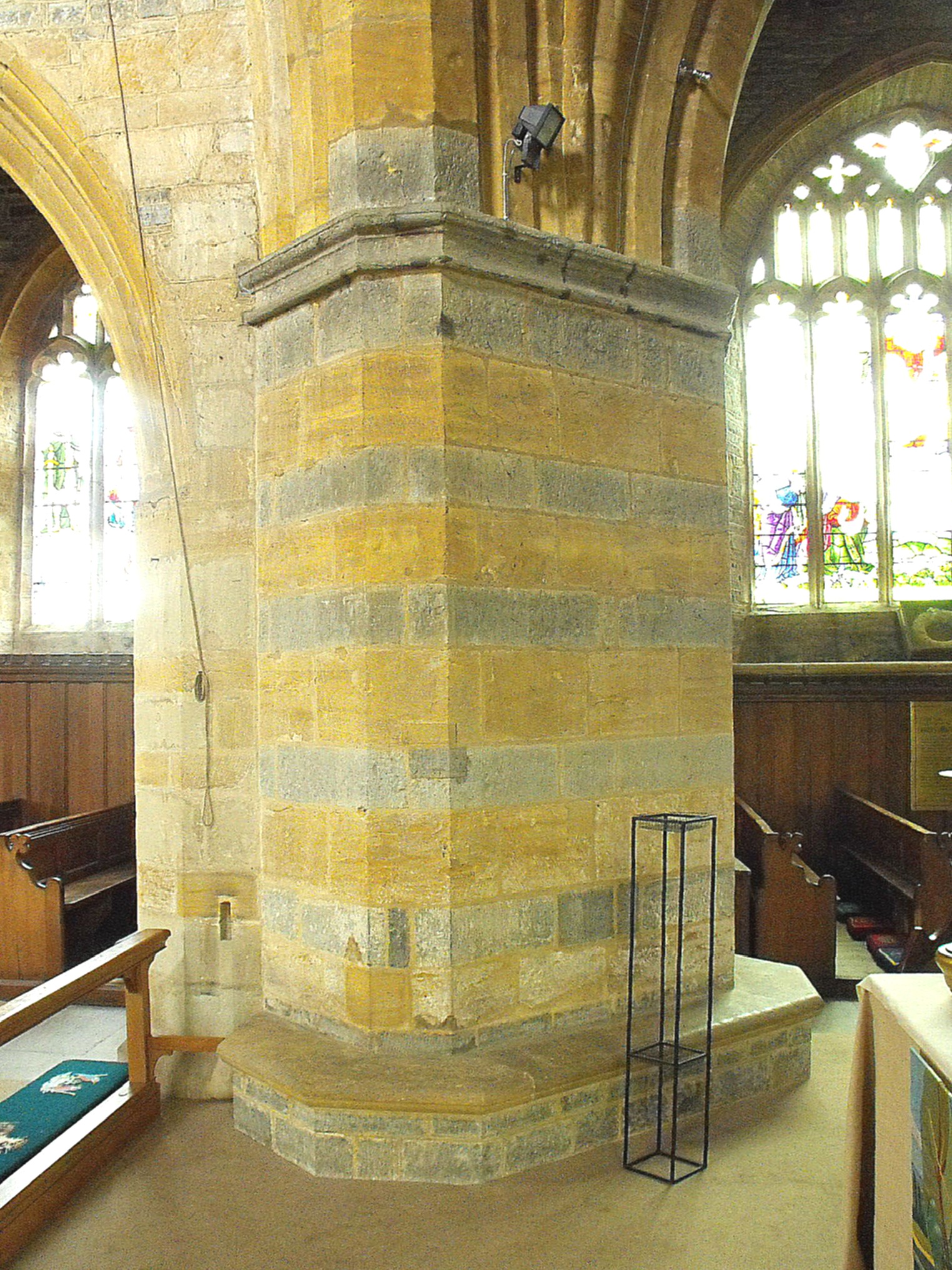 The great rebuilding of the church was probably carried out about a century later and to have been defined by the decision to adopt a cruciform plan. The surviving work from this period includes almost the entire crossing tower, from the crossing arches within to the trefoil-cusped Y-traceried bell-openings of c. 1300 above, the S. transept, and the arches from the transepts to the aisles. The crossing arches are all triple-flat-chamfered but some of the piers that support them seem to have been remodelled for whereas those to the southwest and northwest consist solely of massive, diagonally-cut supports (see the northwest pier, illustrated below left), the southeast and northeast piers assume a complex profile formed of circular shafts, hollows and ogee mouldings (as shown by the southeast pier, below right). Any attempt to date this work precisely is inevitably speculative but the latter would probably fit the late fourteenth century. The diagonally-facing tower stair with little gabled roof, in the re-entrant between the S. transept and chancel, has clearly been remodelled, but the narrow lancet in the southeast wall may be essentially original.