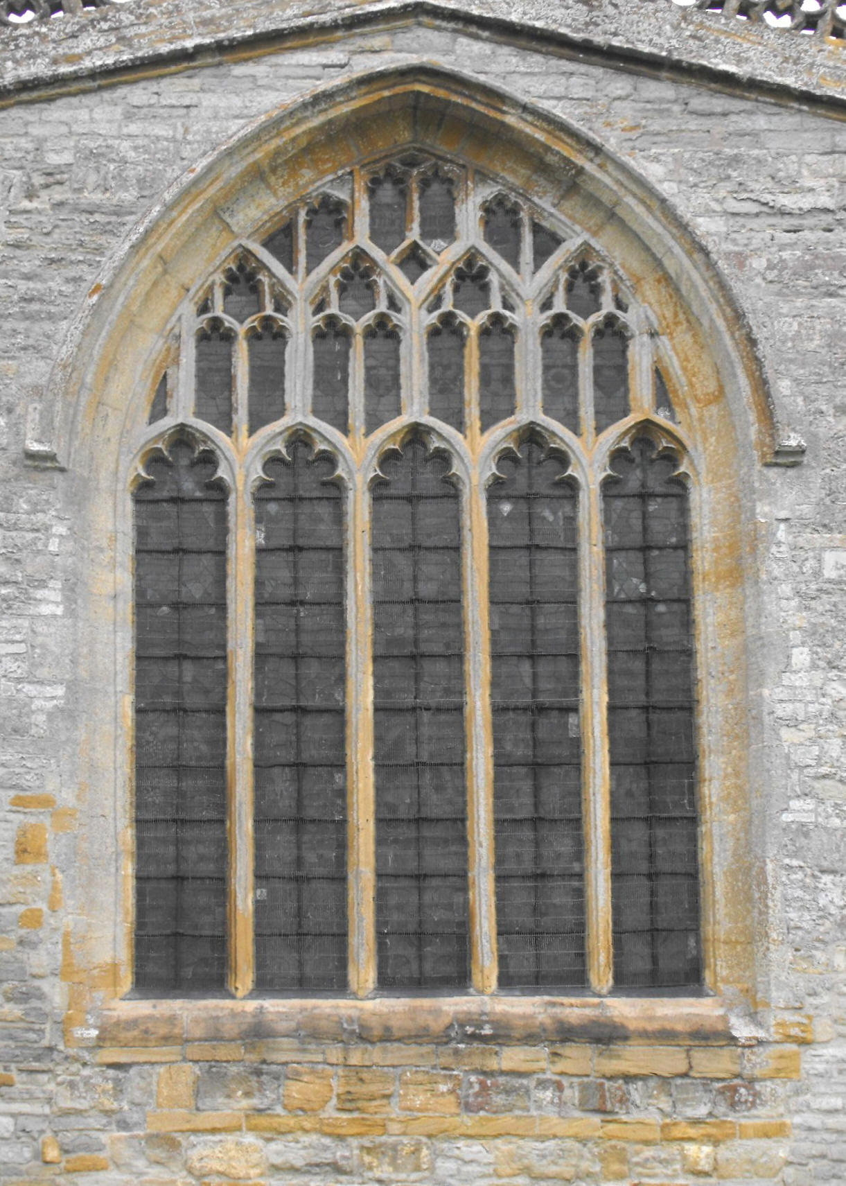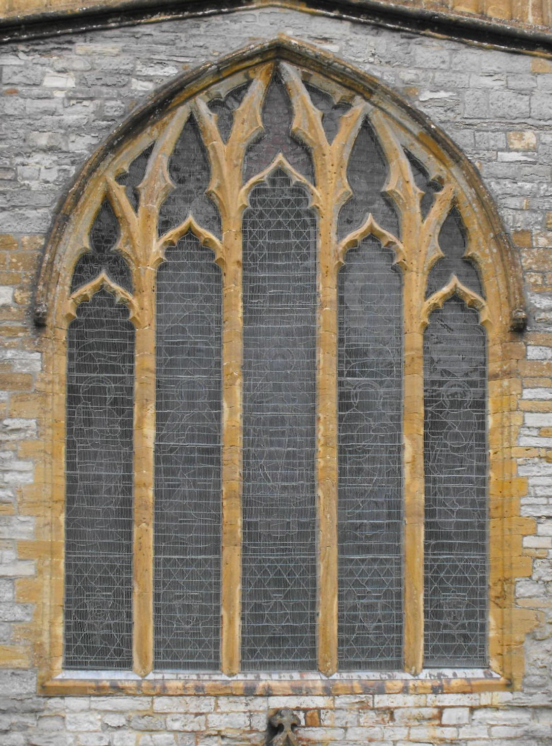 The double-flat-chamfered arches from the transepts to the N. and S. aisles, die into the jambs in the former case and are supported on semi-polygonal responds in the latter. The W. crossing arch displays the remains of a gable line on its west face, betraying the existence of the former, steeply-pitched nave roof, and the continuation of this to its apex can also be seen above the nave roof, externally from the southwest (as may be seen in the photograph at the top of the page), from where a similar gable line is visible above the S. transept. Inside the church, however, if one allows one's eye to be led from the base of the gable line above the W. crossing arch, westwards in a line along the N. aisle wall, one encounters just below, three fragments of what must once have been clerestory windows, with ogee lights and, in the westernmost case, fully developed reticulated tracery, which show that by the time the rebuilding had proceeded this far west, the date can scarcely have preceded 1315. The S. window to the S. transept might conceivably just fit that (see the second photograph above, on the right): the five lancet lights provide space for trilobes above cinquefoil-cusped, ogee-pointed secondary arcuations below.