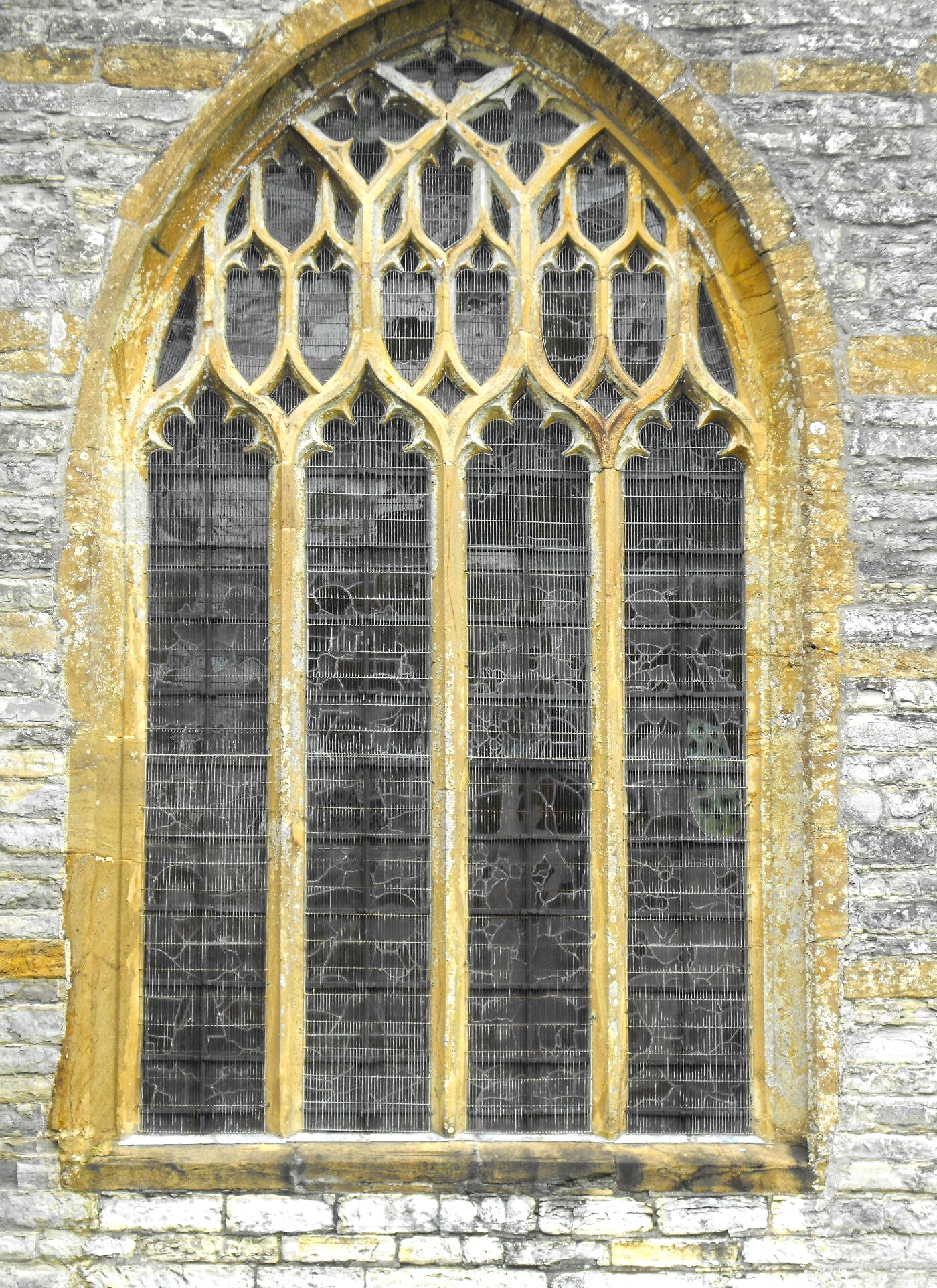 Remaining windows are four-light in the N. and S. walls of the chancel (of which there are two to the south and one to the north, west of the Victorian vestry), with ogee lights, alternate tracery filled with two tiers of subreticulation rising from inverted split-'Y's, and cusped intersections in the head. (See the easternmost S. window, below left.) The chancel E. window (below centre) is superficially similar yet different in almost every particular, surely indicating it is the work of a different hand: the lights are two-centred, the subreticulation rises from undivided supermullions, and the head of the window is occupied by what is, in effect, the lower half of a second row of like tracery. albeit this time with an inverted split-Y in the centre. Further variations may be found in the N. transept: the four-light E. window has alternate tracery filled with split-'Y's the right way up, and the five-light N. window, which also has alternate tracery filled containing split-'Y's, is, in addition, divided into two by rather incompetently-devised subarcuations rising from the apex of the central light, replete with a quatrefoil in the head of each and a large dagger in the central apex. The nave W. window (below right) resembles the chancel E. window except in having ogee lights and lacking the inverted split-'Y' at the top. Either these windows are all somewhat different in date, or else they are the product of a team of masons working alongside one another without close co-ordination.