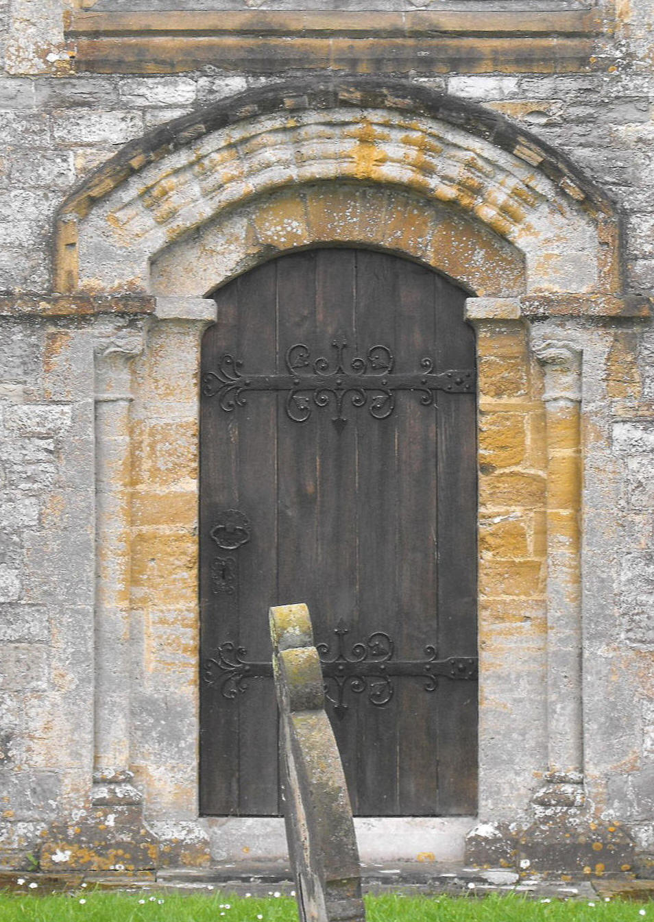 The core of the present building can be ascribed to the late thirteenth or, perhaps, very early fourteenth century, but that a Norman church stood here previously appears to be attested by the N. doorway (illustrated below left), now set in the partially reconstructed N. aisle: the segmental arch is decorated with horizontal chevron, and there is an order of shafts below the abaci, with capitals reminiscent of water leaf. The date seems unlikely to be much before c. 1190.