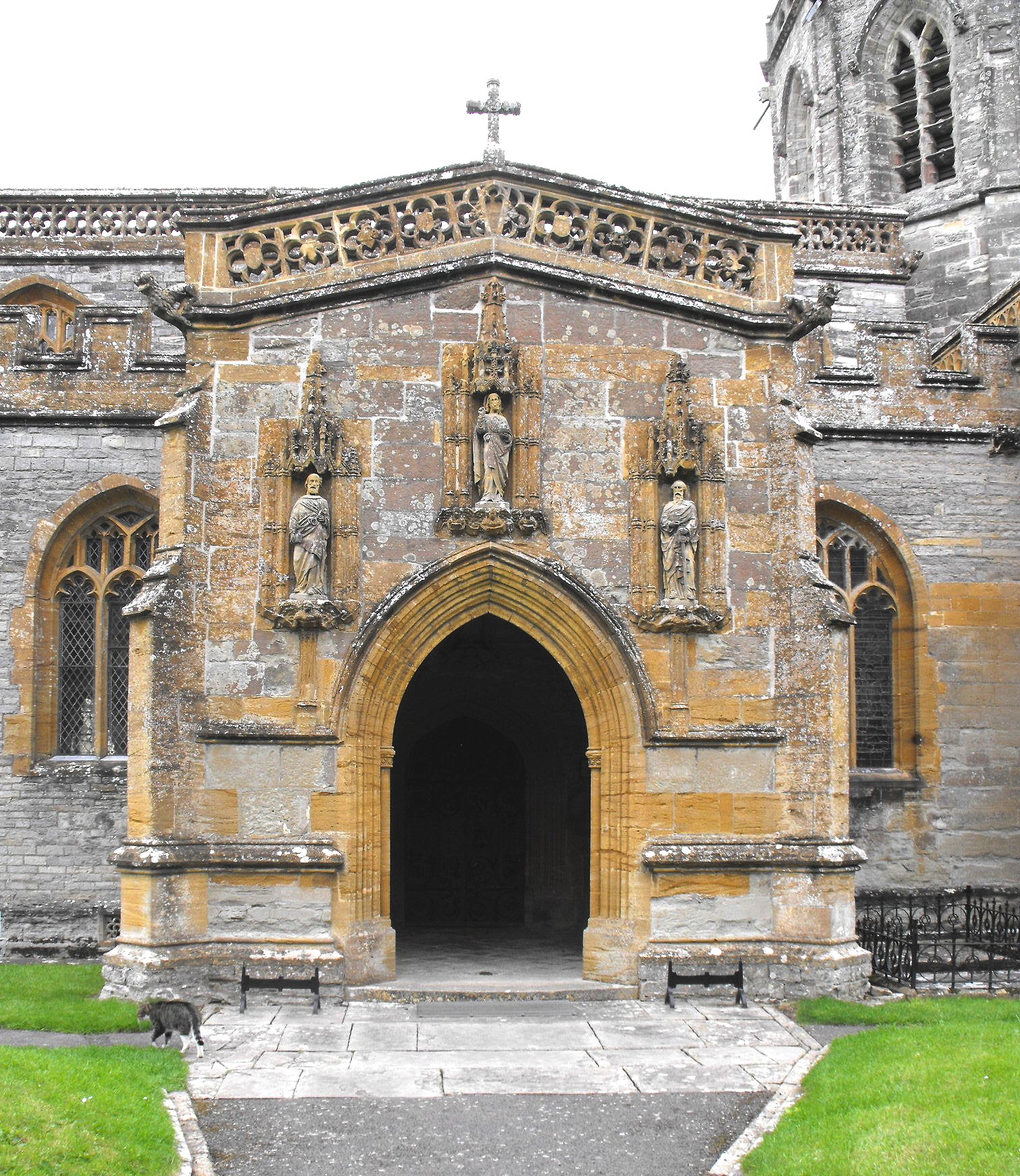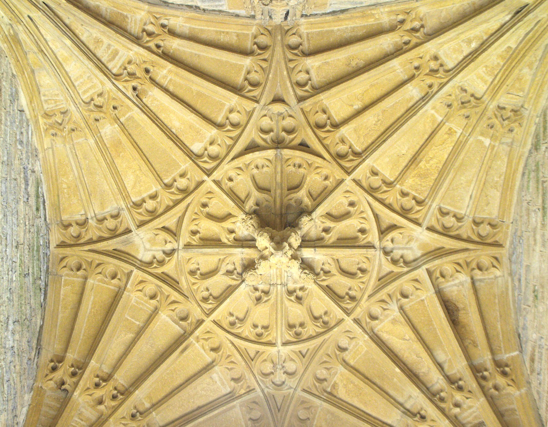 Perhaps the fine S. porch is the most distinguished achievement of the Perpendicular period. Above the outer doorway with its typically complex profile formed of waves and a little inner hollow chamfer rising from an order of shafts with capitals decorated with Tudor flower, three elaborate canopied niches with buttresses terminating in crocketed pinnacles at the sides, contain Victorian statuettes, presumably depicting SS. Peter and Paul, flanking Christ in the centre. (See the photograph, below left.) An excellent fan vault within (shown below right) has a pendant hanging from the central circle, and a statue of the Virgin and Child stands on an angel corbel above the inner door, surmounted by a crocketed canopy. The openwork parapet around the porch, composed of shields in quatrefoils in squares, is probably contemporary (late fifteenth century?) and of a piece with the similar parapet which has been added to the nave and chancel. The S. transept parapet is decorated with blank trefoiled arches separated by mullions. The aisles and N. transept are embattled and lit by three-light windows with standard (for this area) alternate tracery and subreticulation.