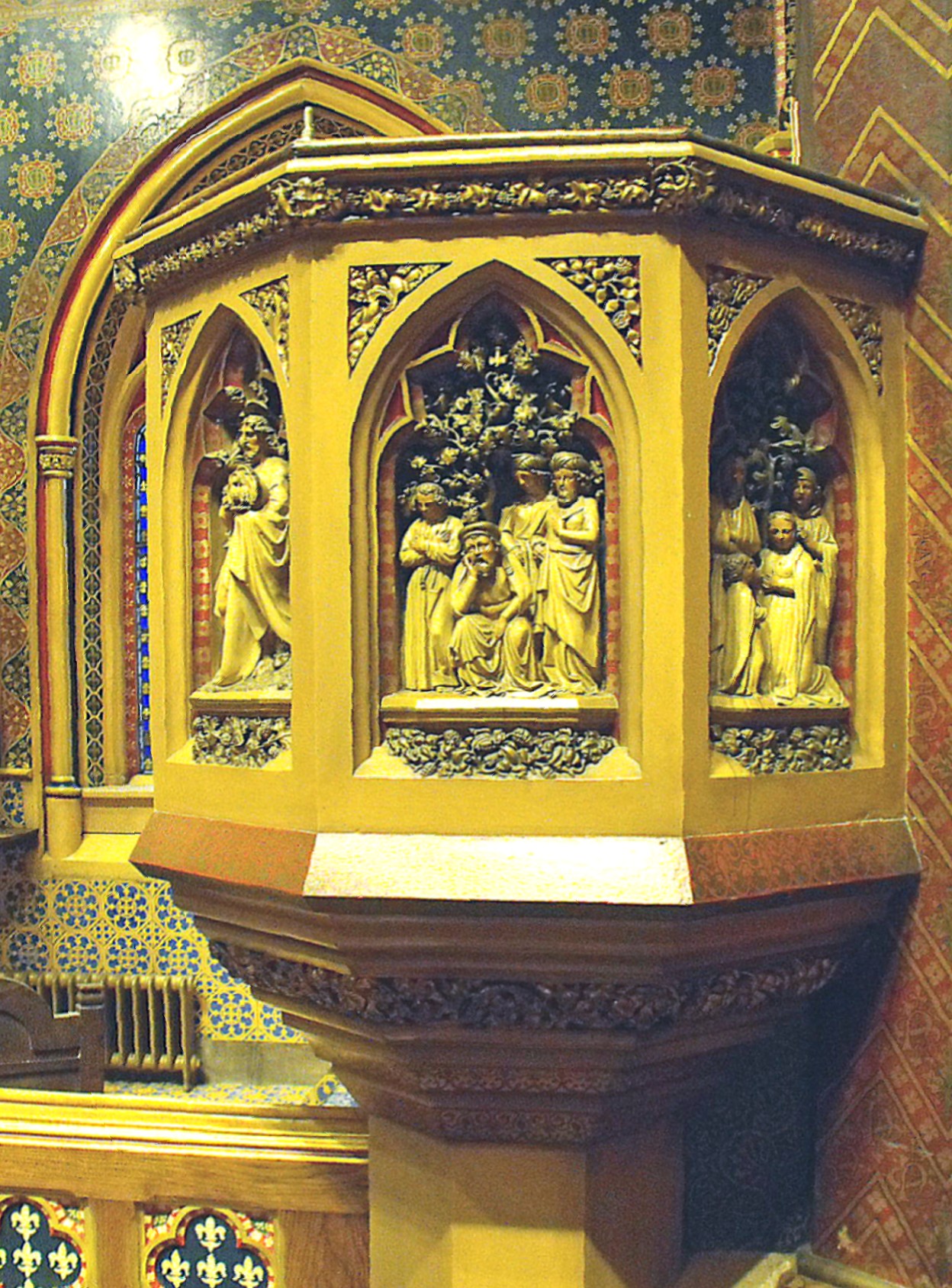 Roddis carved the pulpit (below left), 'out of a single block of stone' (Michael Fisher, St. Giles' Church, Cheadle, Stoke-on-Trent, Urban Vision, 2012, p. 11); remarkably, since it stands between the nave and the Lady Chapel, the north face of the drum was also employed to house a piscina and credence shelf for use in the chapel. However, Roddis was not responsible for the astonishing triple sedilia and adjoining piscina in the S. wall of the chancel (below left), nor for the Easter sepulchre opposite (below right), which are the work of George Myers (1803-75), 'who undertook so much of Pugin's building and carving elsewhere' (Michael Fisher, Pugin-land, Stafford, M.J. Fisher, 2002, p. 97).