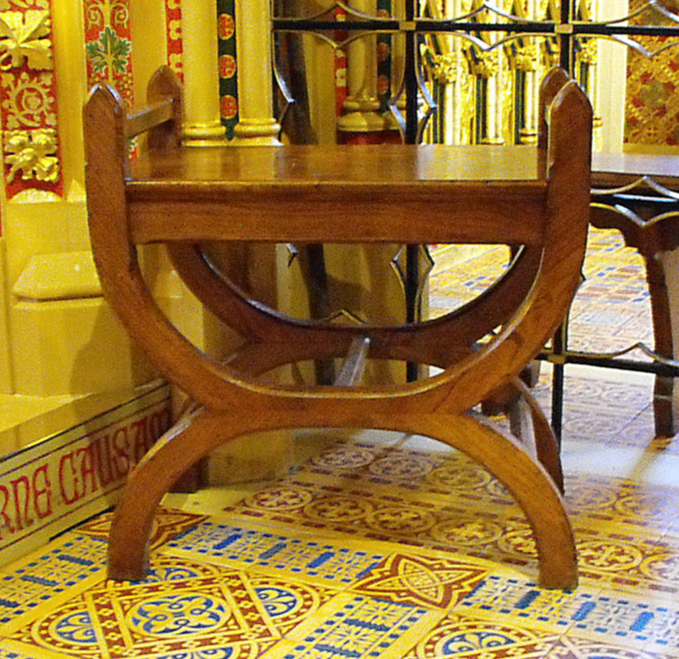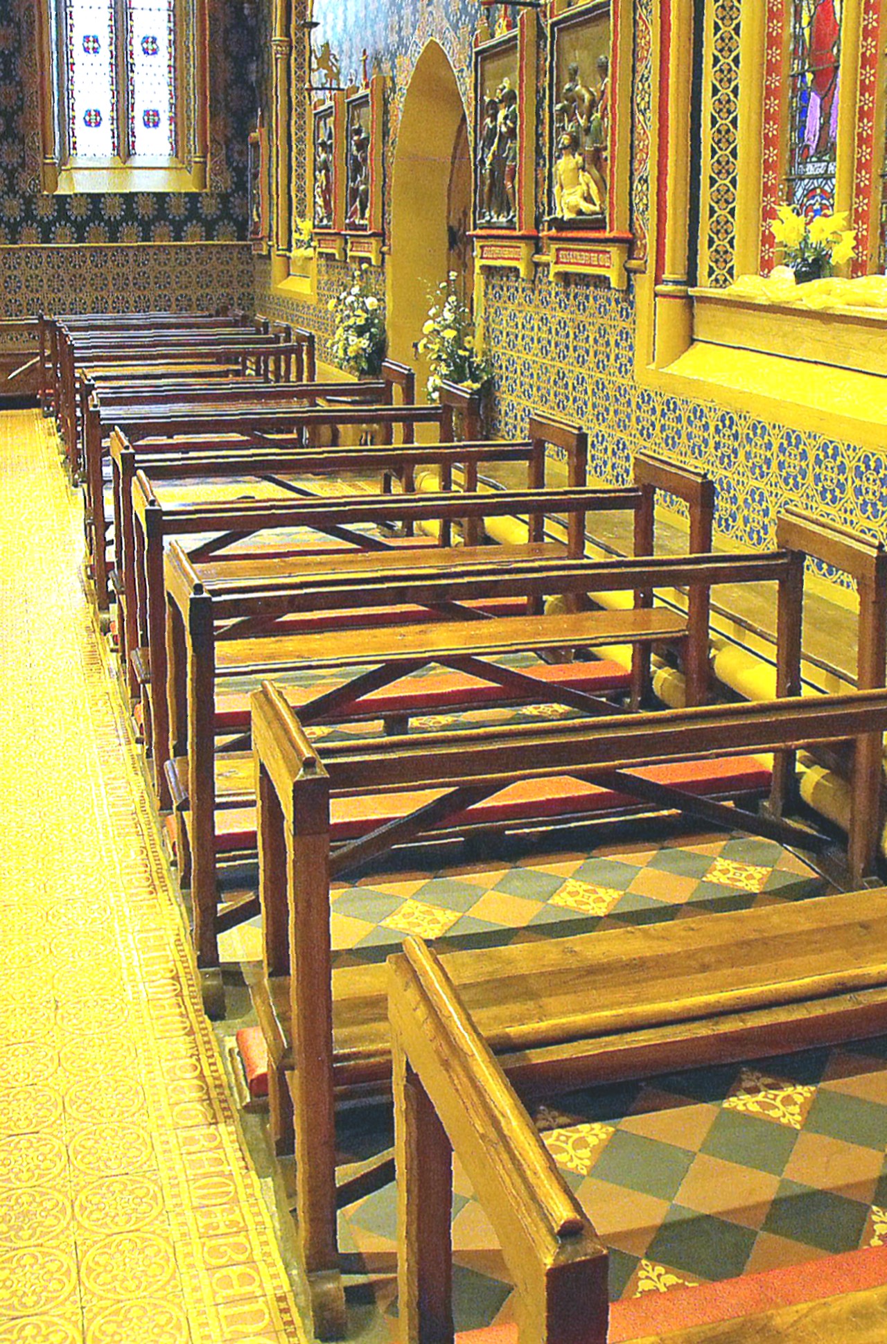 Yet all these items had first to be designed by Pugin of course, and this herculean task came on top of his even greater labours for Charles Barry, for whom he was designing all the significant furnishings and fittings for the new Houses of Parliament simultaneously under construction, besides the various other commissions which came his way from time to time. Here at Cheadle alone, Pugin personally designed the stained glass in all the windows (which was manufactured by William Wailes of Newcastle-upon-Tyne) and the encaustic tiling patterns on the floor. He also designed the iron gates and screens, the paintwork and stencilling patterns everywhere, and all the woodwork in the nave and aisles (see the N. aisle benches, below left, and the little table, below right). No detail was beneath his notice. Little wonder he burnt himself out at the age of just forty.