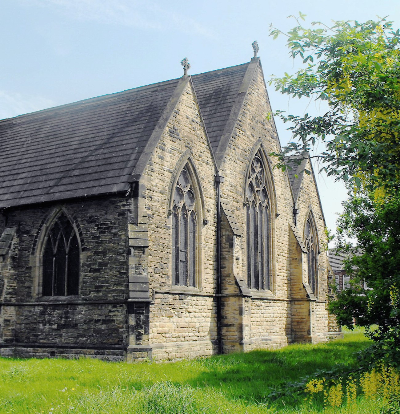Windows everywhere have geometrical tracery, as is usual at this period, and was usual for Mallinson and Healey in the mid-1850s, and the aisle windows adopt two forms used alternately, both three-light but one with two daggers and a pointed quatrefoil in the head and the other with two regular quatrefoils and a pointed quatrefoil. The N. aisle W. window is hidden to internal view behind the organ but from the outside can be seen to be the same as its three-light southern counterpart with two trefoils and an encircled sexfoil in the head. The four-light nave W. window has quatrefoils above the outer lights and a wheel of four trilobes in the apex, while at the other end of the church, the five-light chancel E. window has outer lights subarcuated in pairs above cinquefoils and three quatrefoils in a circle above and between.