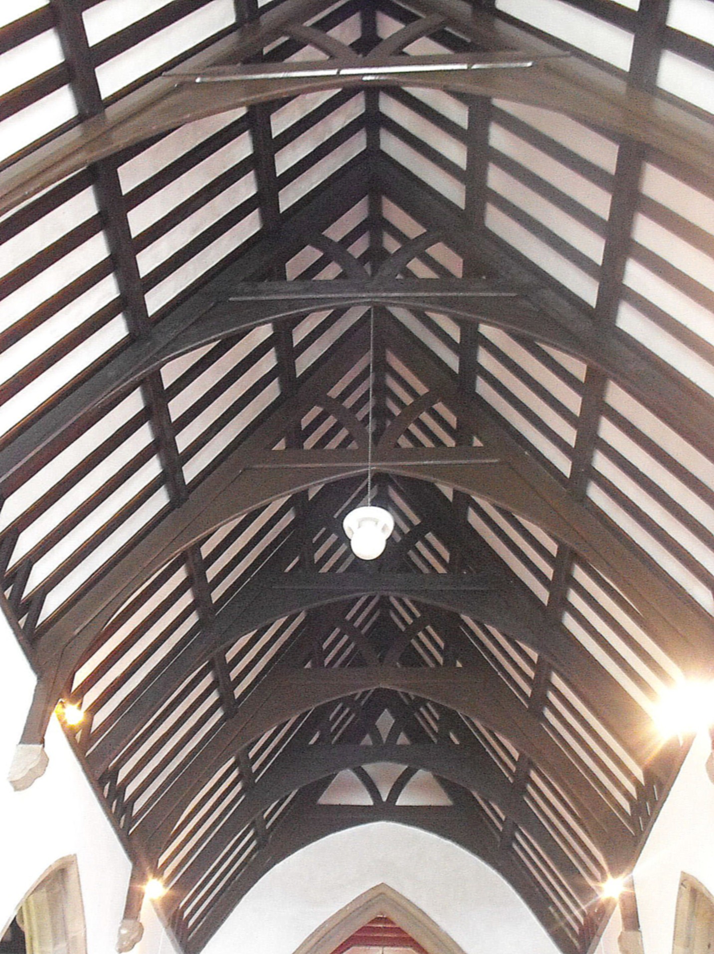 In its essentials the partners’ preferred roof frame comprised a pair of purlins, ⅓ and ⅔ of the distance up the pitch, and arch-braced collars joining the principal rafters, yet instead of connecting the collars to the joints between the principal rafters and upper purlins (or even the principal rafters and lower purlins), the collars typically met the rafters halfway up the pitch, the reason for which may have been the simplification of the carpentry since this avoided the complicated three-way meeting of collar, purlin and principal rafter and allowed the collars to be tenoned straightforwardly into the rafters. The nave roofs at St. John the Baptist’s, Clayton, Holy Trinity, Hepworth, and here at St. Paul’s, Thornaby-on-Tees (as shown in the photograph, left) are all examples of this whereas, conversely, the collars do indeed run between the upper purlins at Mappleton and Girlington, and between the lower purlins at Wyke and Mytholmroyd. Nevertheless, in all these cases, the sole remaining component of the roof couple generally consists of a pair of 'V'-struts rising from the collar, and that can be seen to be the case here.
