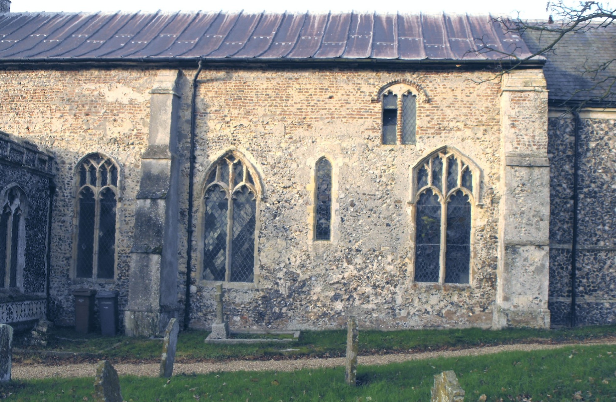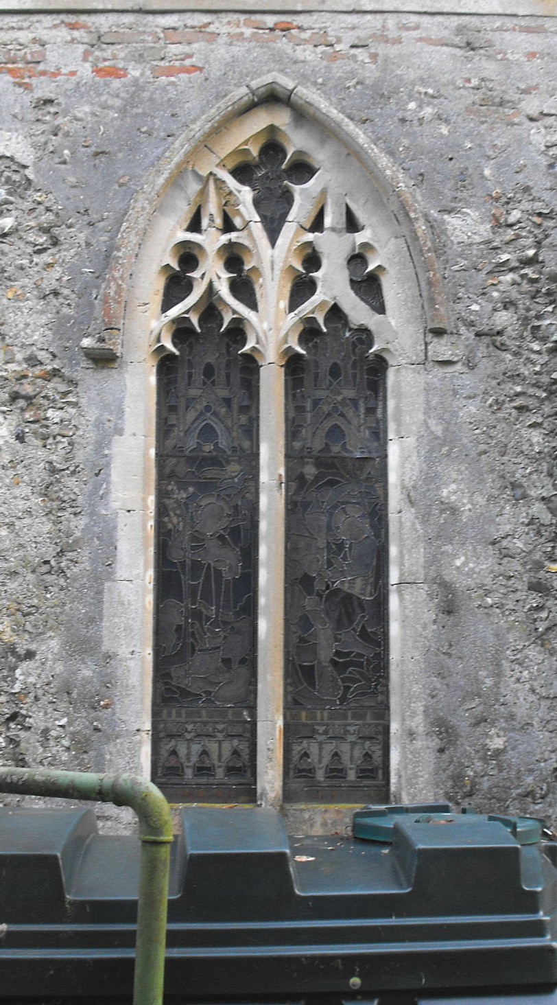 This is a church of simple plan but considerable interest. It consists of just a chancel, a nave with a S. porch, and an unbuttressed W. tower, but even a cursory external circuit reveals clear evidence of many construction phases. The earliest work is Norman, as witnessed by the nook-shafts at the southwest and northwest angles of the nave and the very narrow round-headed windows three-fifths of the way up the tower. Thirteenth century features are more obvious, however, and include a lancet on either side of the nave and the Y-traceried bell-openings and W. window to the tower, the first, perhaps, from the early part of the century, and the others, later on. The Decorated period is represented by a north window to the nave, with elaborate tracery which includes encircled trefoils in the heads of the two subarcuated lights, and an only slightly simpler window, re-used in the N. wall of the Victorian chancel (illustrated below left). Windows elsewhere in the nave include a three-light one with dropped supermullioned tracery, split-'Y's and strong mullions beneath a four-centred arch, also in the N. wall, three two-light Perpendicular windows, all different from one another, in the S. wall, and a two-light window in Tudor brick, high up in each, that were obviously inserted to throw light on the rood. (See the photograph of the nave S. wall below right.) It seems probable that every one of these windows is the work of a different date and hand, and the proud fifteenth century porch, ascribed by Pevsner to c. 1482 (Nikolaus Pevsner & James Bettley, The Buildings of England: Suffolk East, New Haven & London, Yale University Press, 2015, p. 94), seems likely to have been designed by a different mason again. Faced entirely in knapped flint and, to the south, flint flushwork set out in two tiers of narrow panels beneath battlements with more flint panels in the merlons and stone shields on the embrasures, it is entered through a doorway decorated with worn carvings of St. George and the dragon in the spandrels and a canopied niche for a statuette immediately above the apex.
