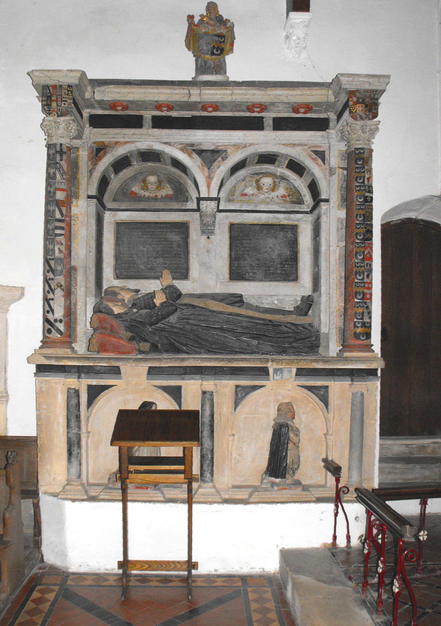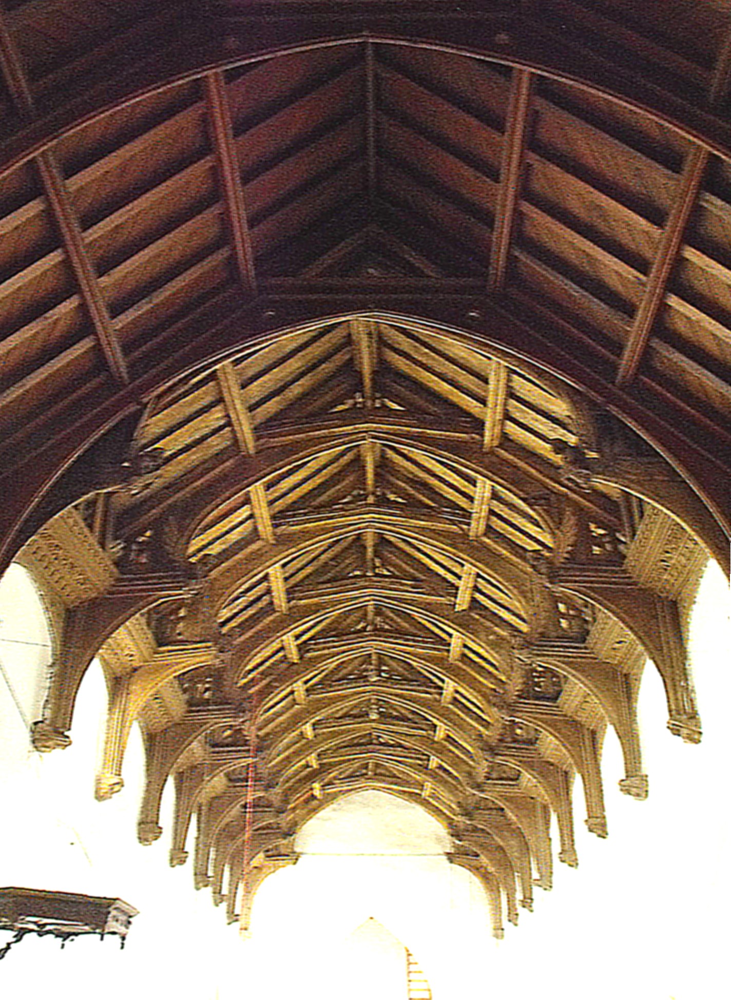 So much for the exterior... Inside the church, since there is no chancel arch and only a simple thirteenth century arch to the tower bearing a single flat chamfer, the building is dominated by three features in particular - the single hammerbeam nave roof, the font, and the very large monument against the N. wall of the sanctuary. The nave roof (shown below left) is framed in eight bays, with intricately carved wall plates, traceried spandrels between the principal rafters and hammerposts, and nicely moulded purlins and arched braces; the angels on the ends of the hammerbeams are, inevitably, 'modern' replacements (Pevsner says 'of 1900'). The monument against the sanctuary N. wall commemorates William Cotton (d. 1616) and his wife (d. 1621), who lie in effigy on a tomb-chest, she in front of and a little lower than him, beneath an architectural frame supported by two Corinthian columns elaborately painted with heraldry running all the way up, proclaiming their pedigree, while on the tomb-chest itself, their two adult children are depicted kneeling solemnly in prayer.