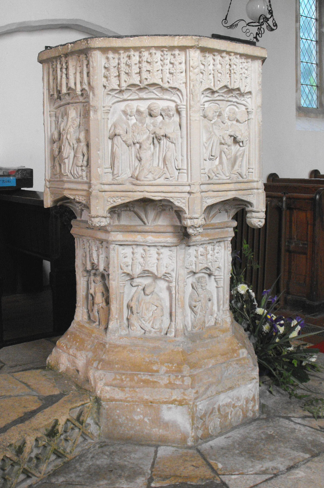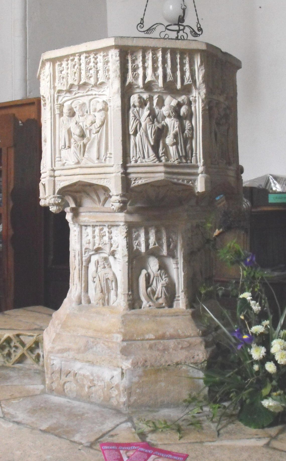 Finally, the exceptionally well-preserved font, carved in clunch, is one of a number in Suffolk featuring the Seven Sacraments (Baptism, Eucharist, Penance, Confirmation, Marriage, Ordination and Extreme Unction) on the faces of the bowl, together, in this case, with the Baptism of Christ. The figure scenes are set out beneath slight canopies topped by crocketed pinnacles, mock lierne vaulting decorates the overhang of the bowl around the stem, and the stem is carved with figures of the prophets holding scrolls in more shallow recesses with more pinnacles above.