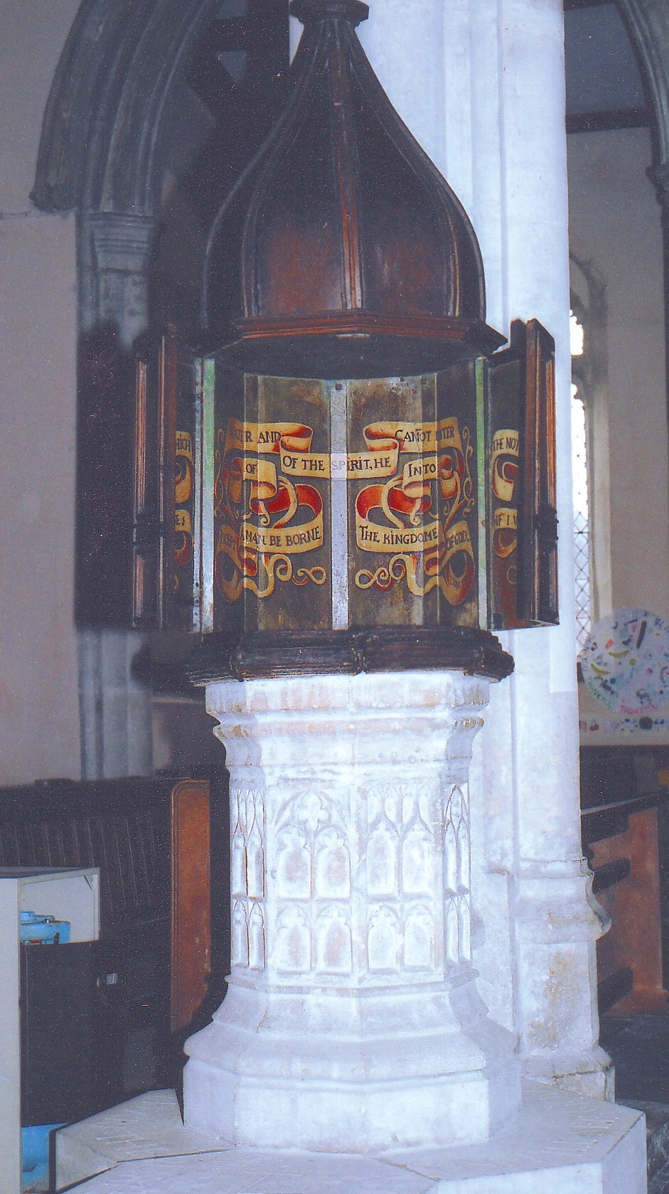 However, remaining with the present building, the church contains few furnishings of note but one important exception is the ogee-domed font cover (illustrated right), which is a seventeenth century piece with folding doors, panelled outside and painted within. The font itself now consists of a wooden bowl set on the original Perpendicular stone stem, which has blank tracery on the sides. The church contains no monuments of sculptural significance but a wall tablet in the S. chapel that will appeal to lovers of curiosities, commemorates one Elizabeth Hyam 'Fourth time Widow', who was 'hastened to her End [by a] Fall... on the 4th May 1748 in her 113th year'.